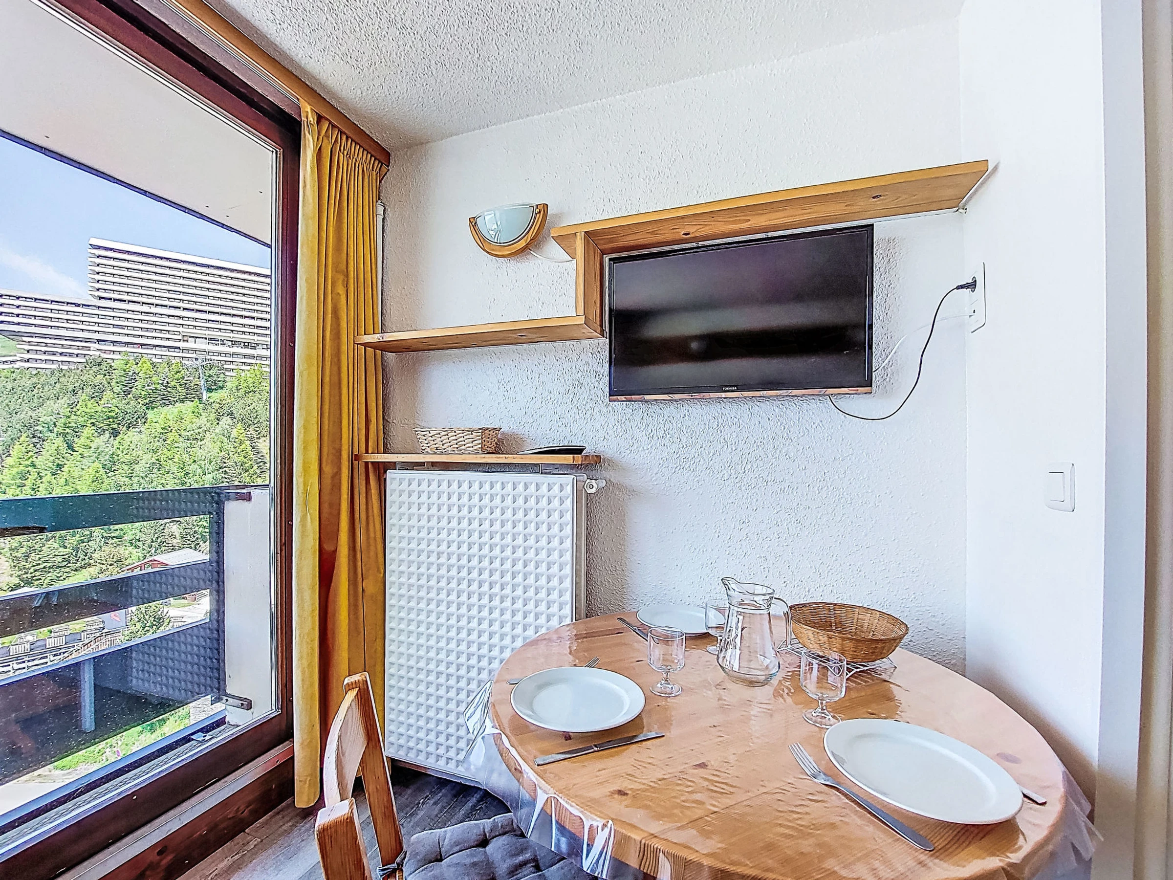 "Chavière 832", 1-room studio 19 m2 on 8th floor. Beautiful furnishings: living/dining room with 1 bed (80 cm, length 190 cm), 1 pull-out bed (2 pers. 2 x 80 cm, length 190 cm), TV (flat screen). Exit to the balcony, north facing position. Kitchen in the entrance (dishwasher, 2 ceramic glass hob hotplates, kettle, microwave, electric coffee machine). Bath/WC. View of the valley. Facilities: Internet (WiFi, extra). Please note: smoke alarm. [hidden]