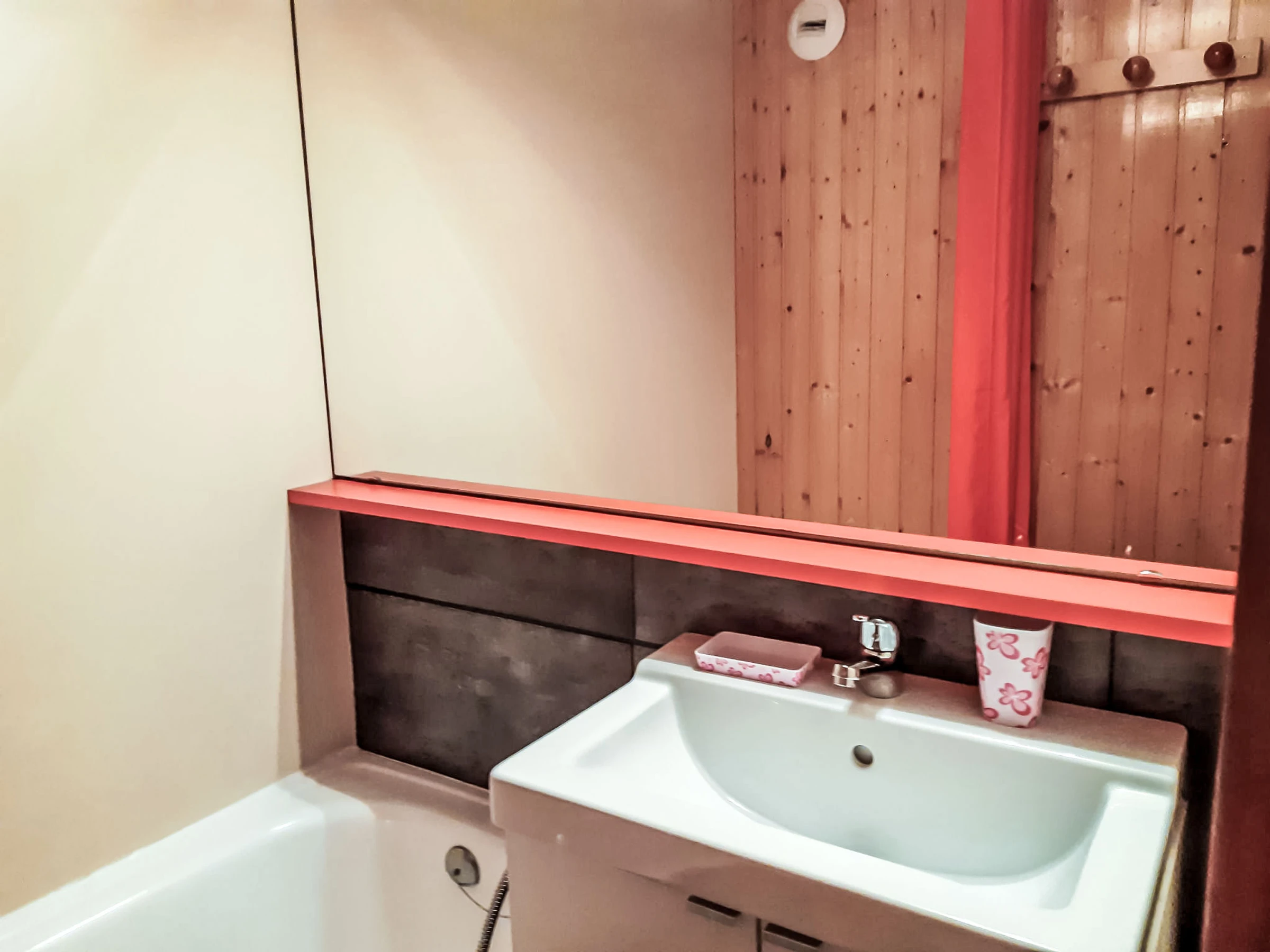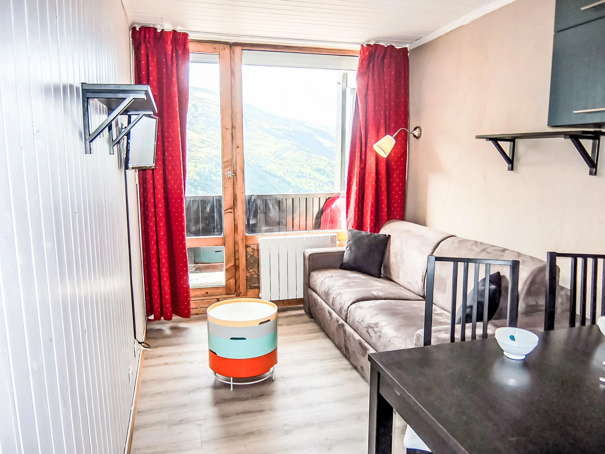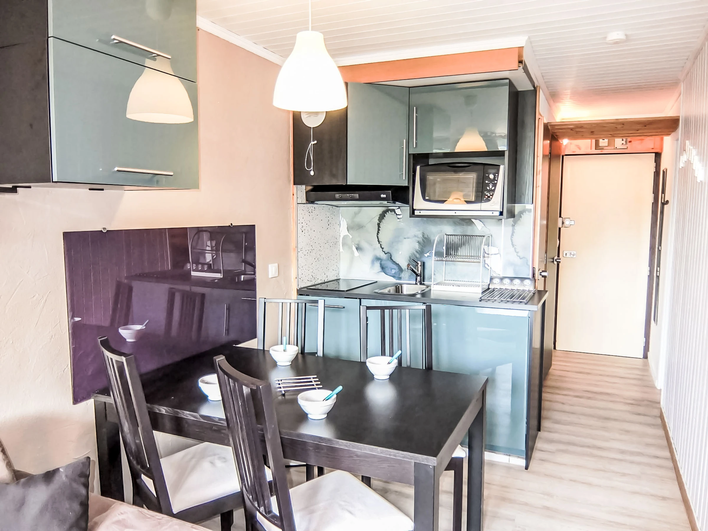 "Villaret 604", 1-room apartment 22 m2 on 6th floor. Renovated, beautiful furnishings: living/dining room with 1 double sofabed (160 cm, length 190 cm), TV (flat screen). Exit to the balcony. Sleeping alcove with Dressing room with 1 x 2 bunk beds (80 cm, length 190 cm). Kitchenette (dishwasher, 2 ceramic glass hob hotplates, toaster, kettle, electric coffee machine, combination microwave). Bathroom, sep. WC. Heating. Balcony, west facing position. Beautiful view of the mountains. Facilities: Internet (WiFi, extra). Please note: maximum 1 pet/ dog allowed. Smoke alarm. Instead of an enclosed bedroom, some sleeping areas are located in an open-plan area (gallery, alcove, etc.). [hidden]