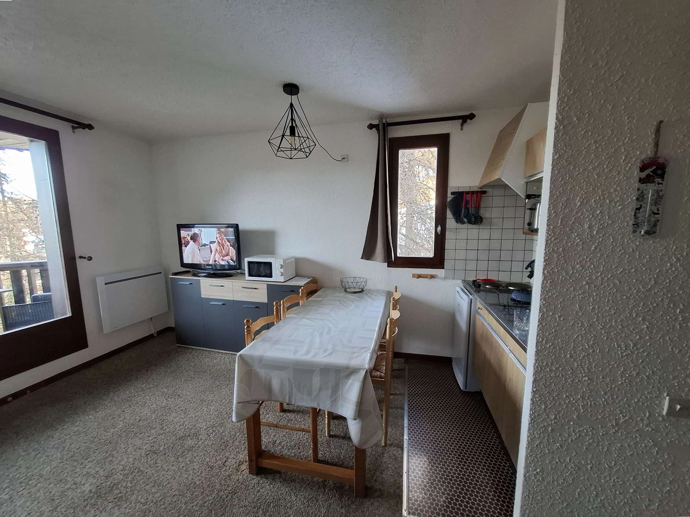 Residence Le Pouzenc, located 5 minutes from the first chairlift and shops, outdoor communal paid parking. Large studio equipped for 6 people on the 2nd floor of the residence comprising in the entrance 2 single bunk beds, another sleeping area with 2 single bunk beds, a living room with 1 double sofa bed, a kitchen area open to the living room, a bathroom and separate toilet. Balcony facing south.