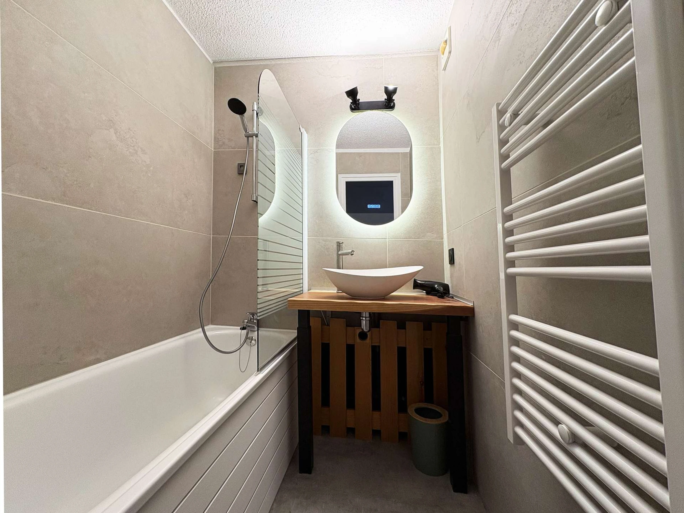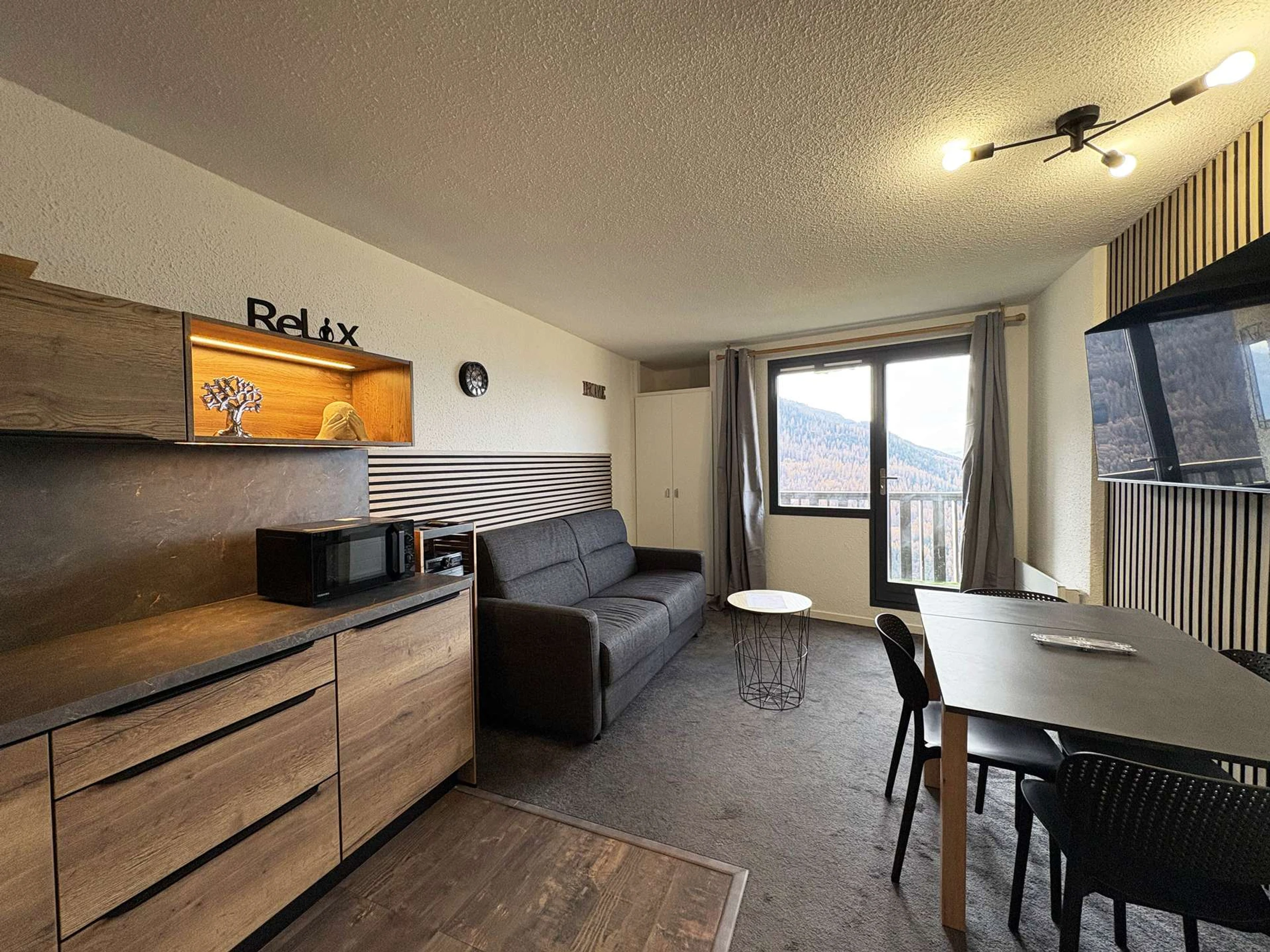 Au 4ème étage avec ascenseur, Studio équipé pour 4 personnes composé d'une entrée avec 2 lits superposés 1 places d'un séjour avec 1 banquette convertible 2 places, salle de bains et wc séparés, coin cuisine ouvert sur le séjour, balcon exposé Ouest offrant une très belle vue vallée.