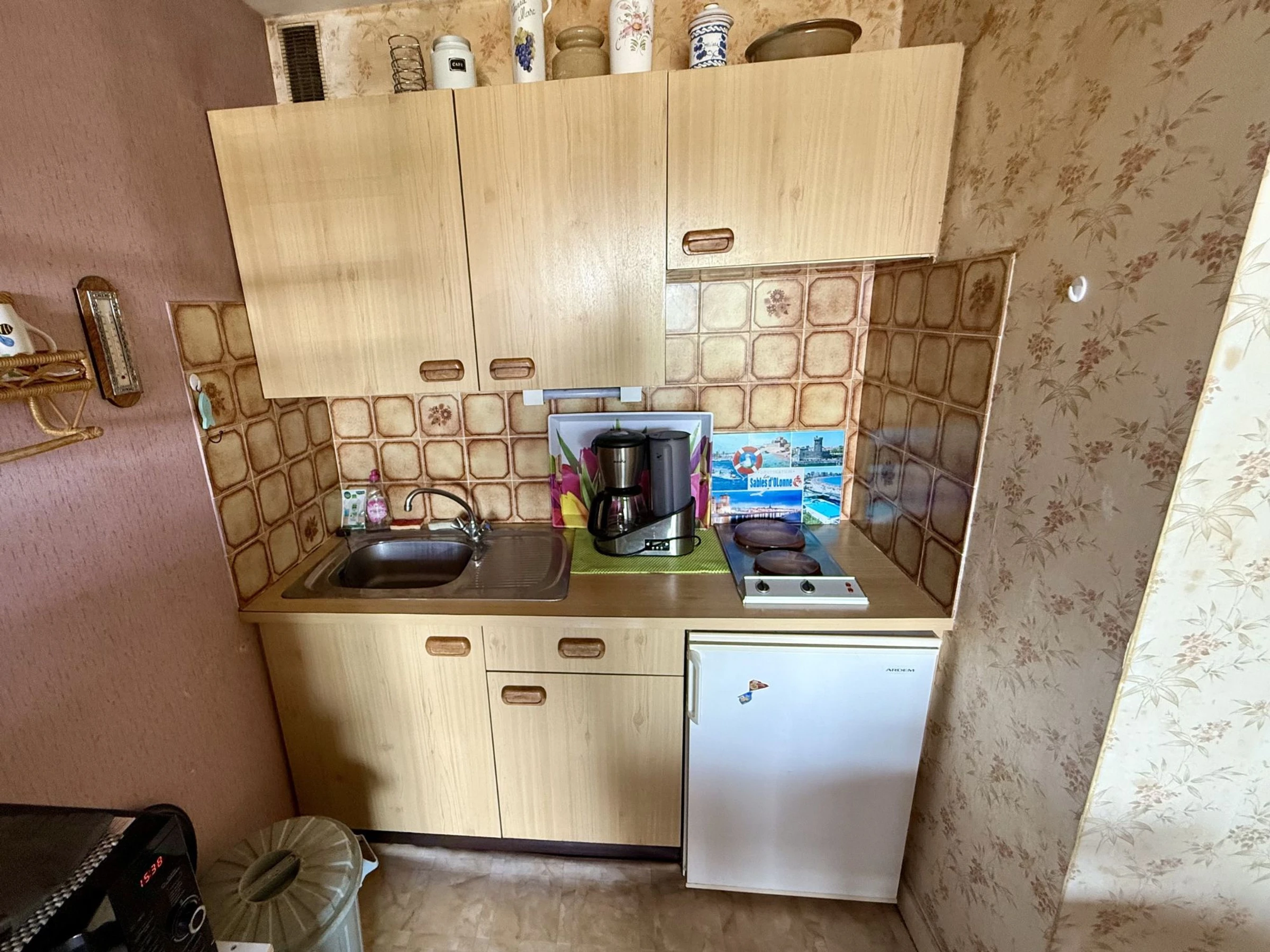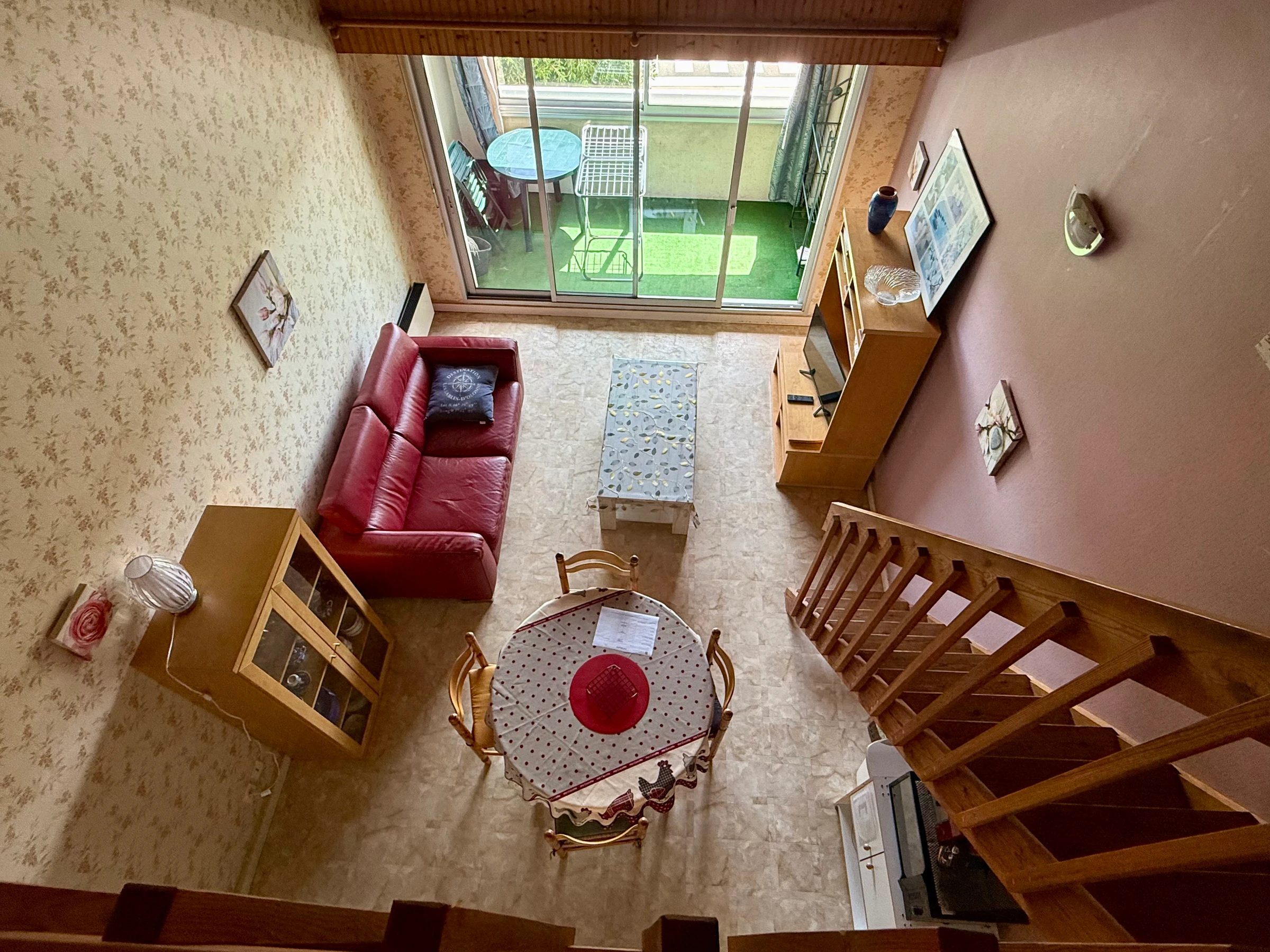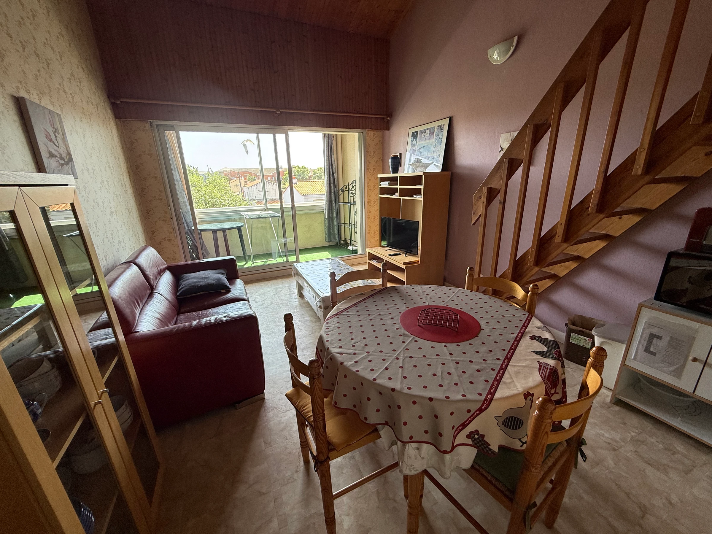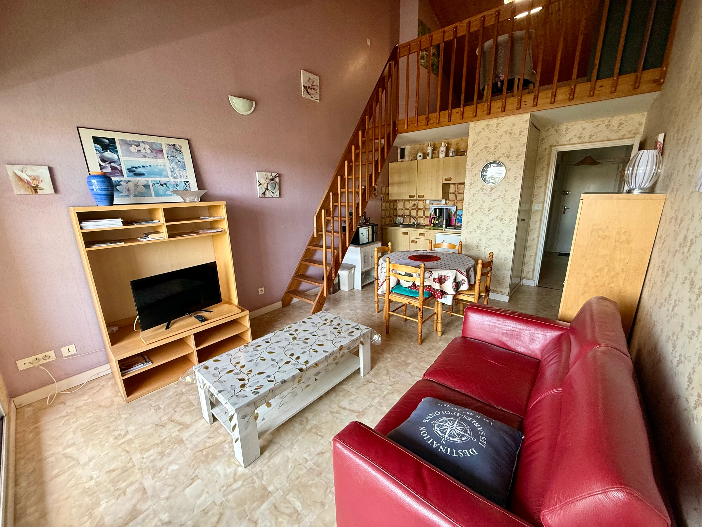 Pleasant mezzanine studio with loggia, close to the Arago market and the shops in this area. 1000 meters from the fine sand beach, located in a small residence, this studio on the 2nd floor without elevator consists of an entrance with cupboard, a living room with equipped kitchen area and a mezzanine with 1 bed of 140 and 1 bed of 90 - Bathroom with bathtub and sink - Separate WC. Equipment: Fridge, Multifunction oven, 2 Electric hotplates, Washing machine, TV, Equipped loggia.