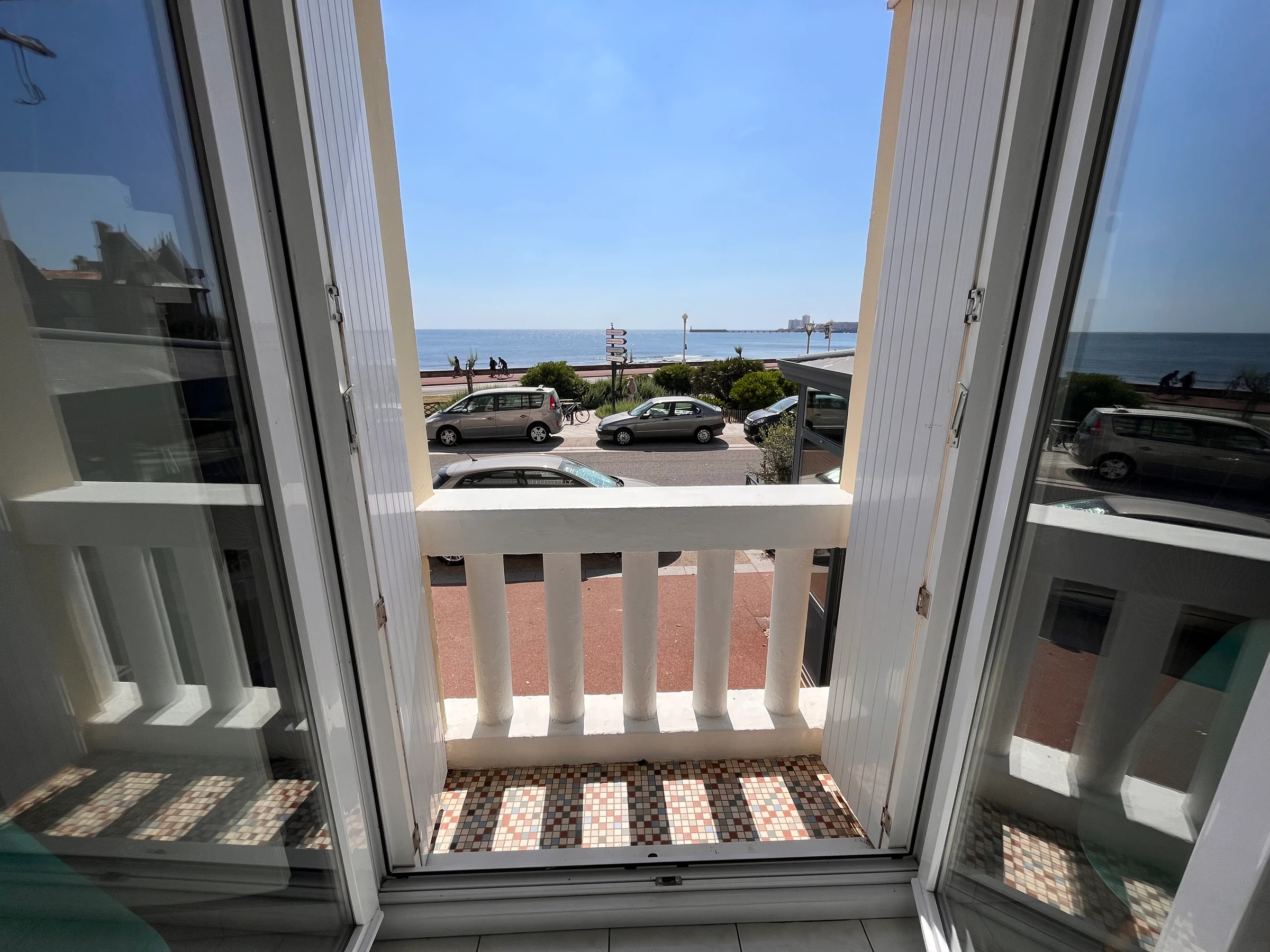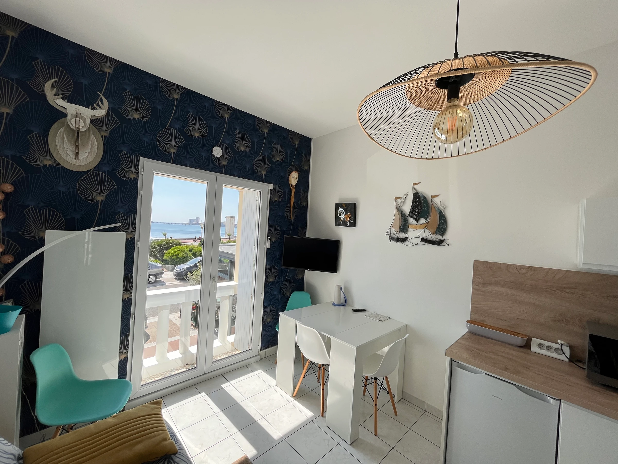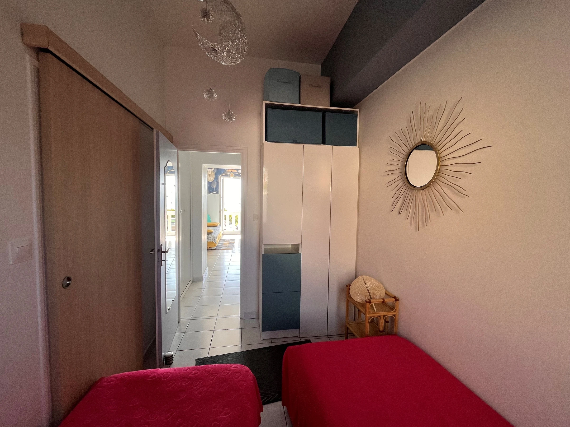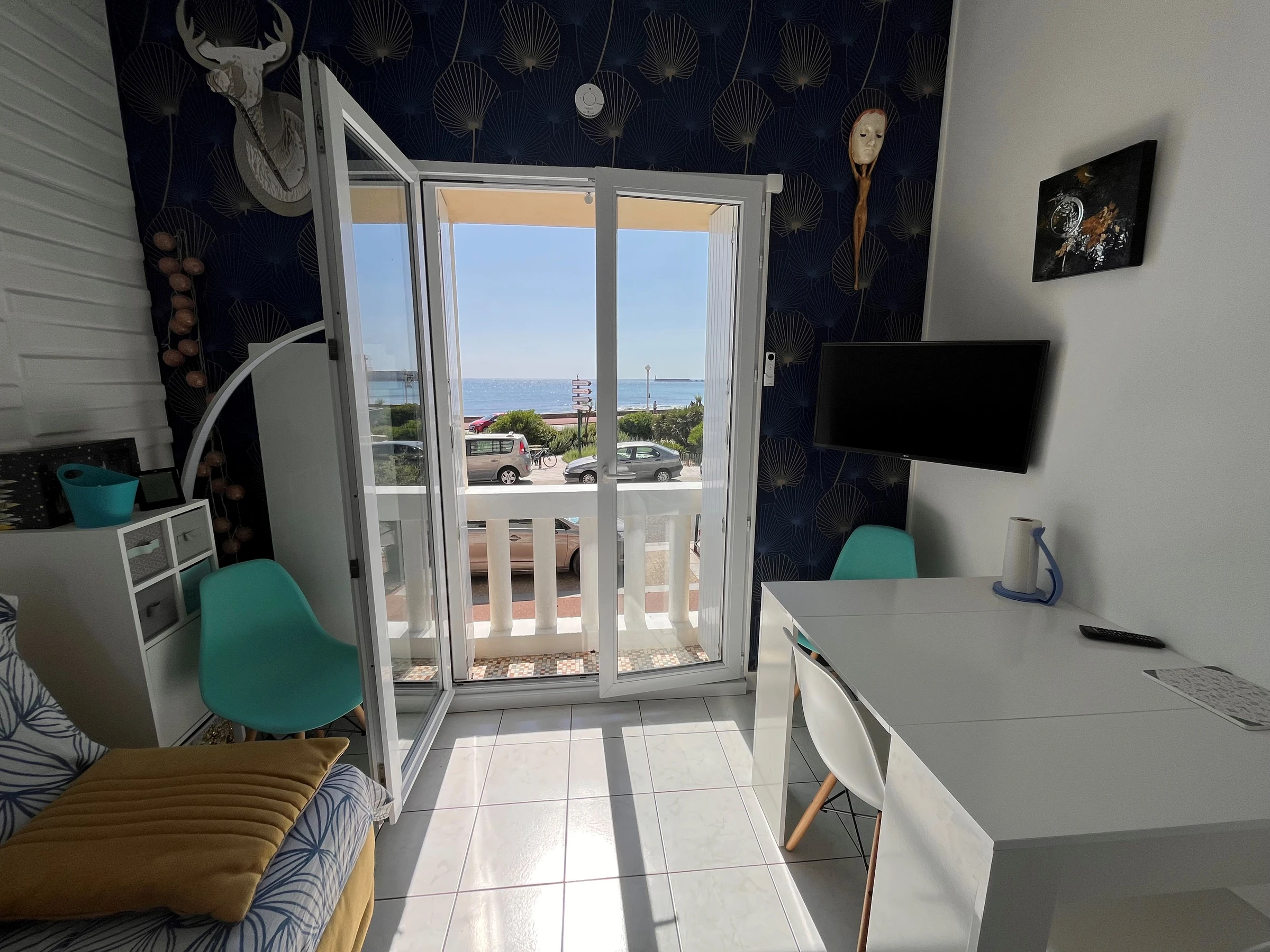 Apartment with sea view, facing the beach, on the raised ground floor, comprising a living room with a 140x190 sofa bed, television, table and chairs, an open kitchen including a washing machine, microwave, refrigerator-freezer, ceramic hob and extractor hood, and a single-serve coffee maker, a separate water closet with a washbasin, a bedroom with two 80x190 beds that can be pushed together, overlooking the bathroom with shower. Electric awning and balcony. ref. APPA18. Linen not provided.