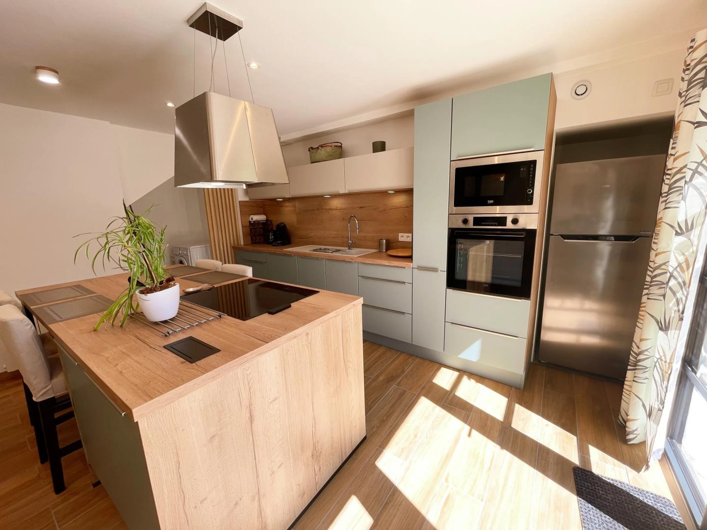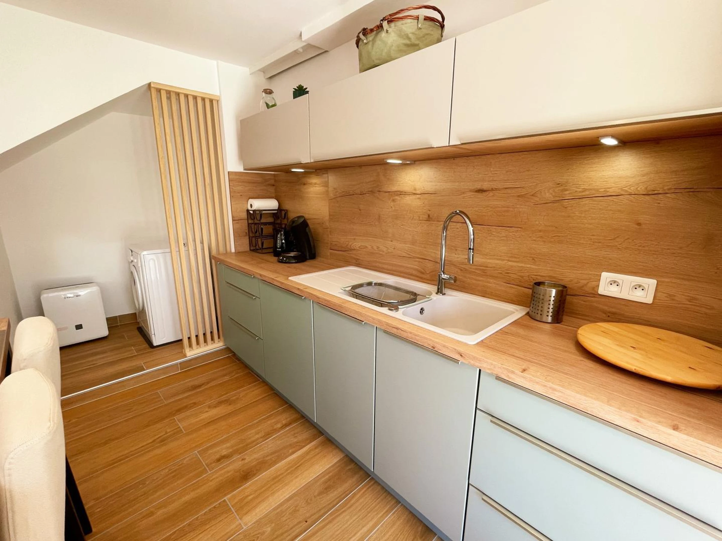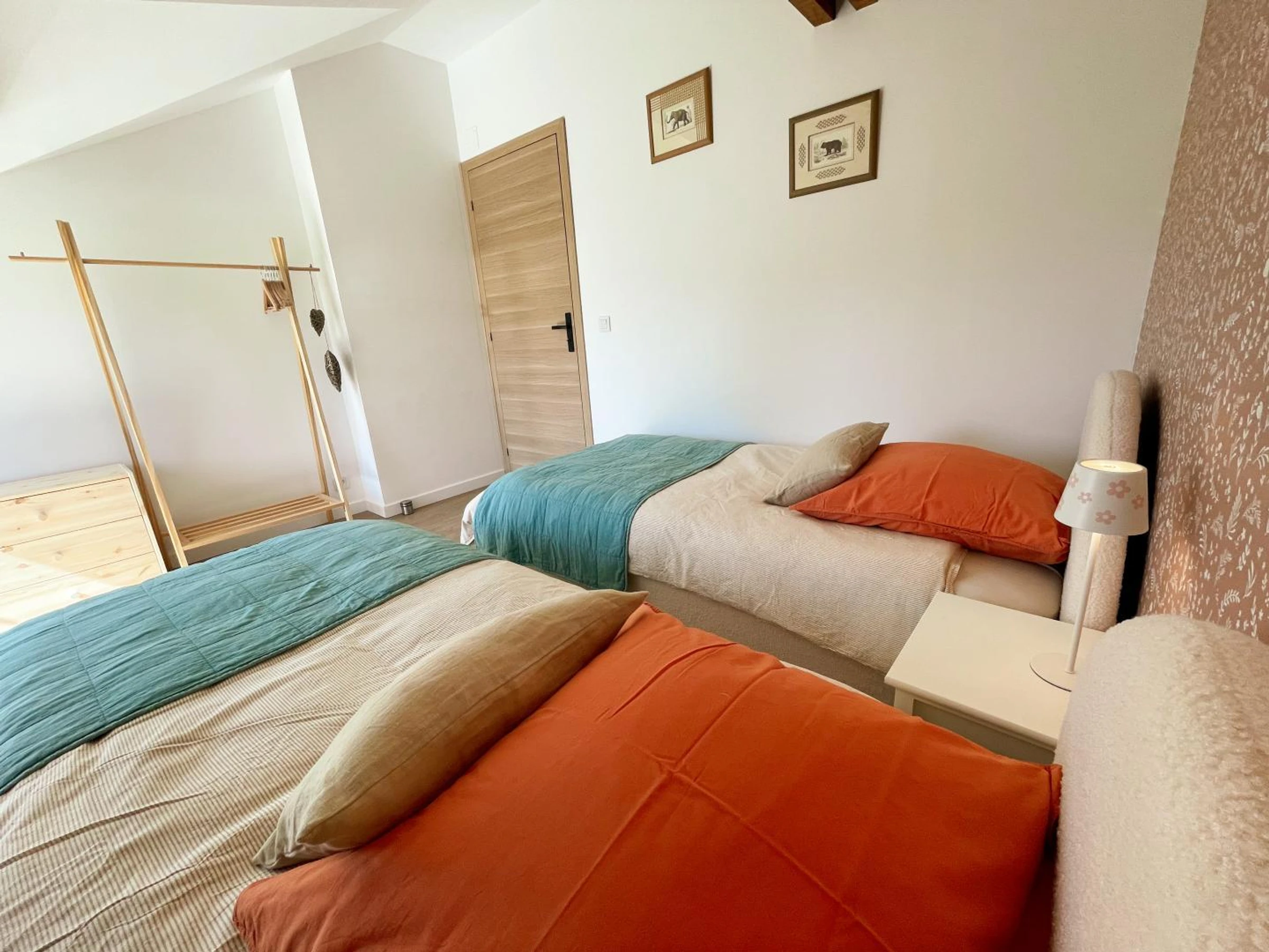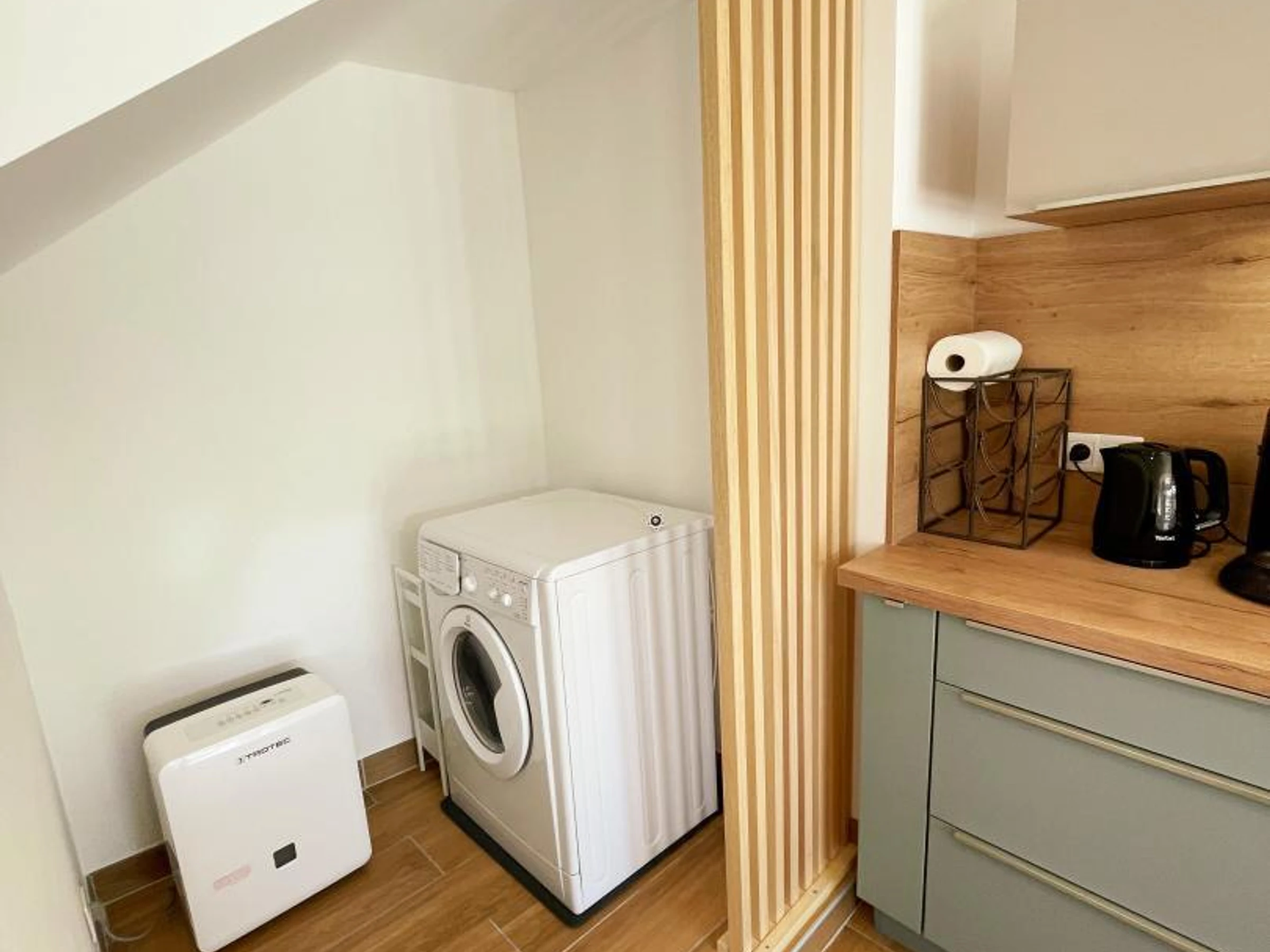 All-inclusive holiday cottage (except tourist tax). Ground floor: living room with fully equipped kitchen (Senseo coffee machine and filter), laundry area (washer-dryer), lounge, TV, pellet stove. Upstairs: bedroom (160x200 cm bed), bedroom (2 single beds 90x190 cm), shower room with WC. Wi-Fi.
