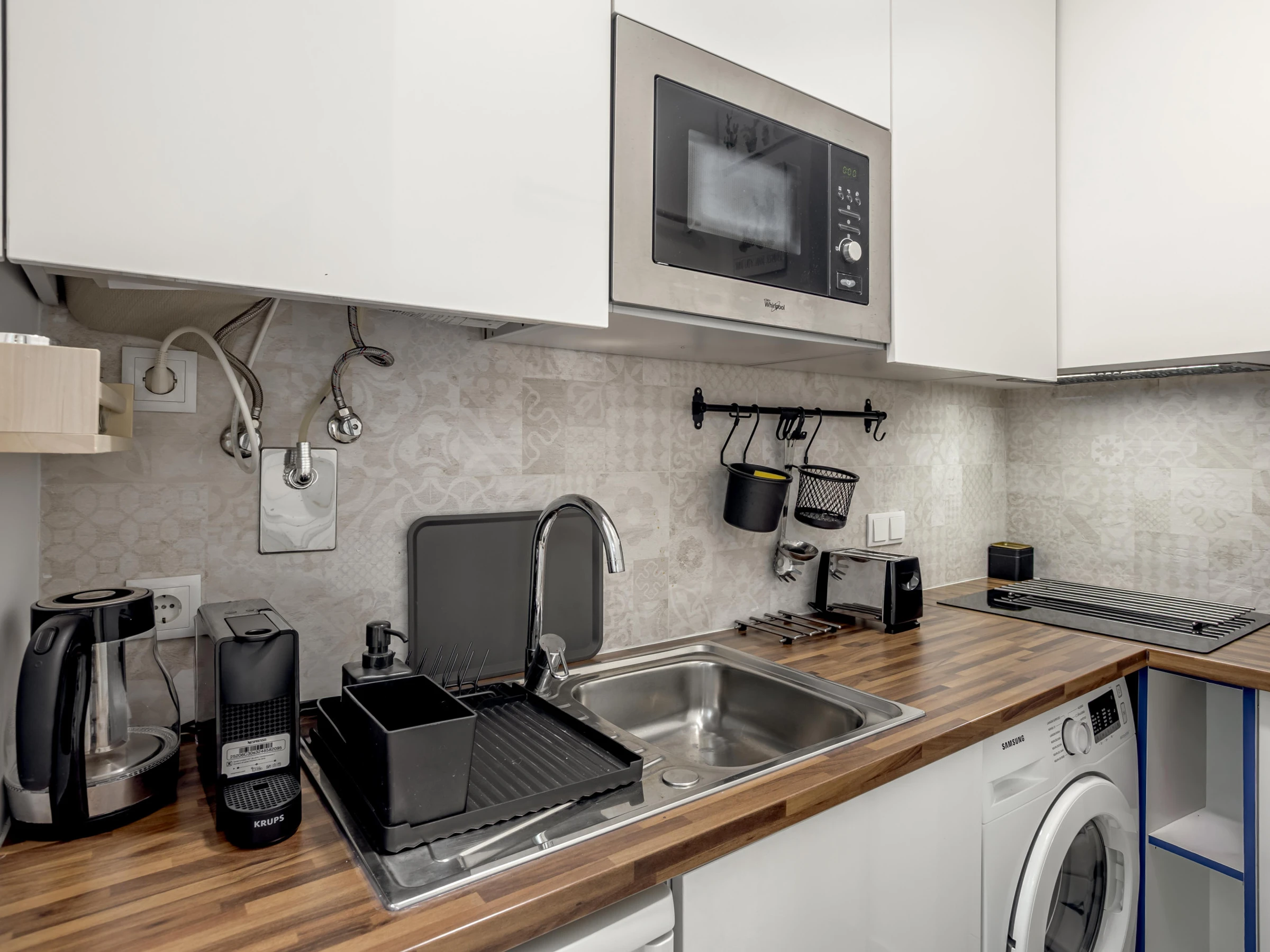 The independent kitchen is fully equipped with modern appliances, including a fridge, washing machine, coffee machine, microwave, toaster and kettle. Here you can prepare quick meals or small snacks with complete convenience.