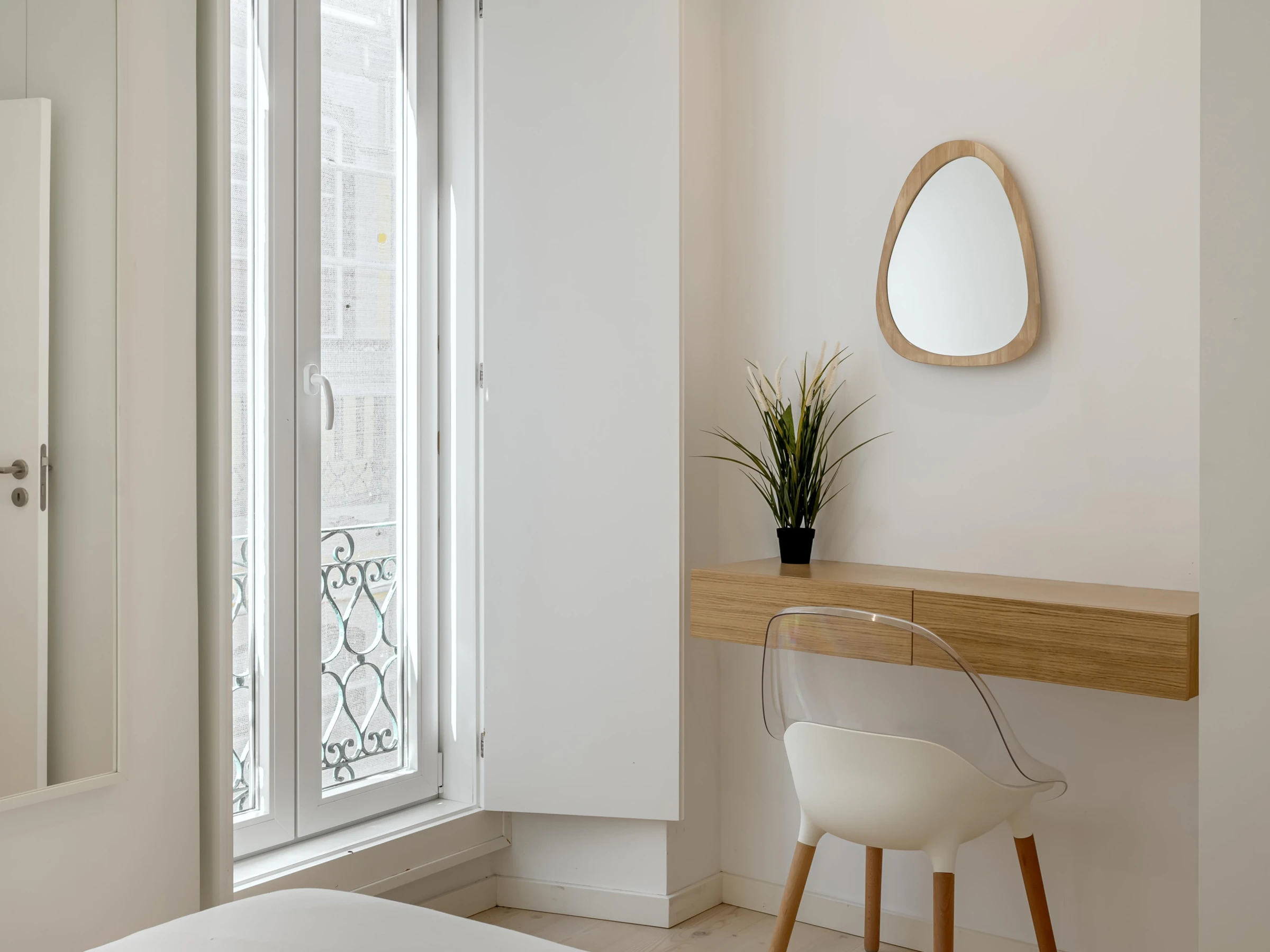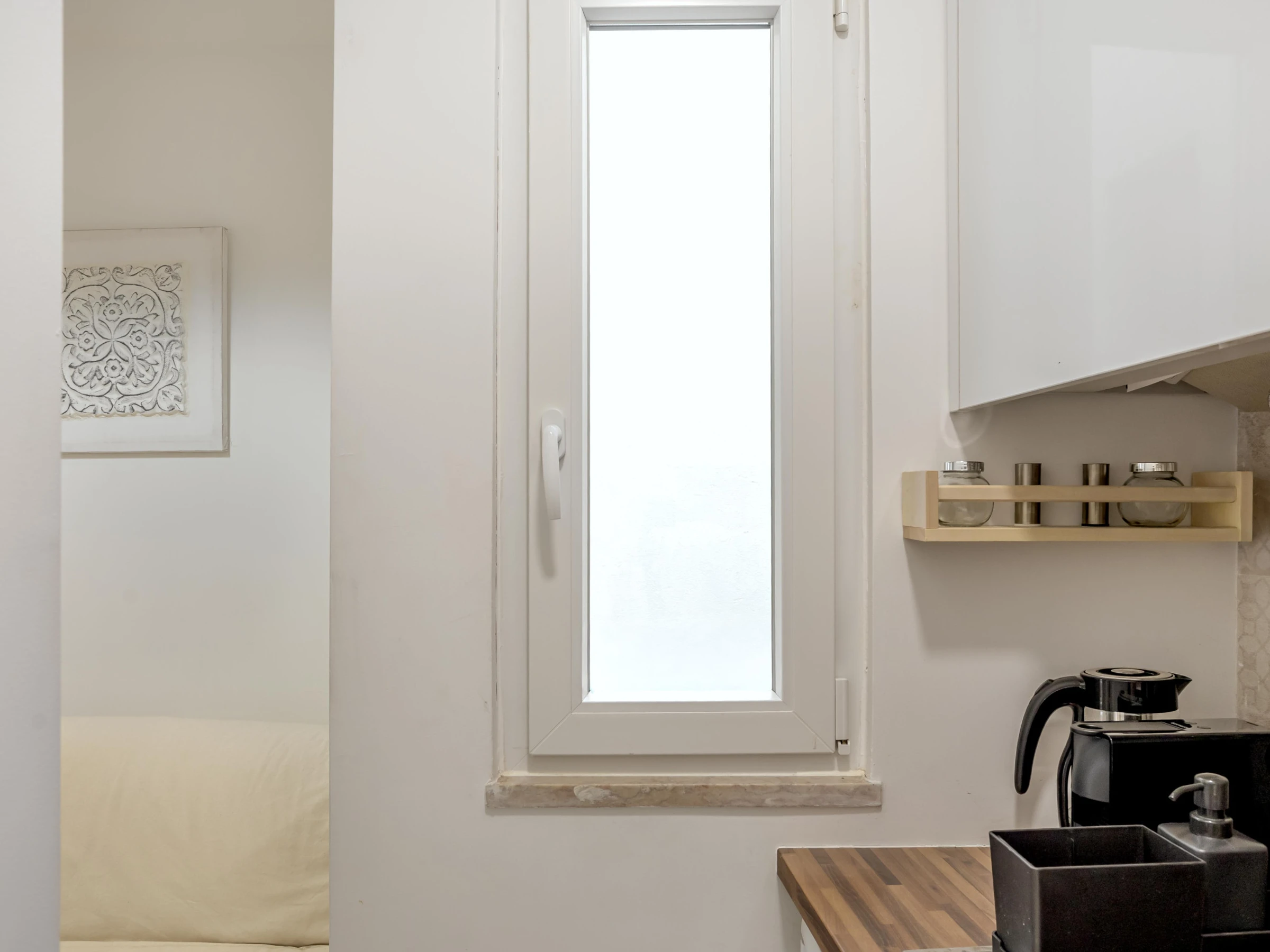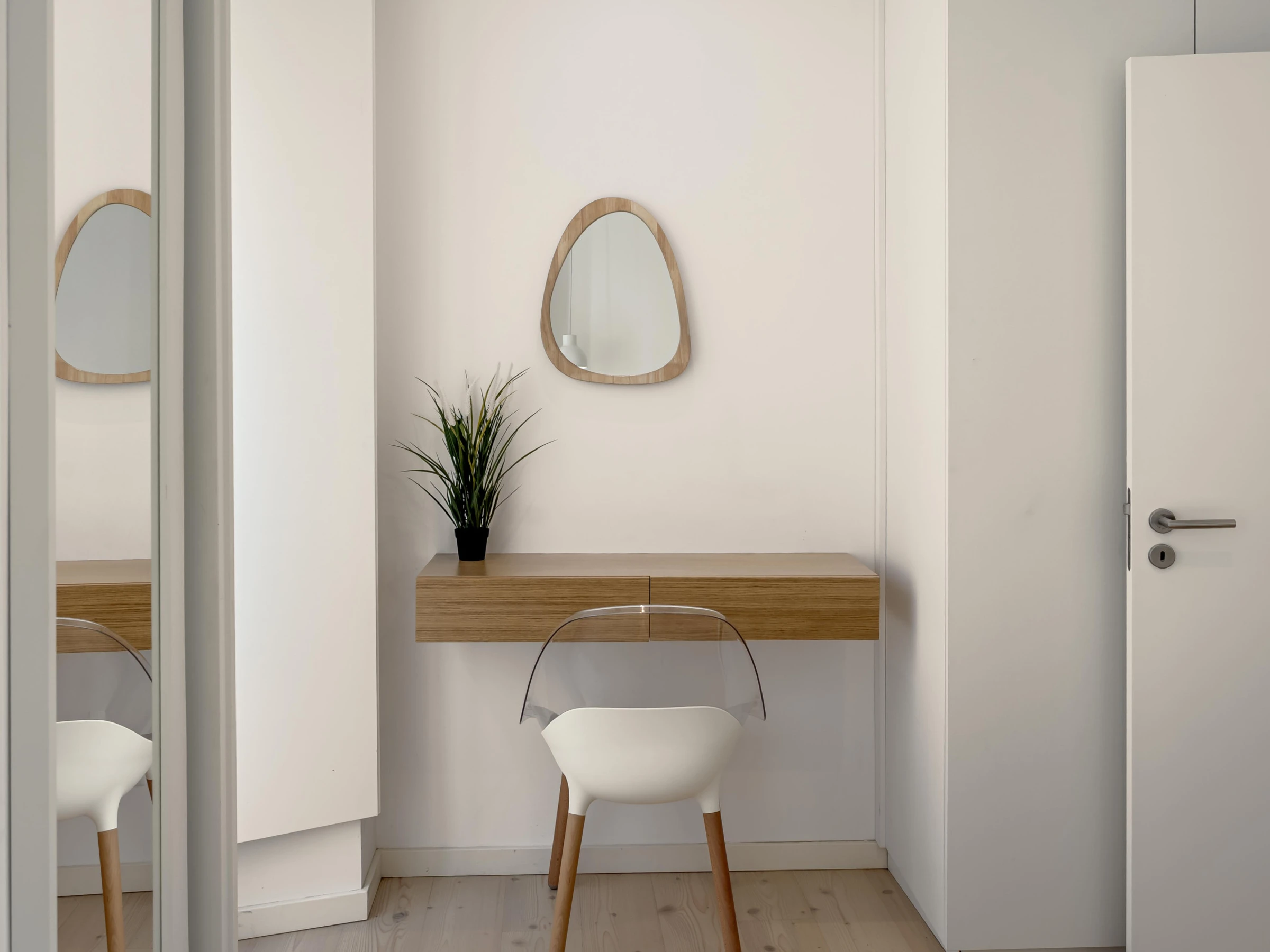 The apartment features a spacious bedroom equipped with a comfortable double bed, ideal for resting after a day of exploring the city. The minimalist and contemporary decor creates a relaxing and elegant atmosphere.