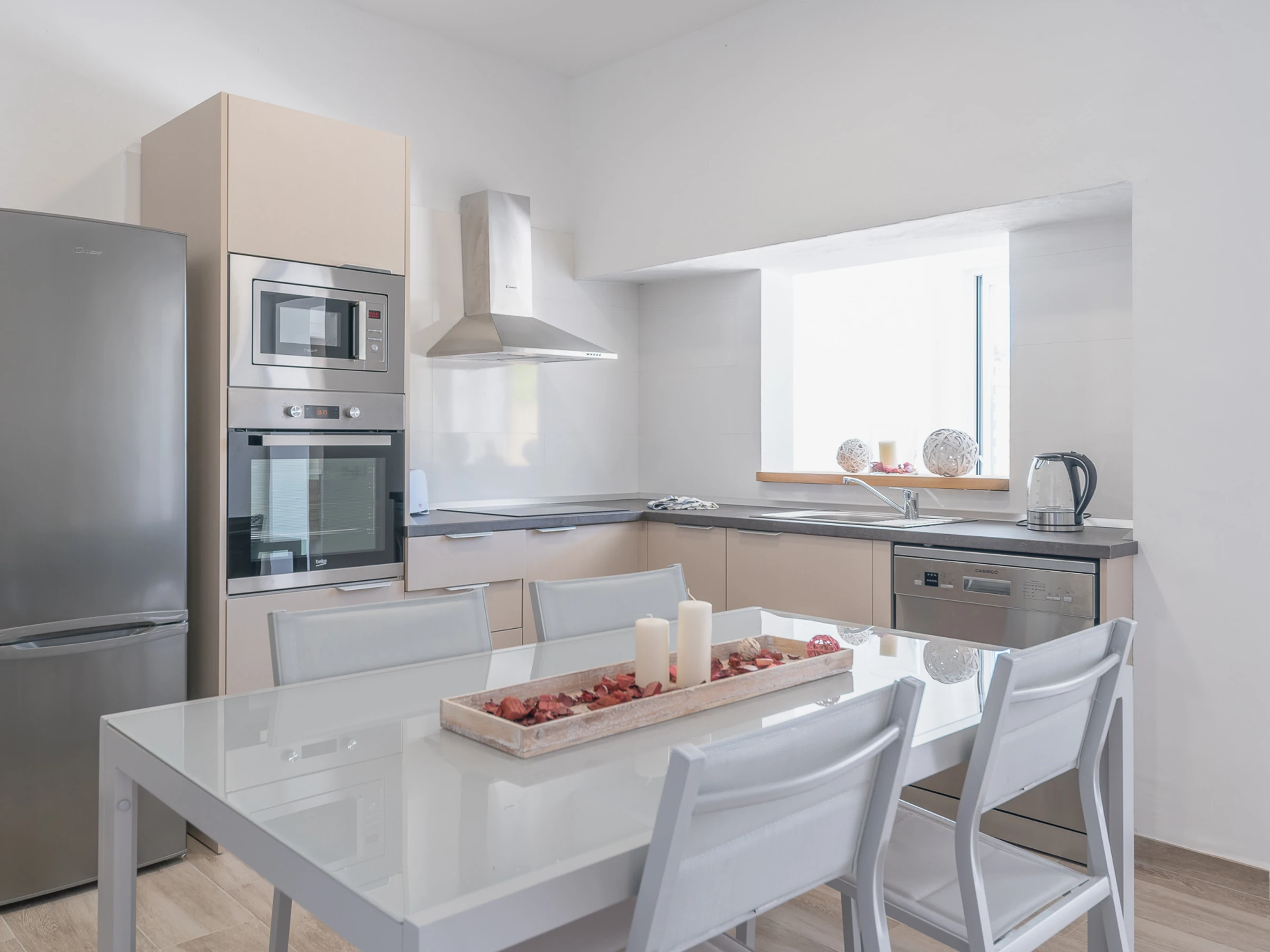 The open plan kitchen, of hotplate of glass ceramics, is equipped with refrigerator, microwave, oven, freezer, dishwasher, dishes/cutlery, kitchen utensils, coffee machine, toaster and kettle.