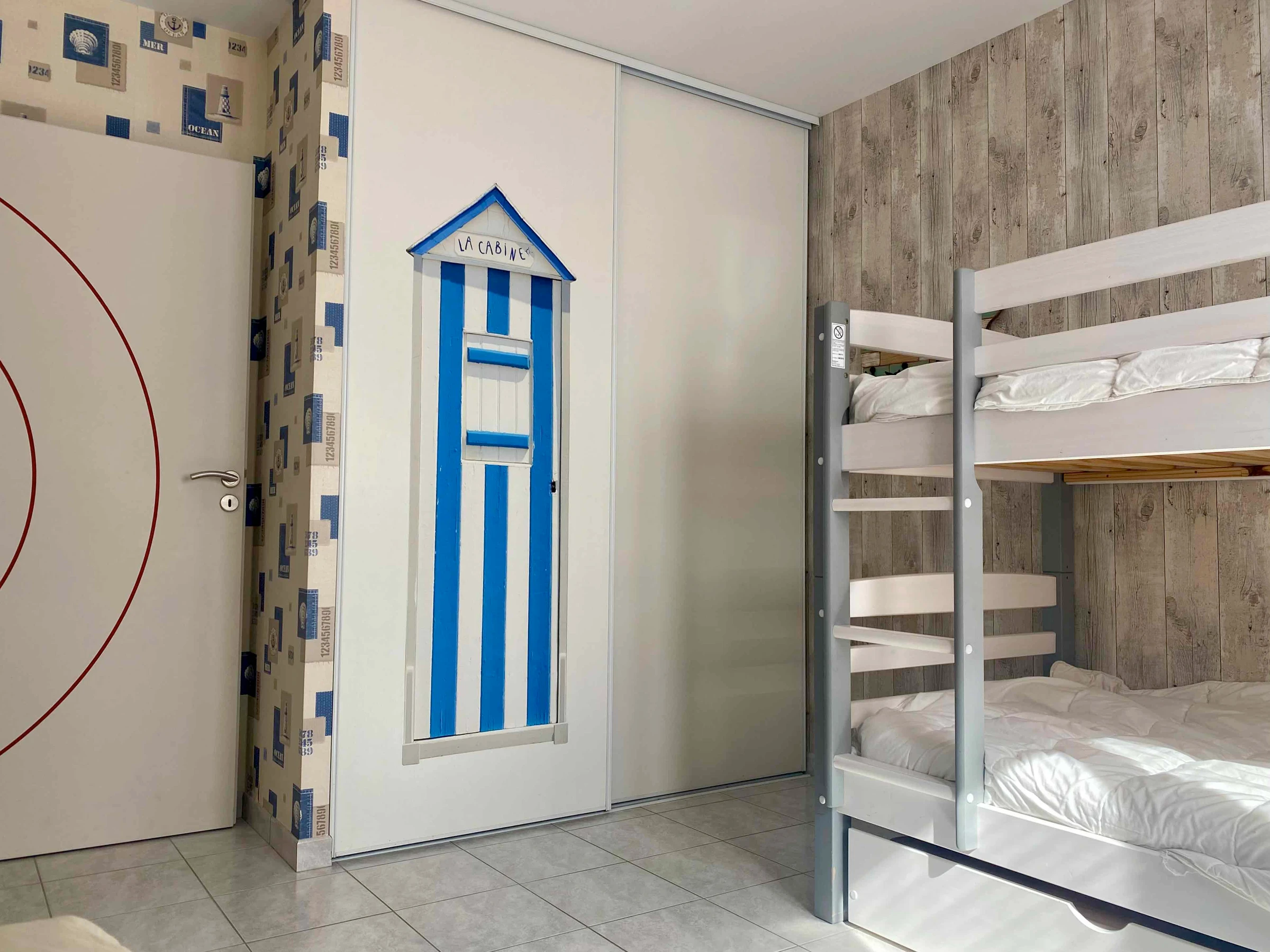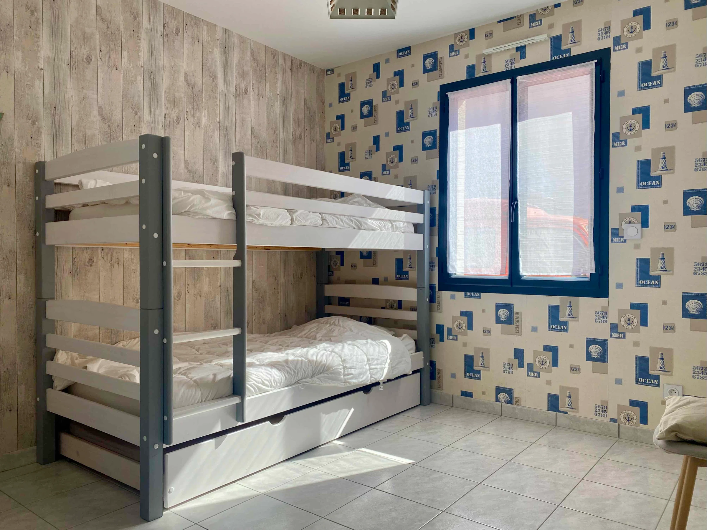 The sleeping area consists of two bedrooms: one with a double bed (140 cm), the other with two bunk beds and a pull-out bed, accommodating up to five people. The house also has a shower room and a separate toilet. Outside, guests enjoy a fully enclosed private garden, furnished with garden furniture and an awning, perfect for al fresco dining and relaxation. Secure parking is available on the property.