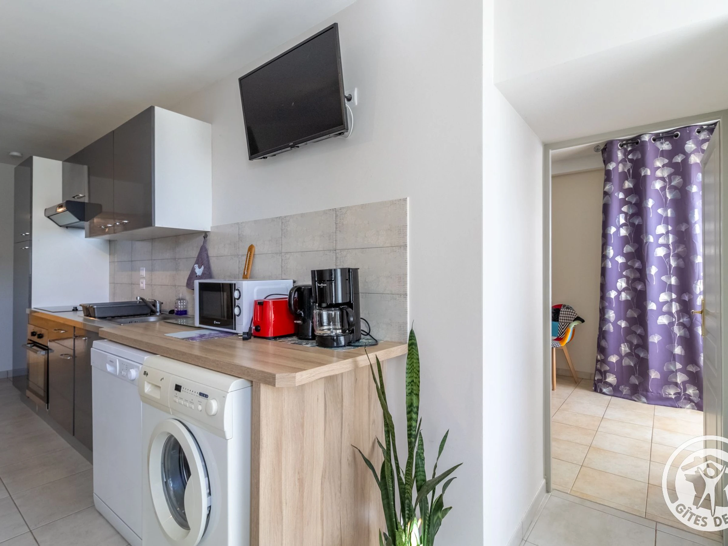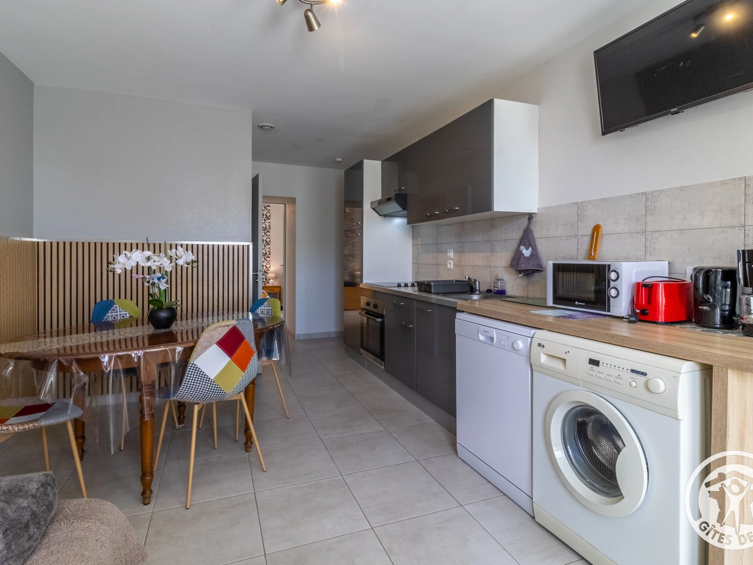 The 19 m² living room combines a fully equipped kitchen (oven, microwave, ceramic hob, dishwasher, and washing machine), a lounge area with a sofa bed and television, and a cozy dining area. For cozy gourmet moments, you can use the plancha, raclette, or crepe maker, depending on your mood.