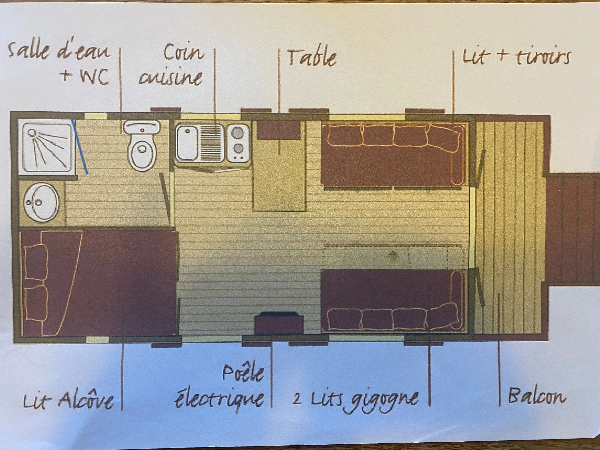 The 17m² caravan comprises a main room with a dining area and kitchenette (two-burner cooktop, refrigerator, microwave, coffee maker, kettle), a 140x190cm bed in an alcove, and two 80x190cm beds that also serve as benches. The bathroom has a shower, a vanity unit, and a toilet. A garden lounge with a barbecue is available under a private, secluded covered area, located a few meters from the caravan.