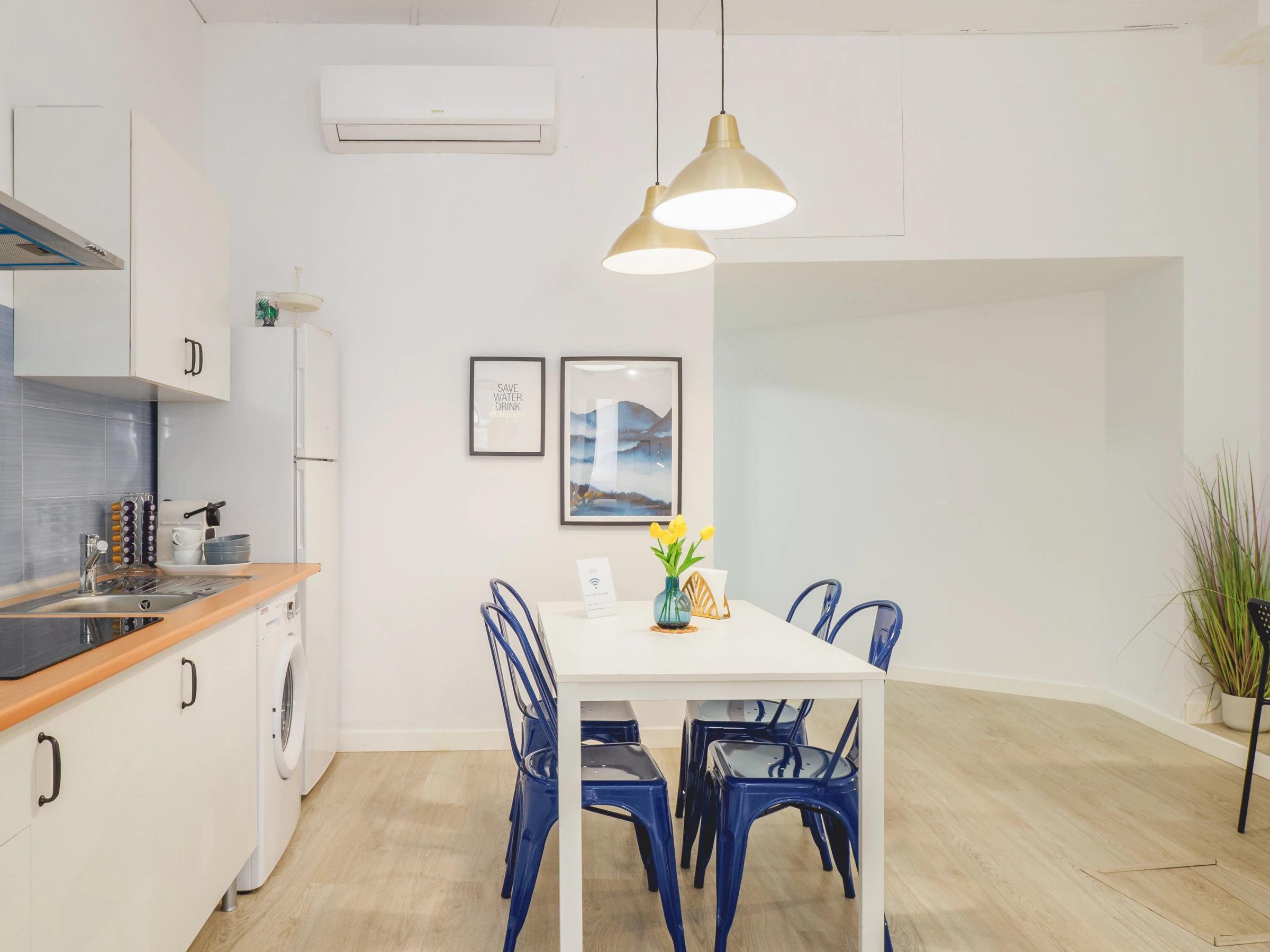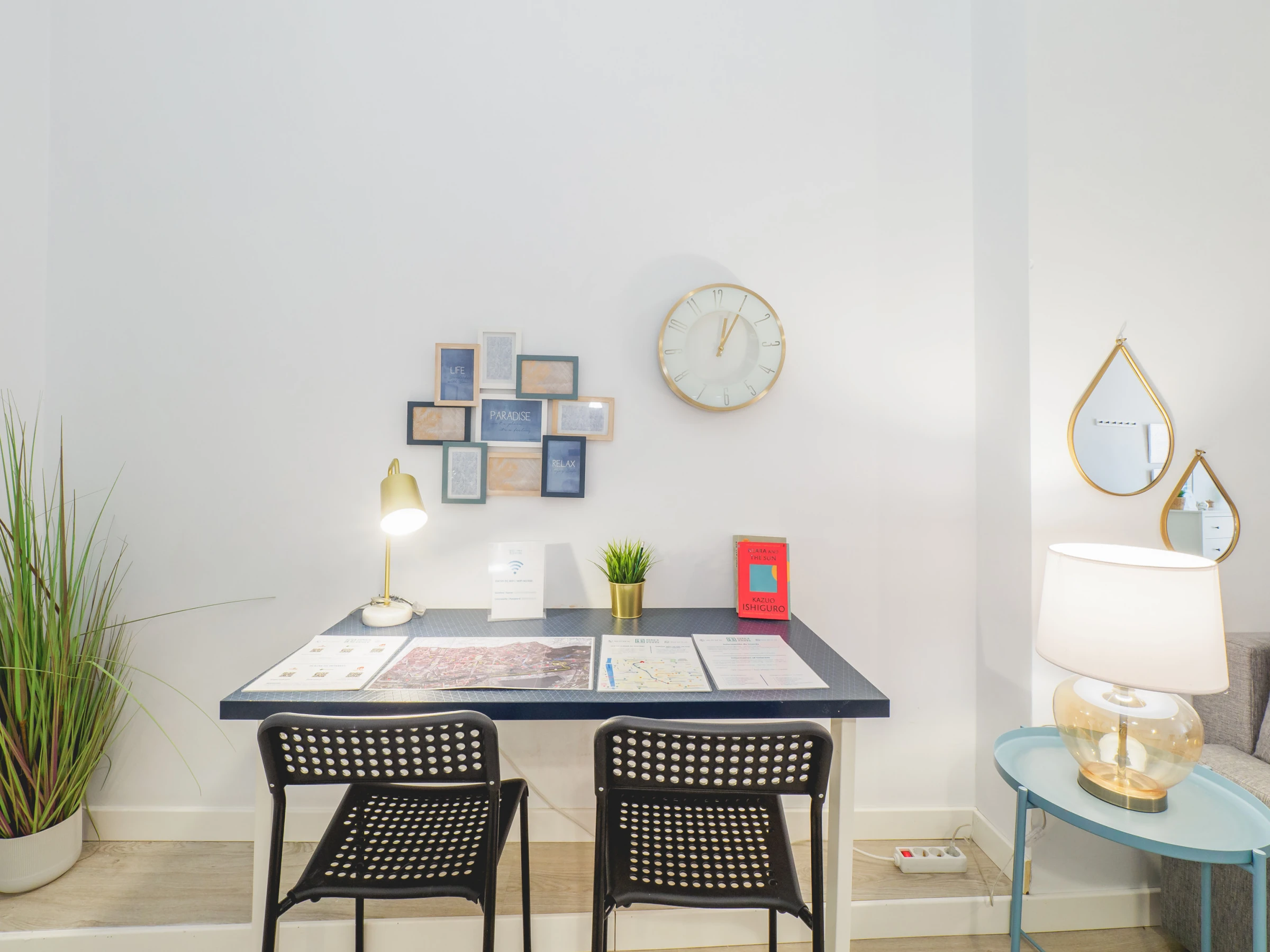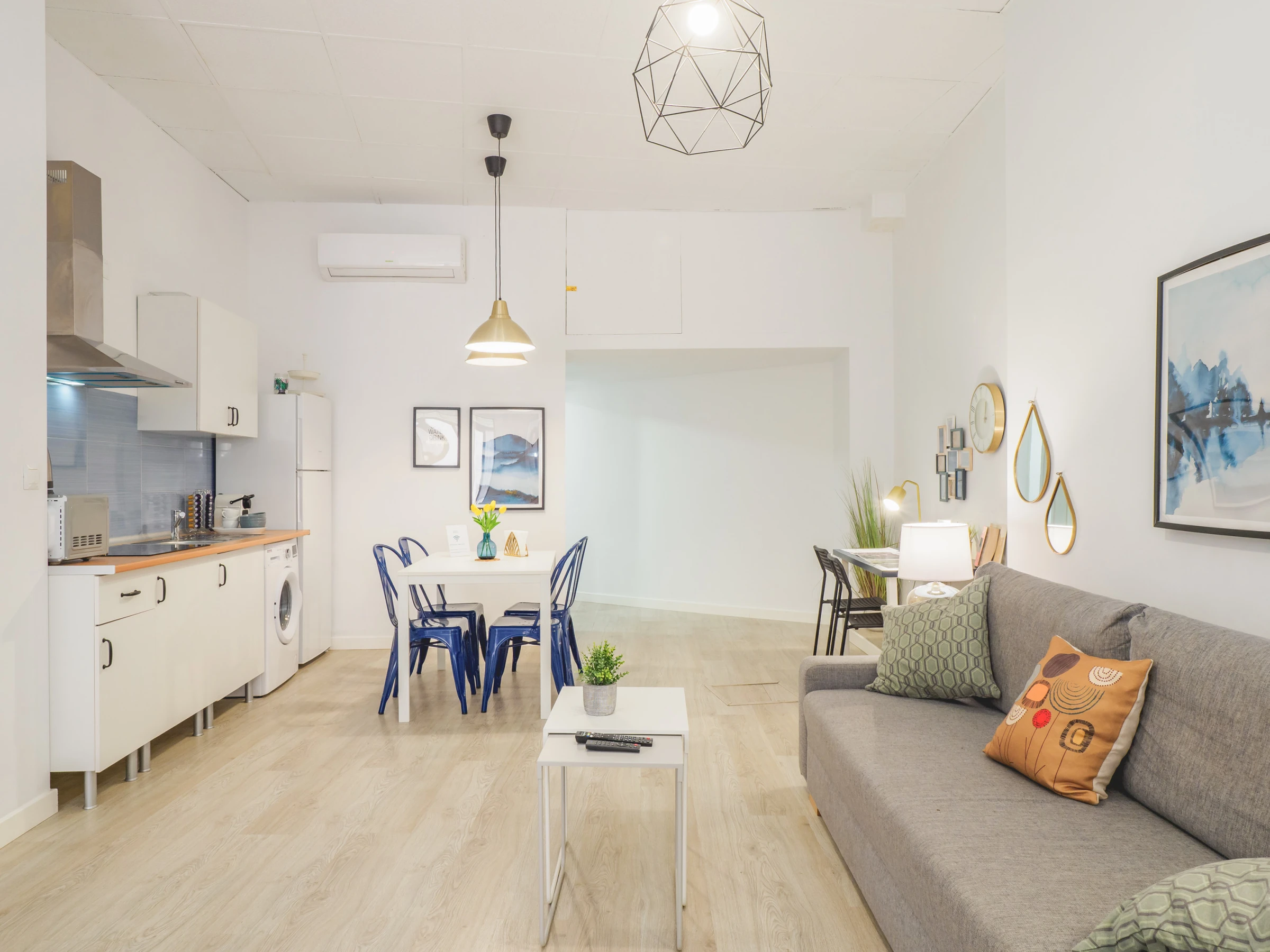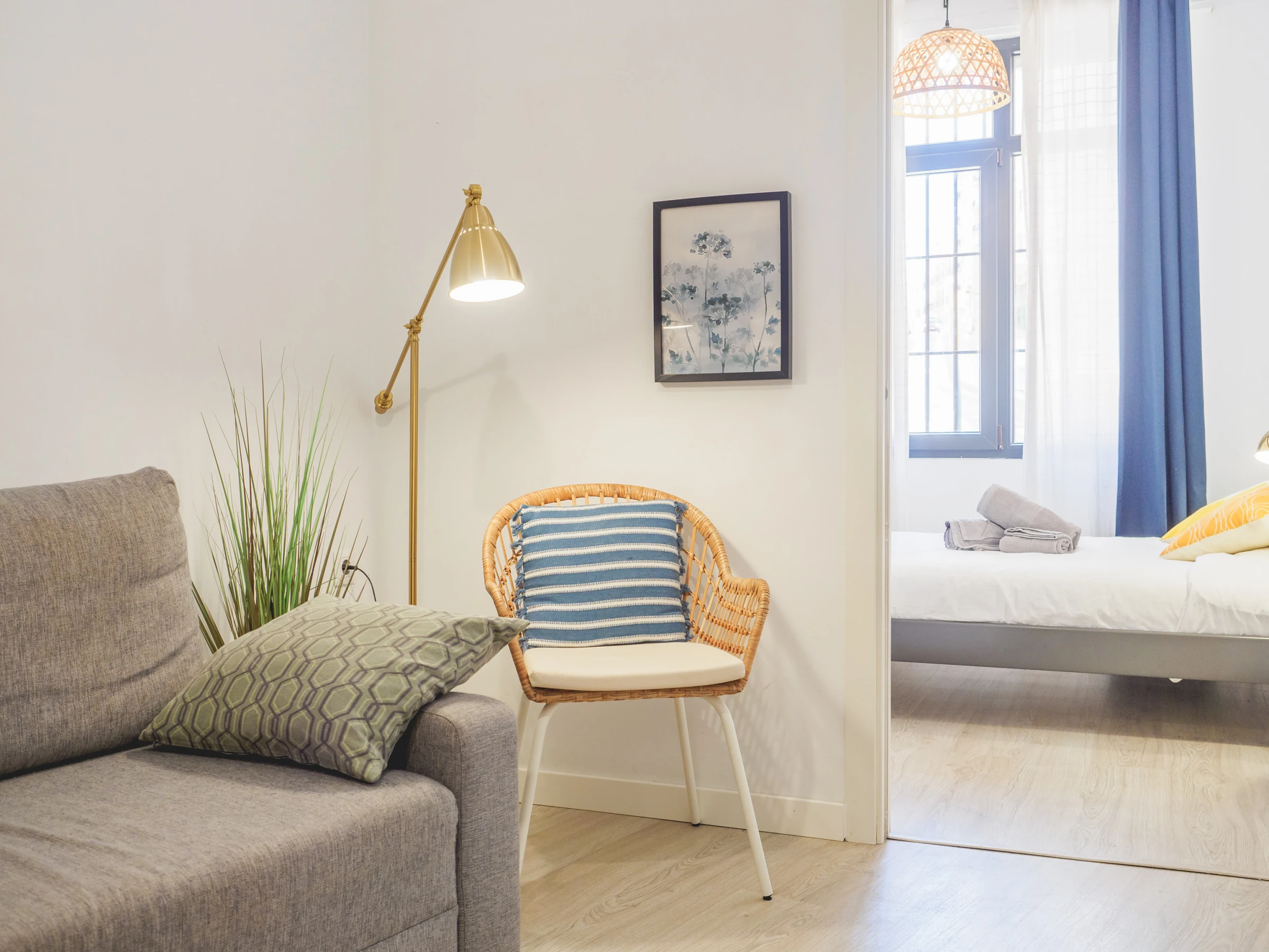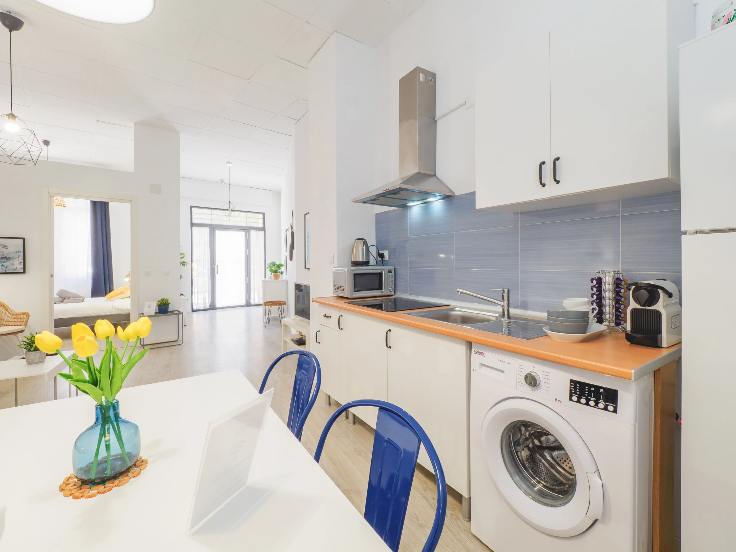 This apartment is located on a ground floor with direct access from the street, ideal for those looking for comfort and easy entry. Its open design integrates a living-dining room with a double sofa bed, perfect for up to 4 people, and a fully equipped American kitchen with modern appliances: induction, fridge, microwave, oven, washing machine, coffee maker, toaster, kettle, and juicer. Everything is designed so you can prepare your meals without complications. Additionally, it has a comfortable desk and high-speed fibre optic wifi connection (1GB/s symmetric), ideal for teleworking or enjoying your free time connected.