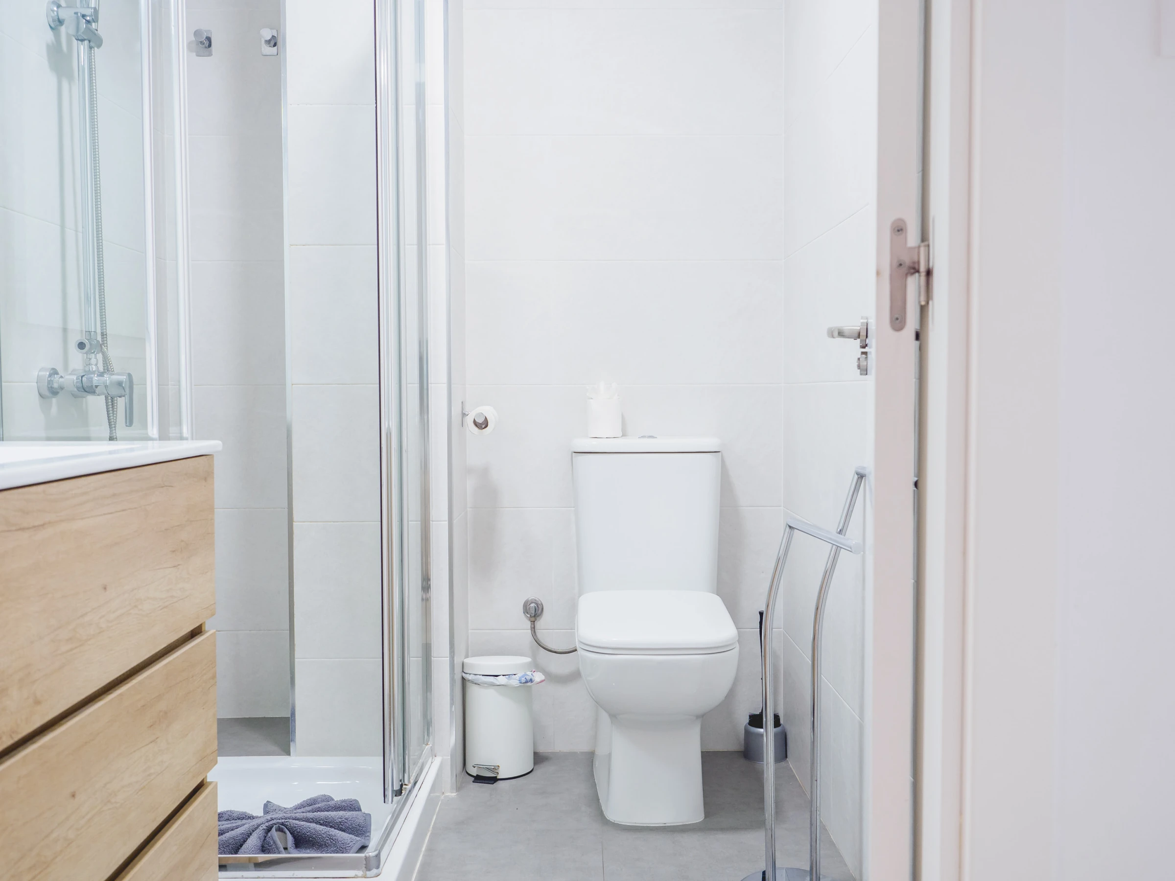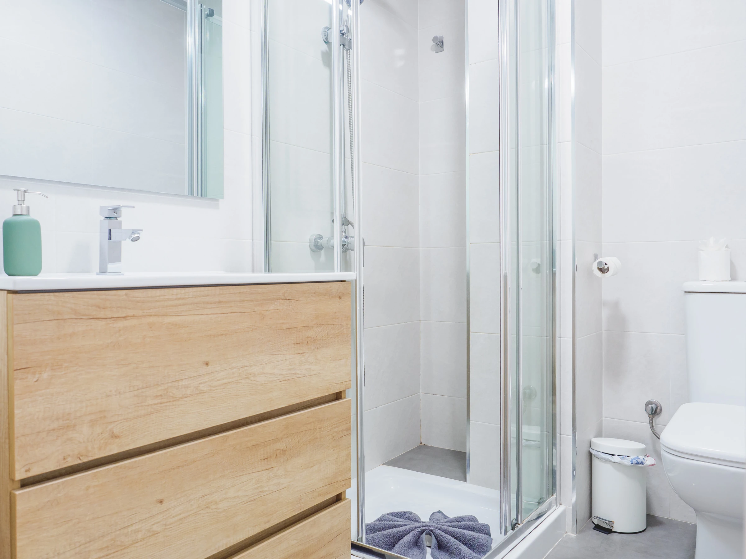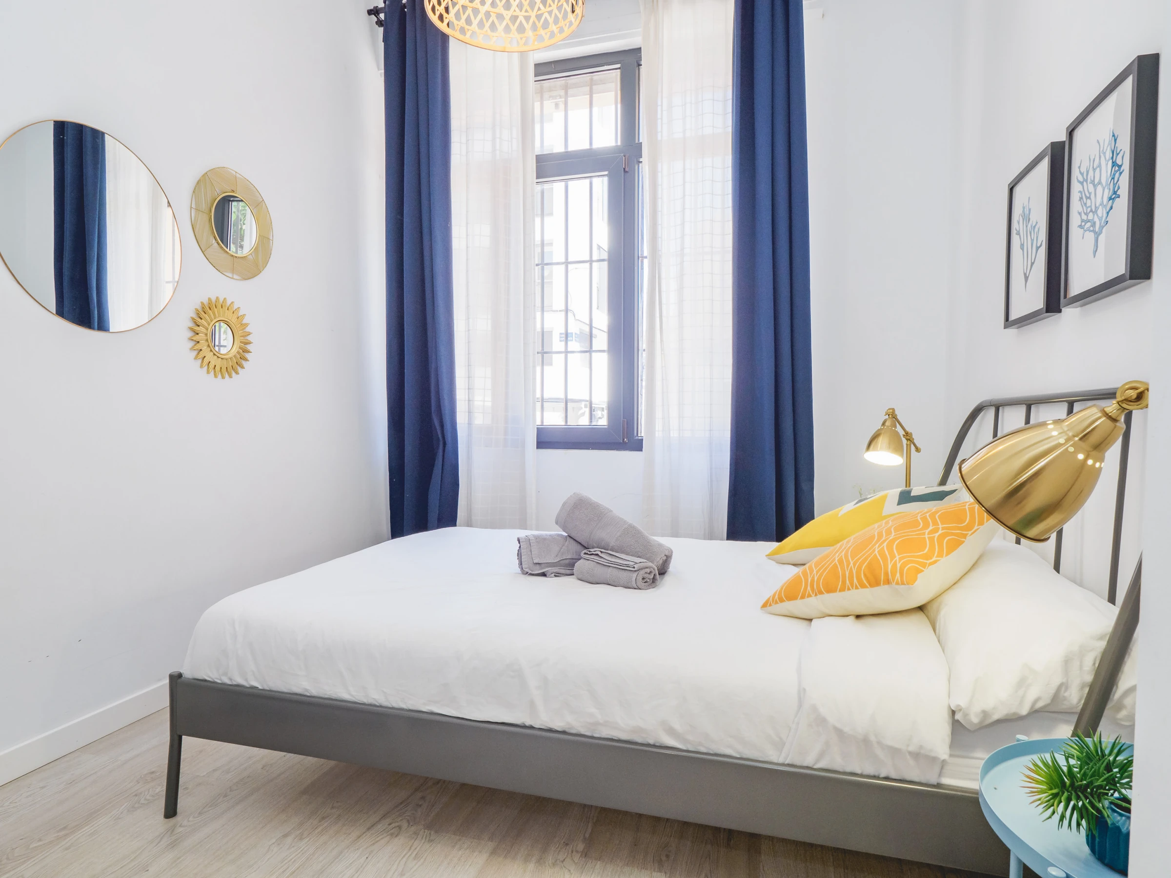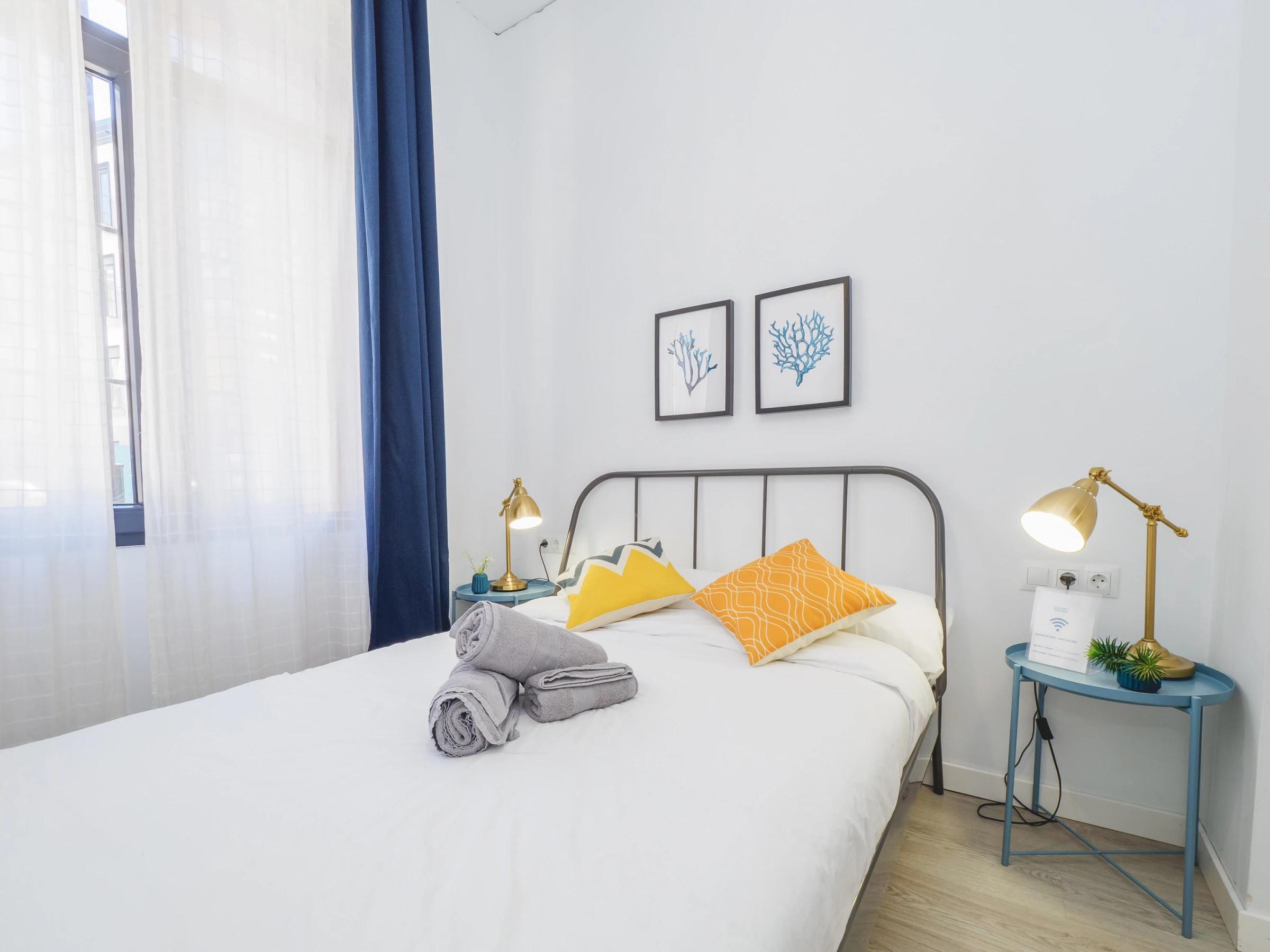 The main bedroom has a double bed with a window facing the street, protected with opaque curtains to guarantee your privacy. It also offers enough space to store your luggage in an orderly manner. The apartment has air conditioning in the common area, providing a cool or warm environment depending on the season, and a bathroom with a shower tray for your comfort.