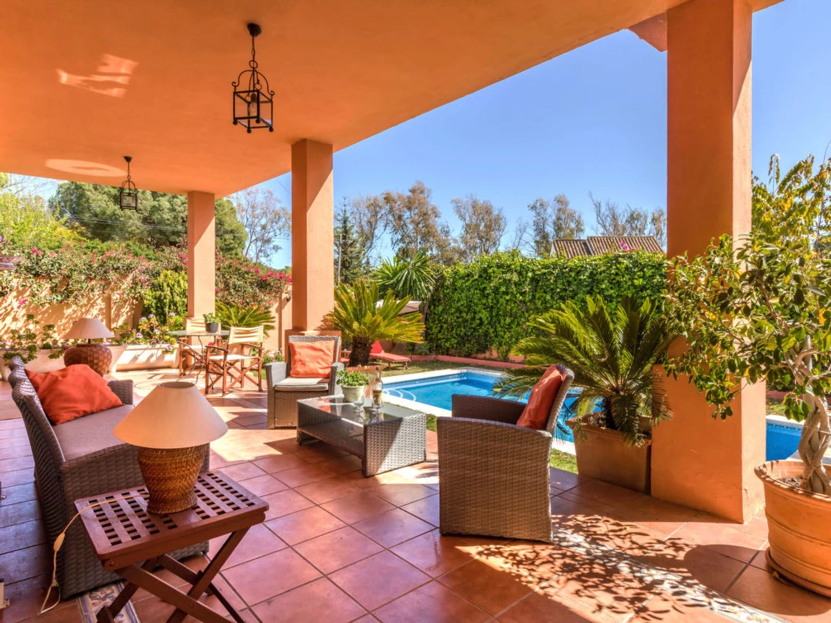 Elviria/ Las Chapas: Villa "Frankonia", built in 2000. 7 km from the centre of Marbella, in a sunny position, 100 m from the sea, 100 m from the beach. Private: property 800 m2 (fenced), garden, swimming pool angular (8 x 4 m, depth 100 - 200 cm,[hidden].). Outdoor shower, table tennis, parking on the premises. Supermarket 1.2 km, restaurant 70 m, bus stop 100 m, sandy beach "Real Zaragoza" 100 m. Children's playground 100 m. Part of the house is closed and unoccupied. Normal electricity consumption of 100 Kw/h per day included in the price. Above that there is a charge of 0,25€ per Kw/h.