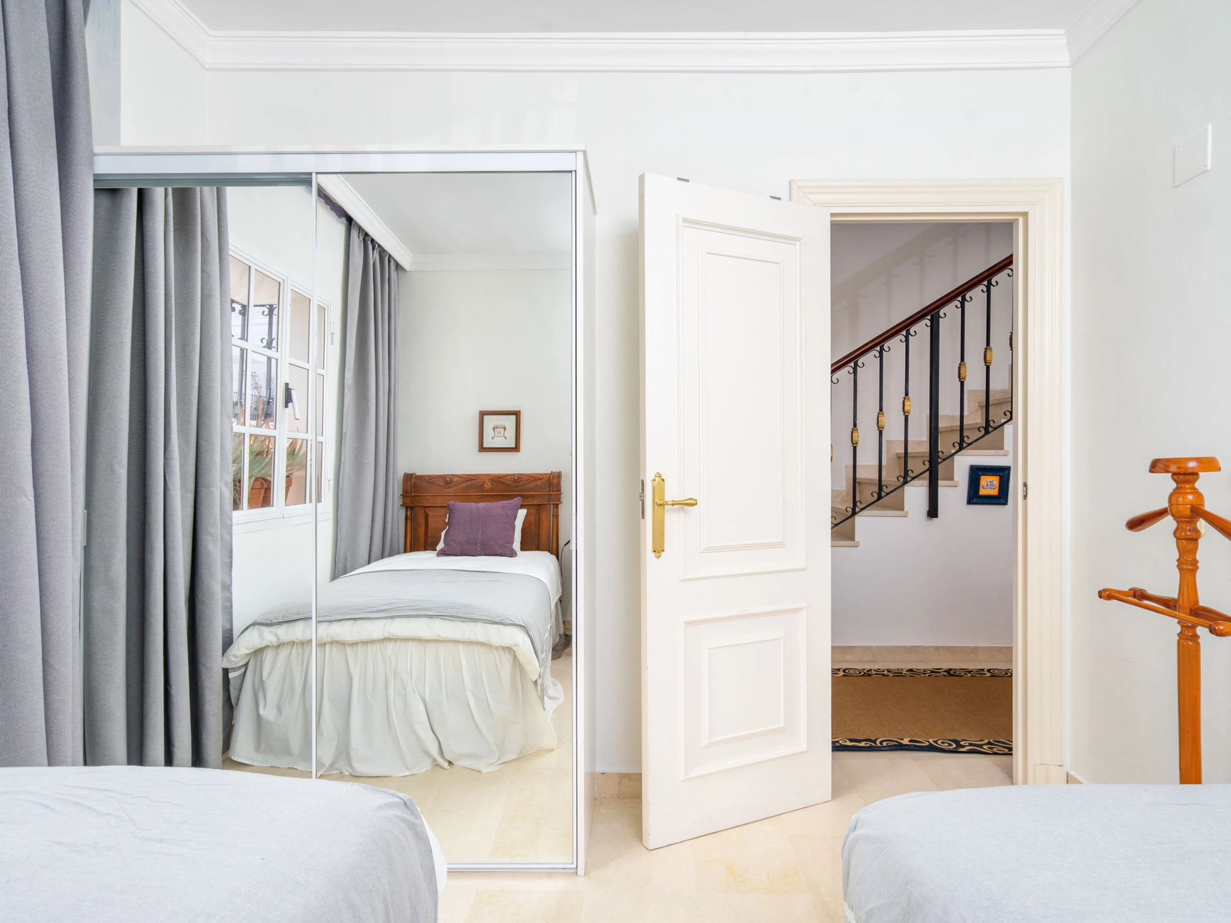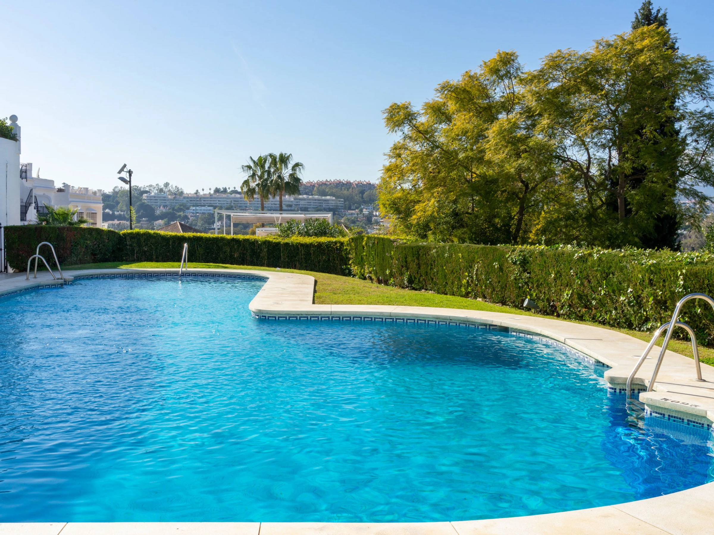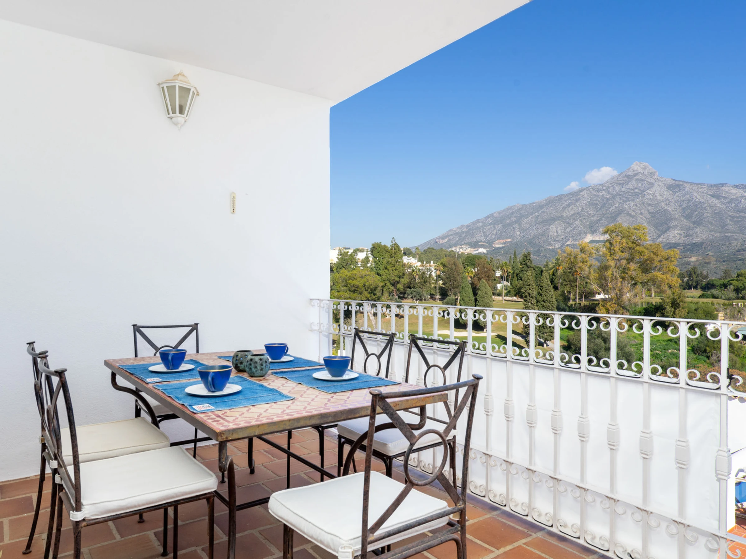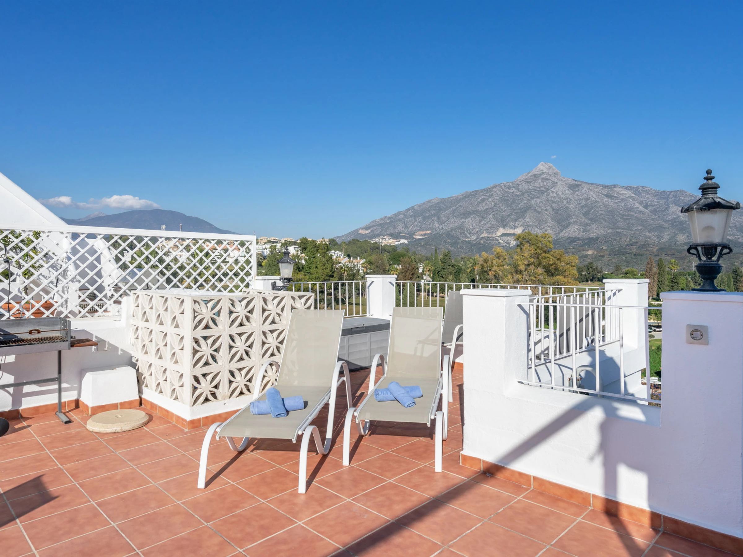 Nueva Andalucia: Beautiful, comfortable terraced house "Aloha Pueblo", 2 storeys. 3.5 km from the sea, 3.5 km from the beach. For shared use: park, garden with lawn, swimming pool heated (seasonal availability: [hidden] Shower/WC in the pool area, communal covered parking. Shopping centre 3 km, restaurant, bar 50 m, sandy beach "Puerto Banús" 3.3 km. Sports harbour 3.3 km, golf course (18 hole) 300 m. 24hr guard. Neighbourhood highly sensitive to noise. Quietness and good behaviour expected. The pool is heated from the week before Easter until November 1 aprox., except for the hottest months.