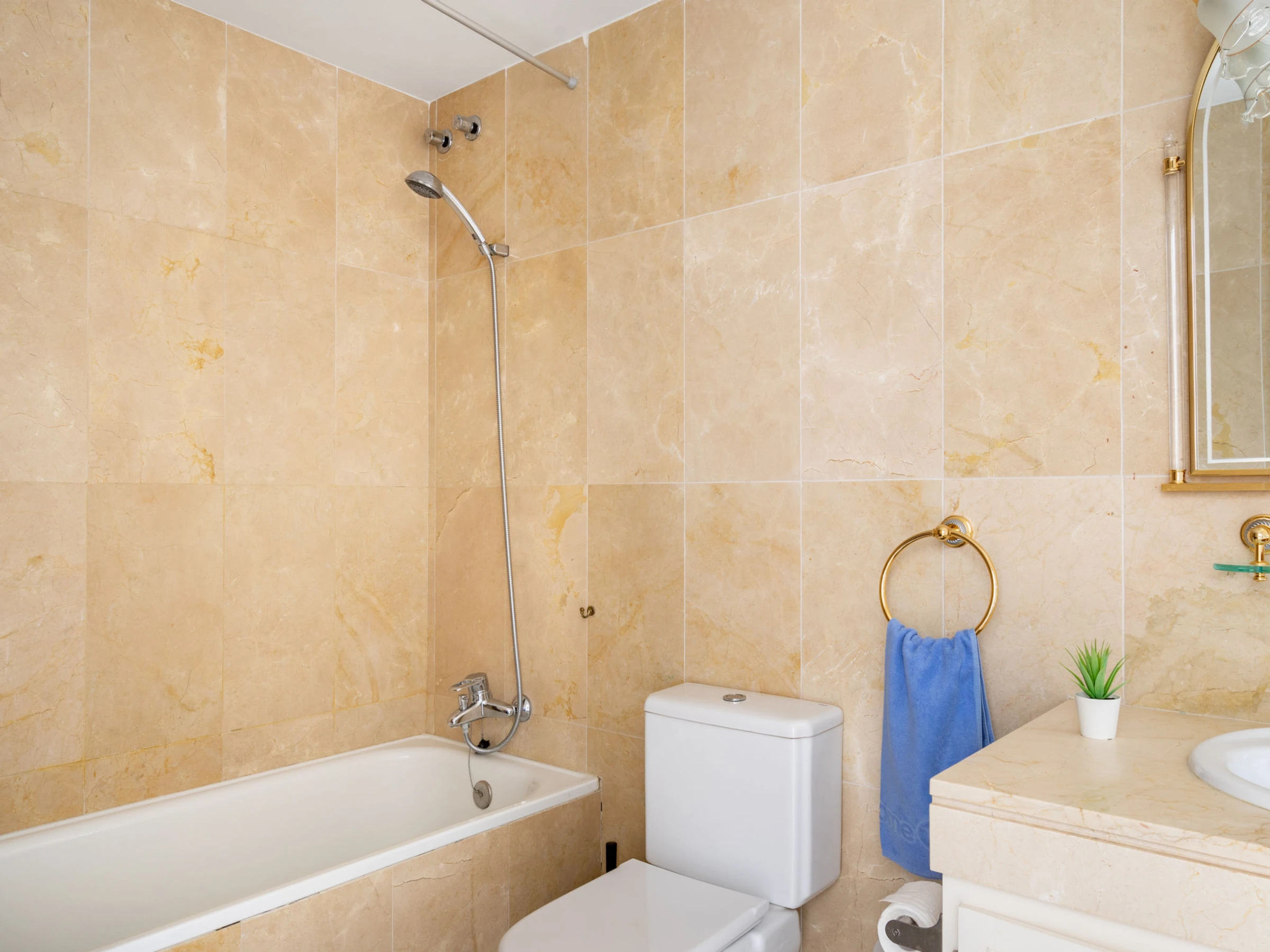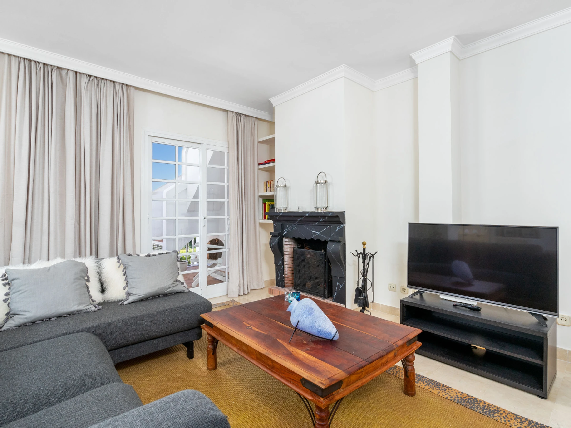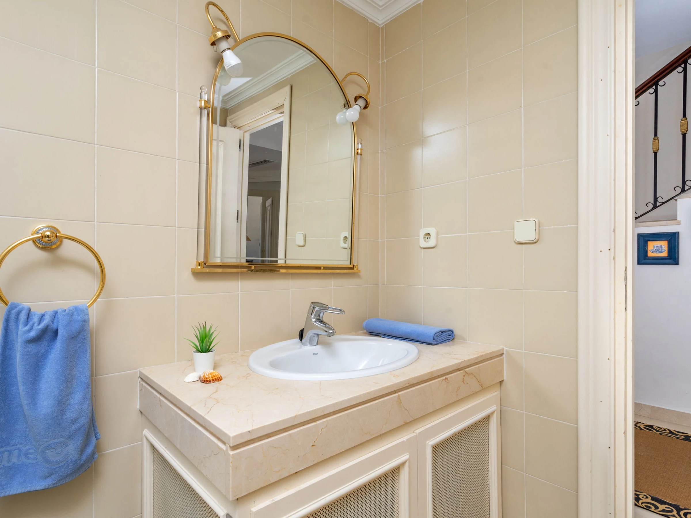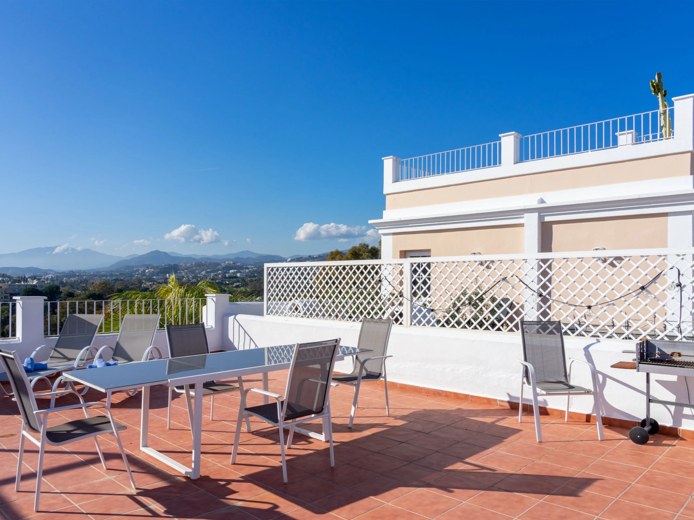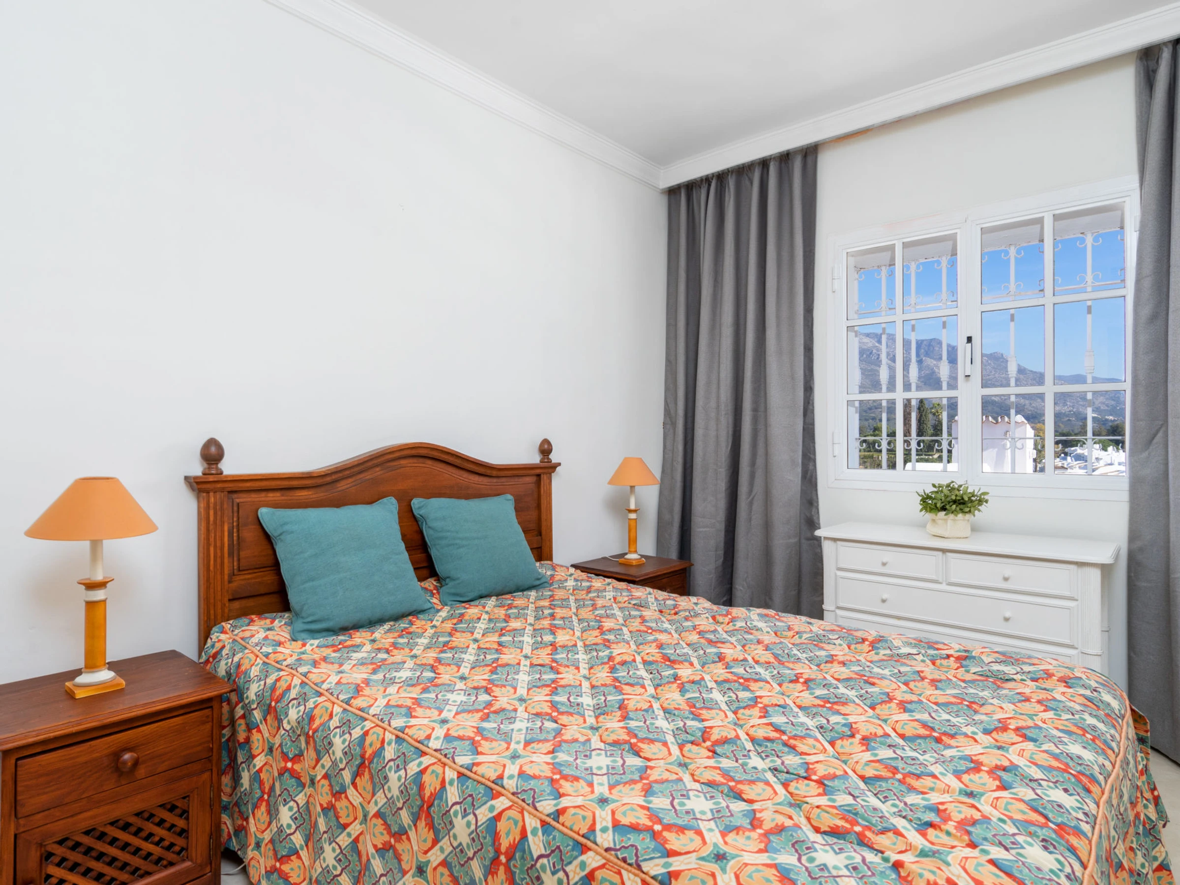 Nueva Andalucia: Beautiful, comfortable terraced house "Aloha Pueblo", 2 storeys. 3.5 km from the sea, 3.5 km from the beach. For shared use: park, garden with lawn, swimming pool heated (seasonal availability: [hidden] Shower/WC in the pool area, communal covered parking. Shopping centre 3 km, restaurant, bar 50 m, sandy beach "Puerto Banús" 3.3 km. Sports harbour 3.3 km, golf course (18 hole) 300 m. 24hr guard. Neighbourhood highly sensitive to noise. Quietness and good behaviour expected. The pool is heated from the week before Easter until November 1 aprox., except for the hottest months.