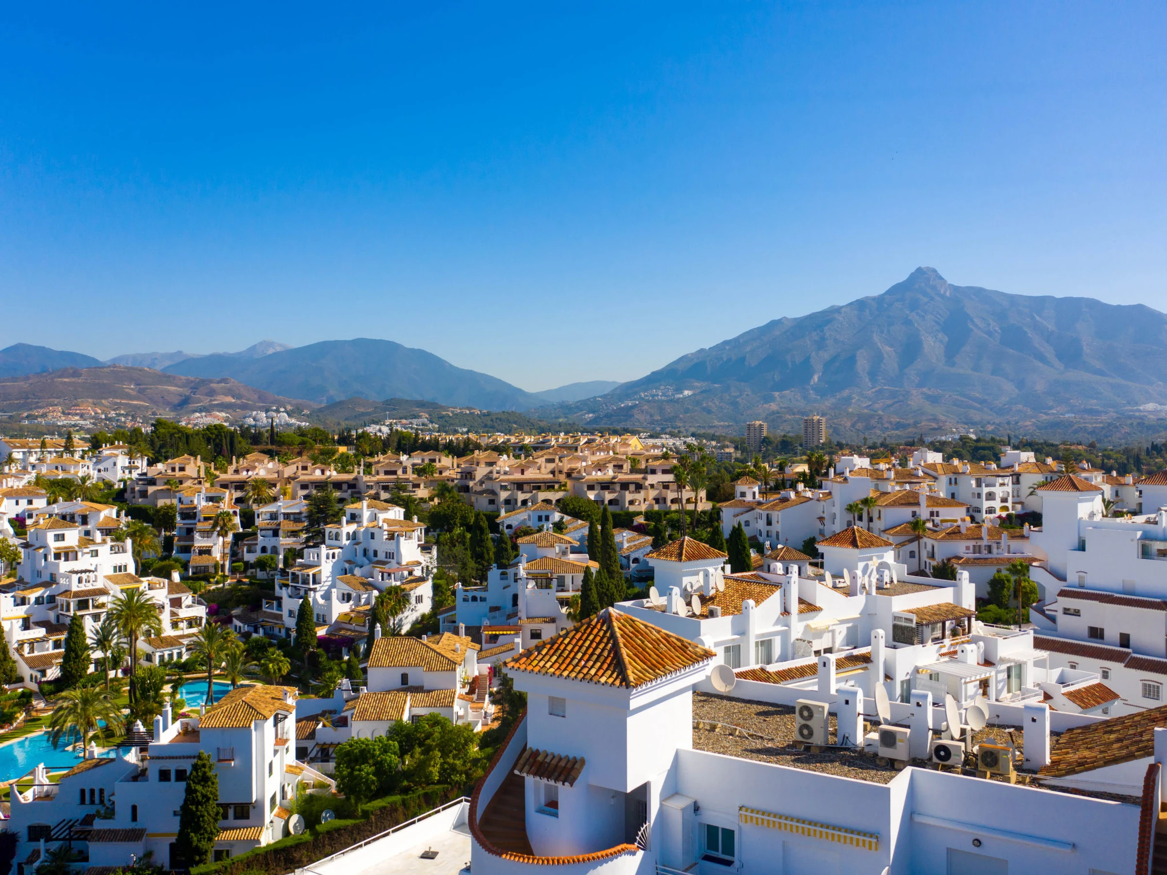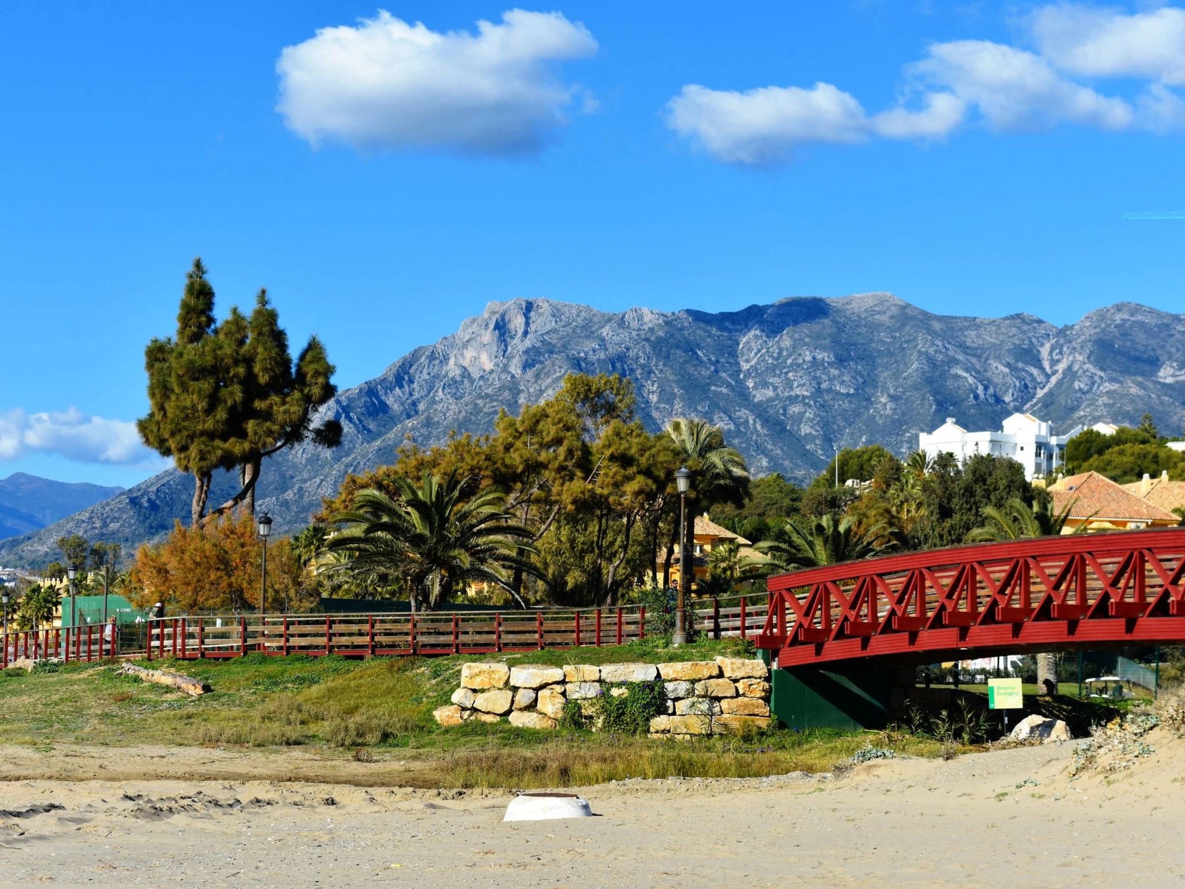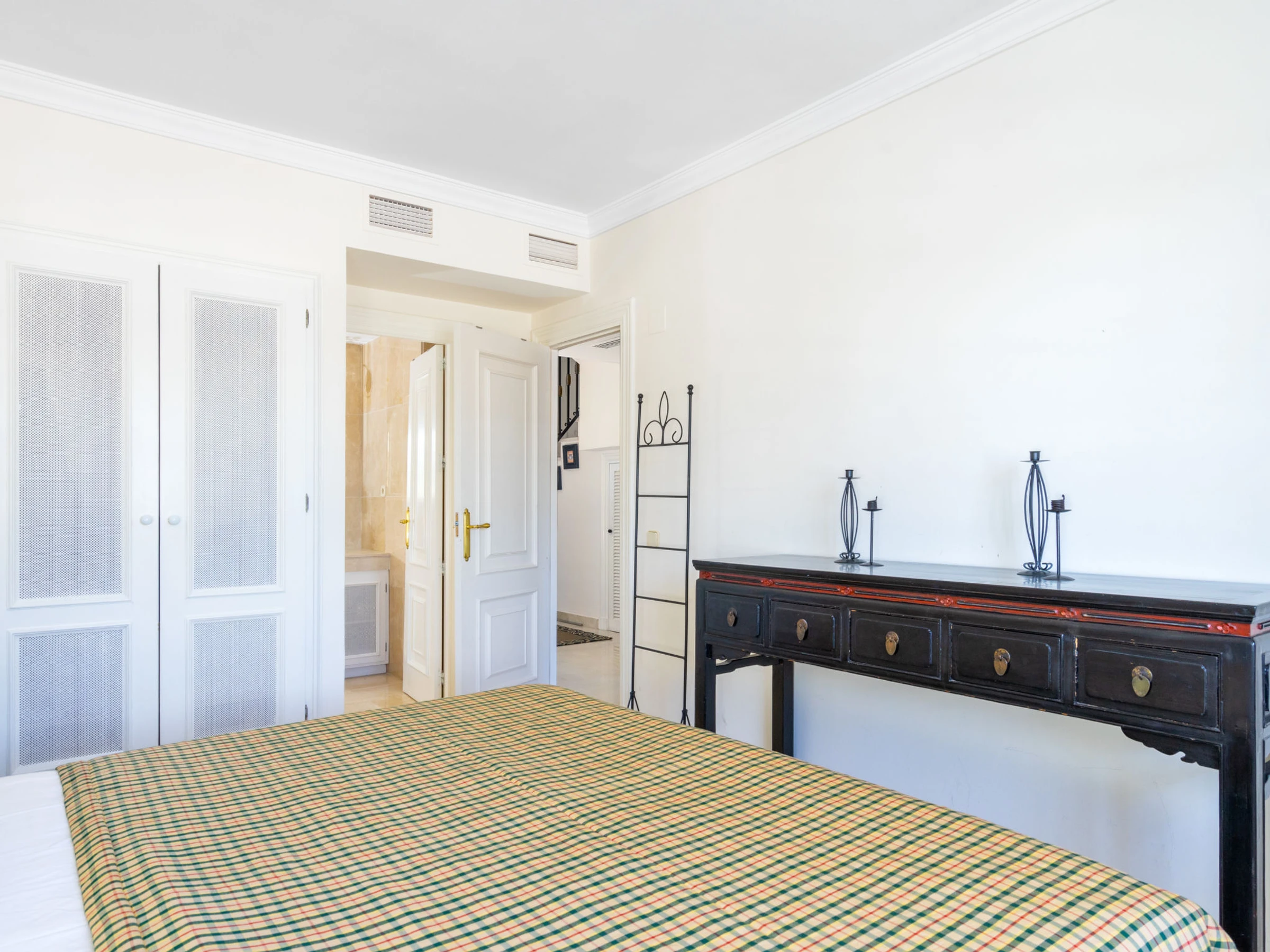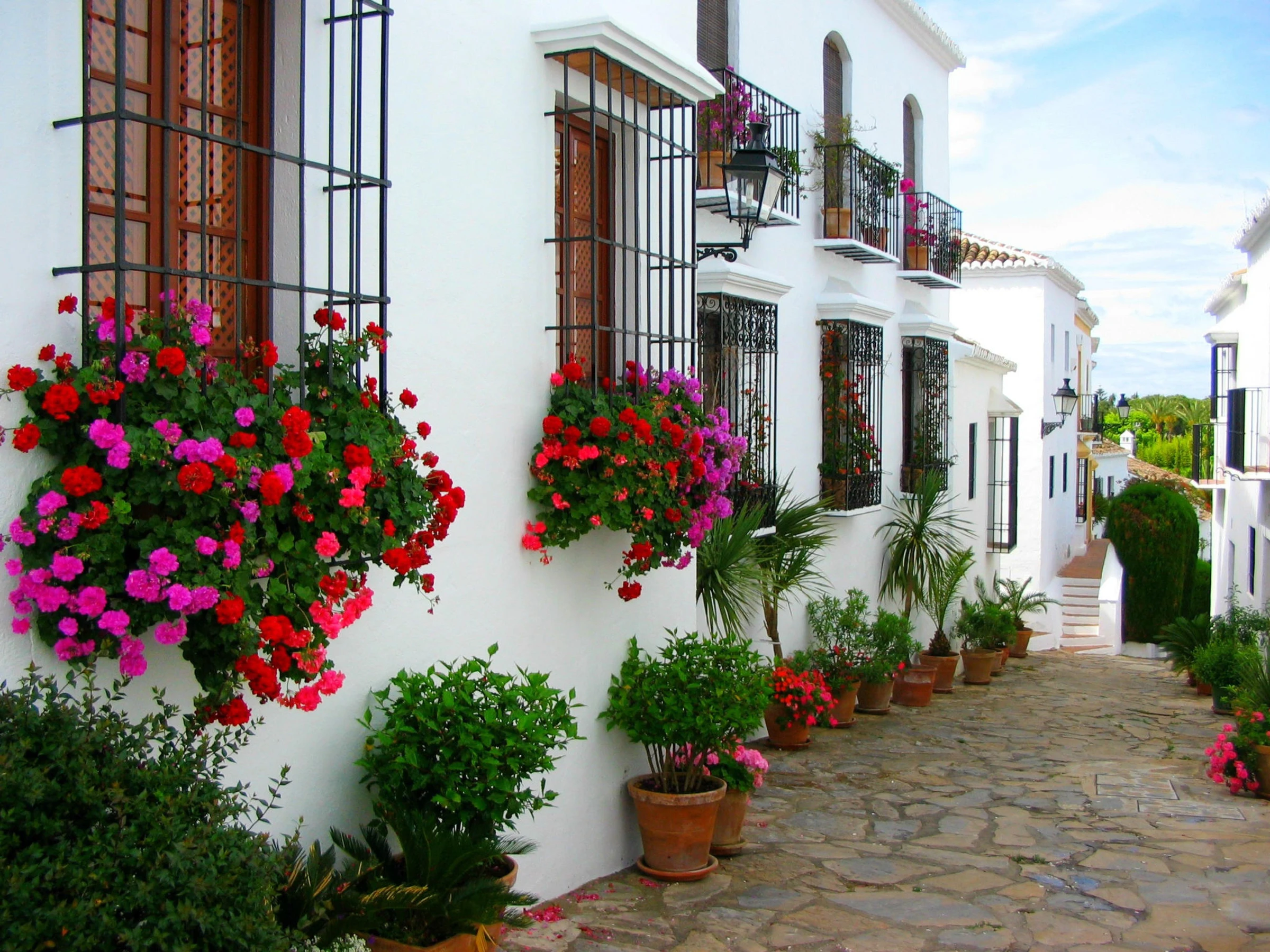 Nueva Andalucia: Beautiful, comfortable terraced house "Aloha Pueblo", 2 storeys. 3.5 km from the sea, 3.5 km from the beach. For shared use: park, garden with lawn, swimming pool heated (seasonal availability: [hidden] Shower/WC in the pool area, communal covered parking. Shopping centre 3 km, restaurant, bar 50 m, sandy beach "Puerto Banús" 3.3 km. Sports harbour 3.3 km, golf course (18 hole) 300 m. 24hr guard. Neighbourhood highly sensitive to noise. Quietness and good behaviour expected. The pool is heated from the week before Easter until November 1 aprox., except for the hottest months.