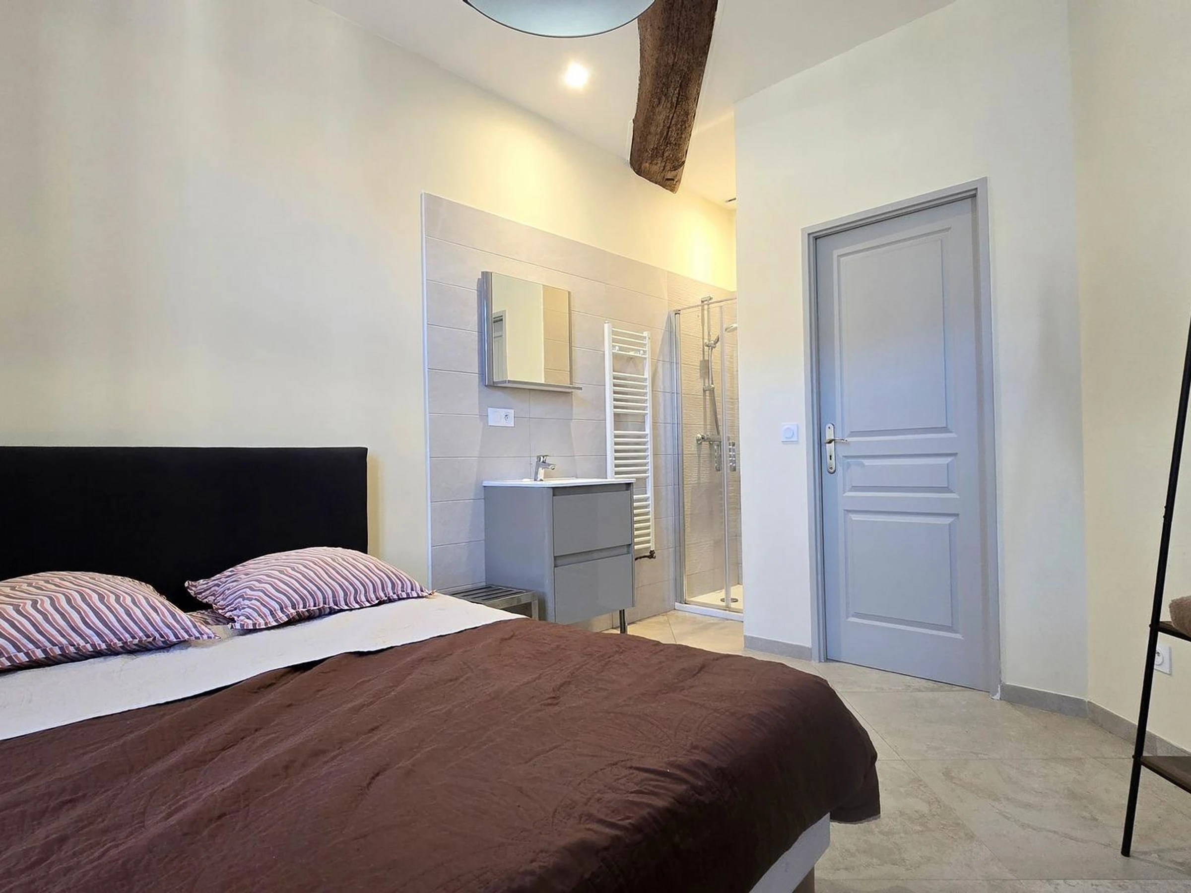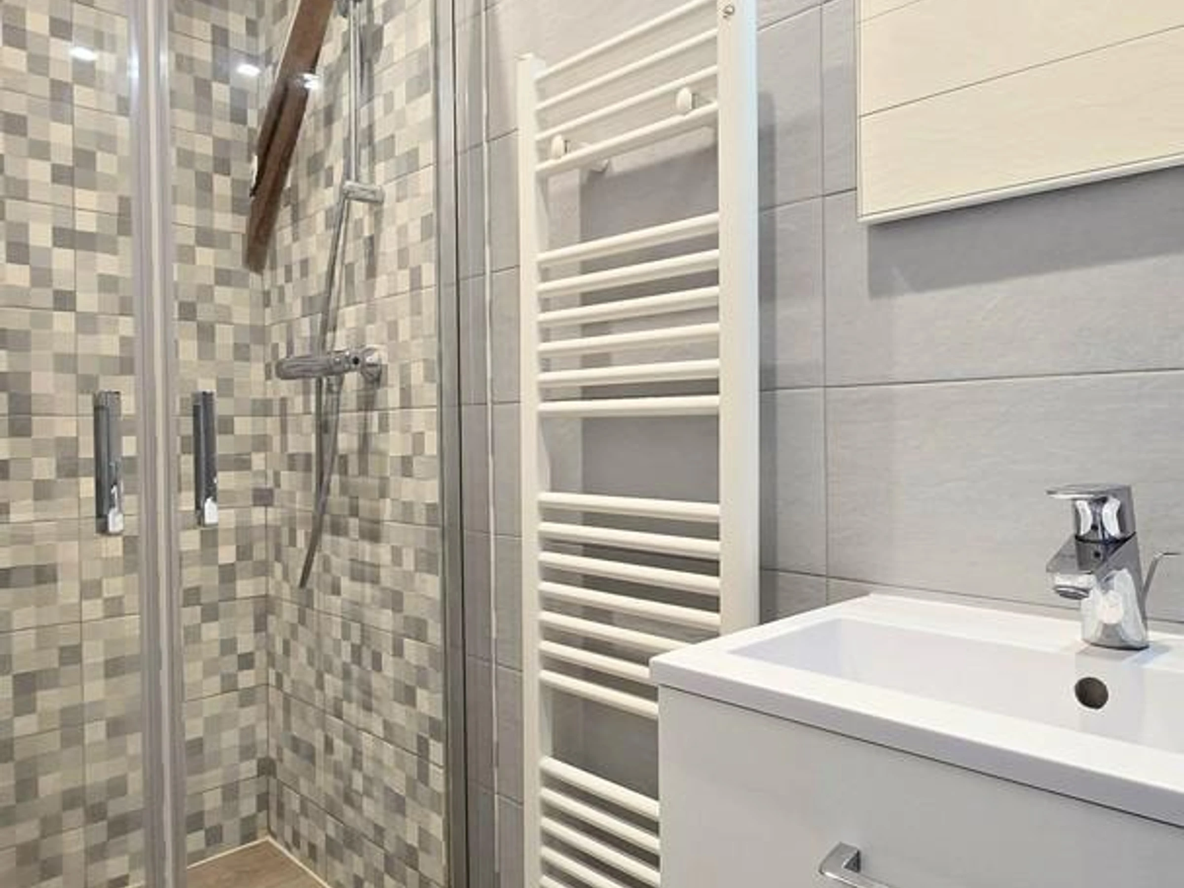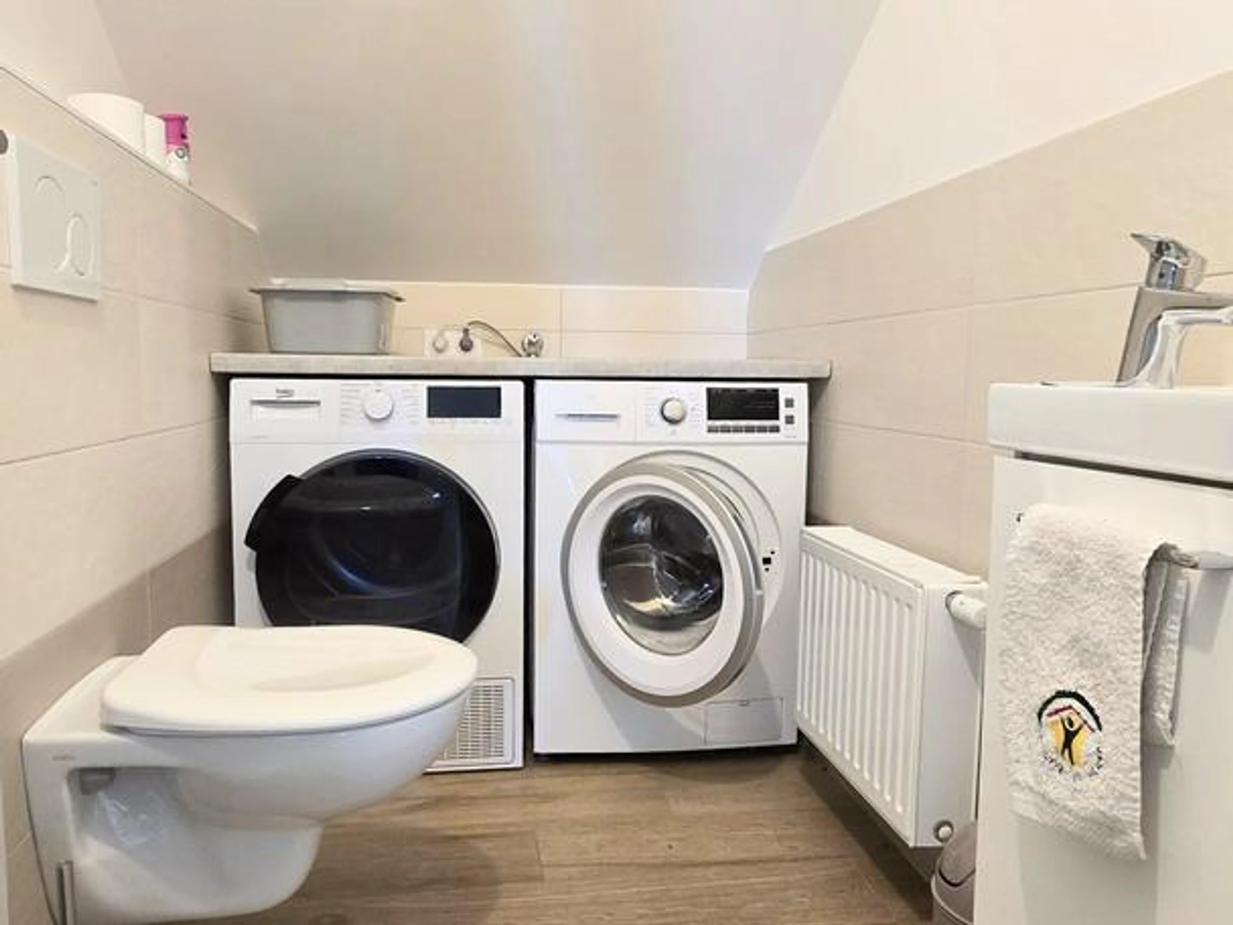 One bedroom with one 140x190cm bed and one 90x190cm bed. Bathroom with sink and shower (85x85). Separate toilet with washing machine and dryer.