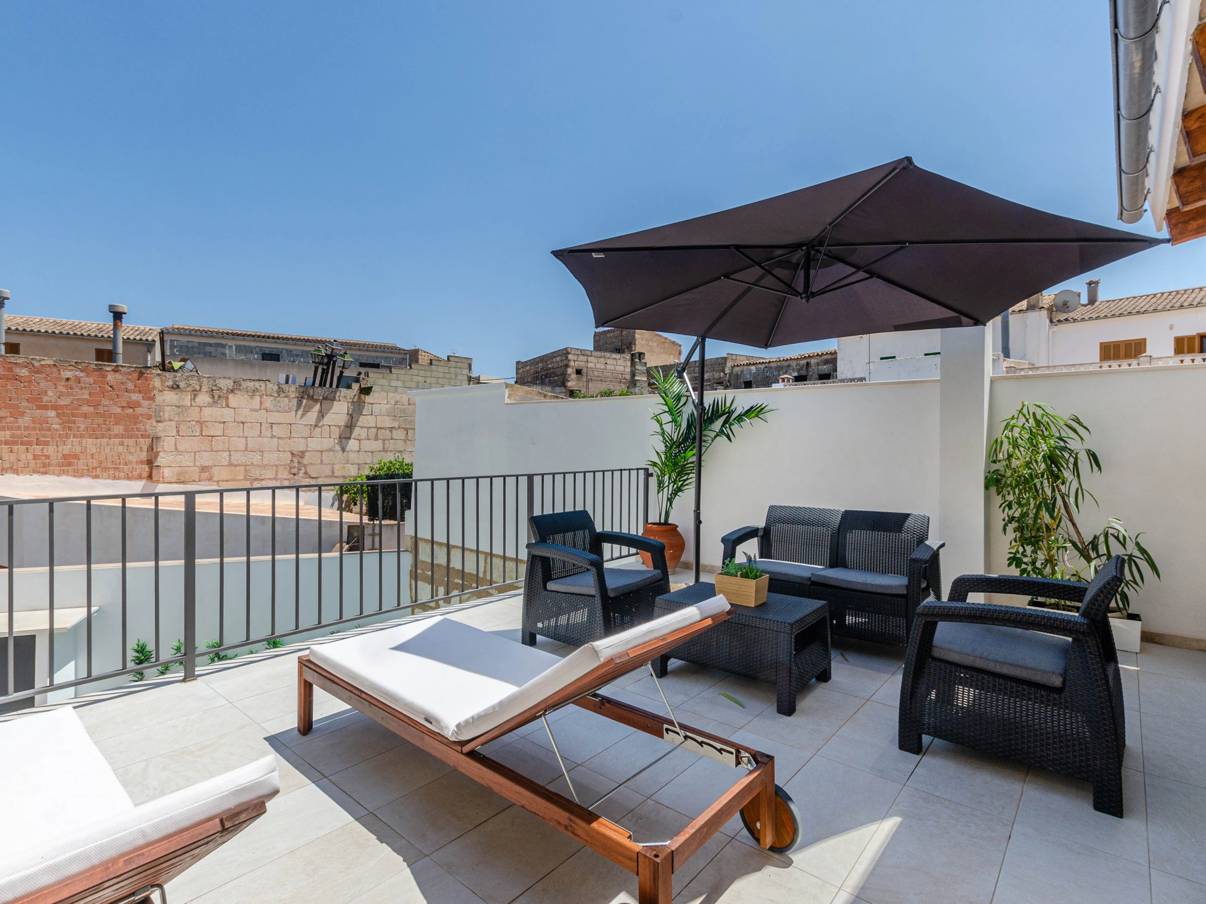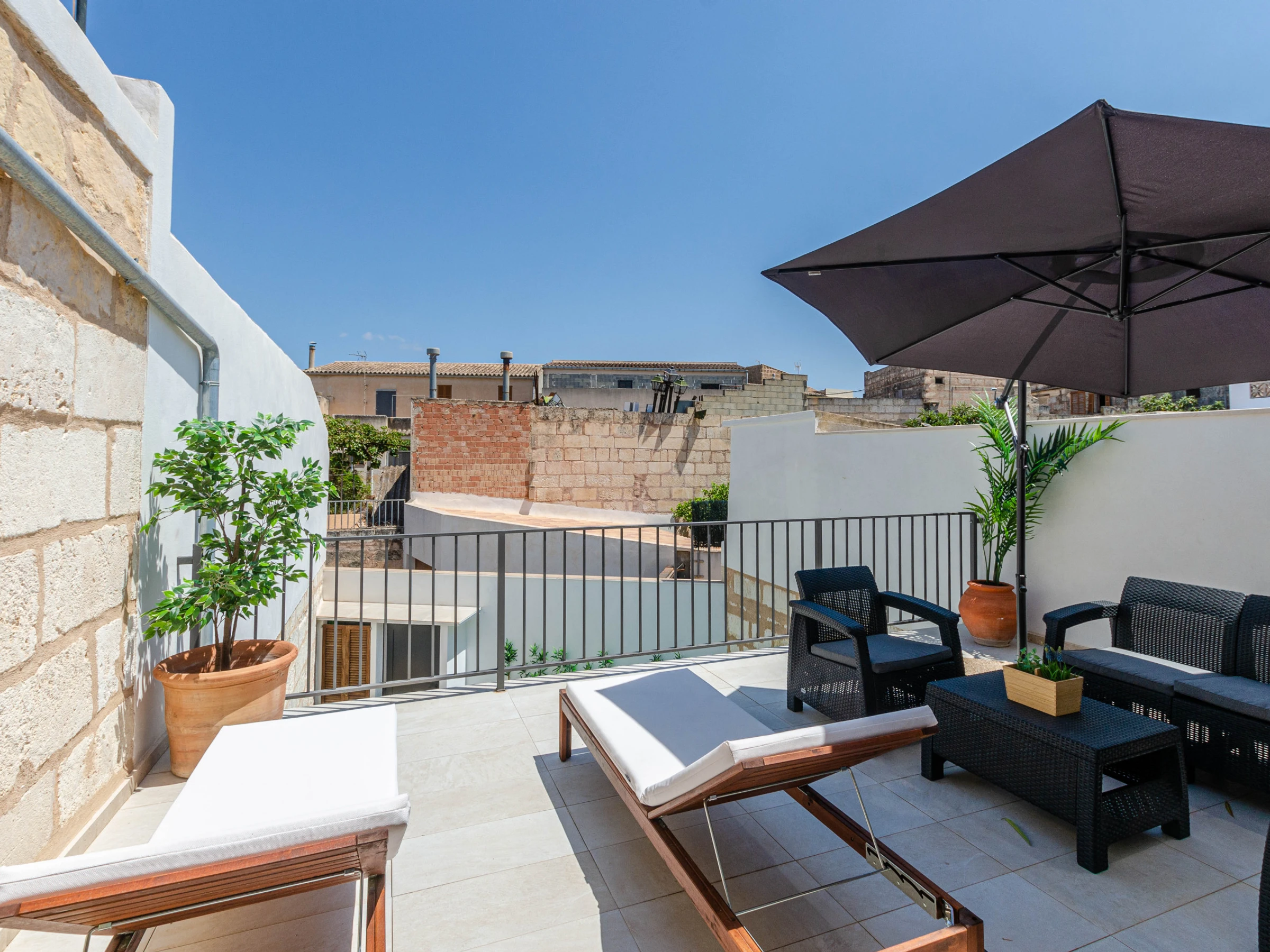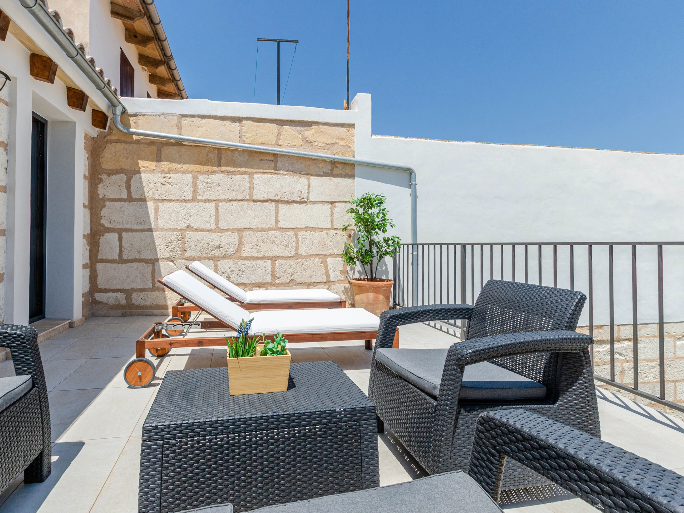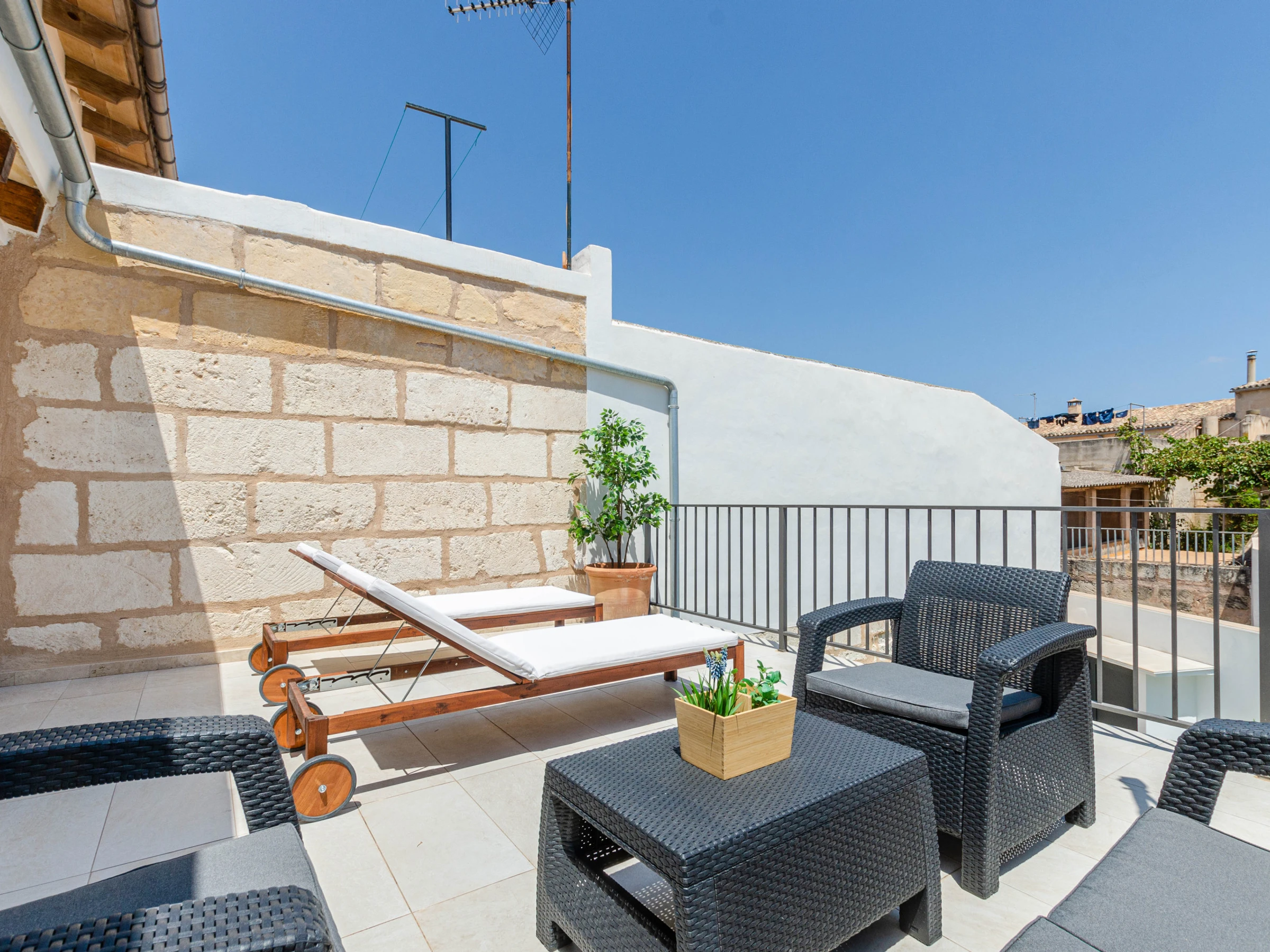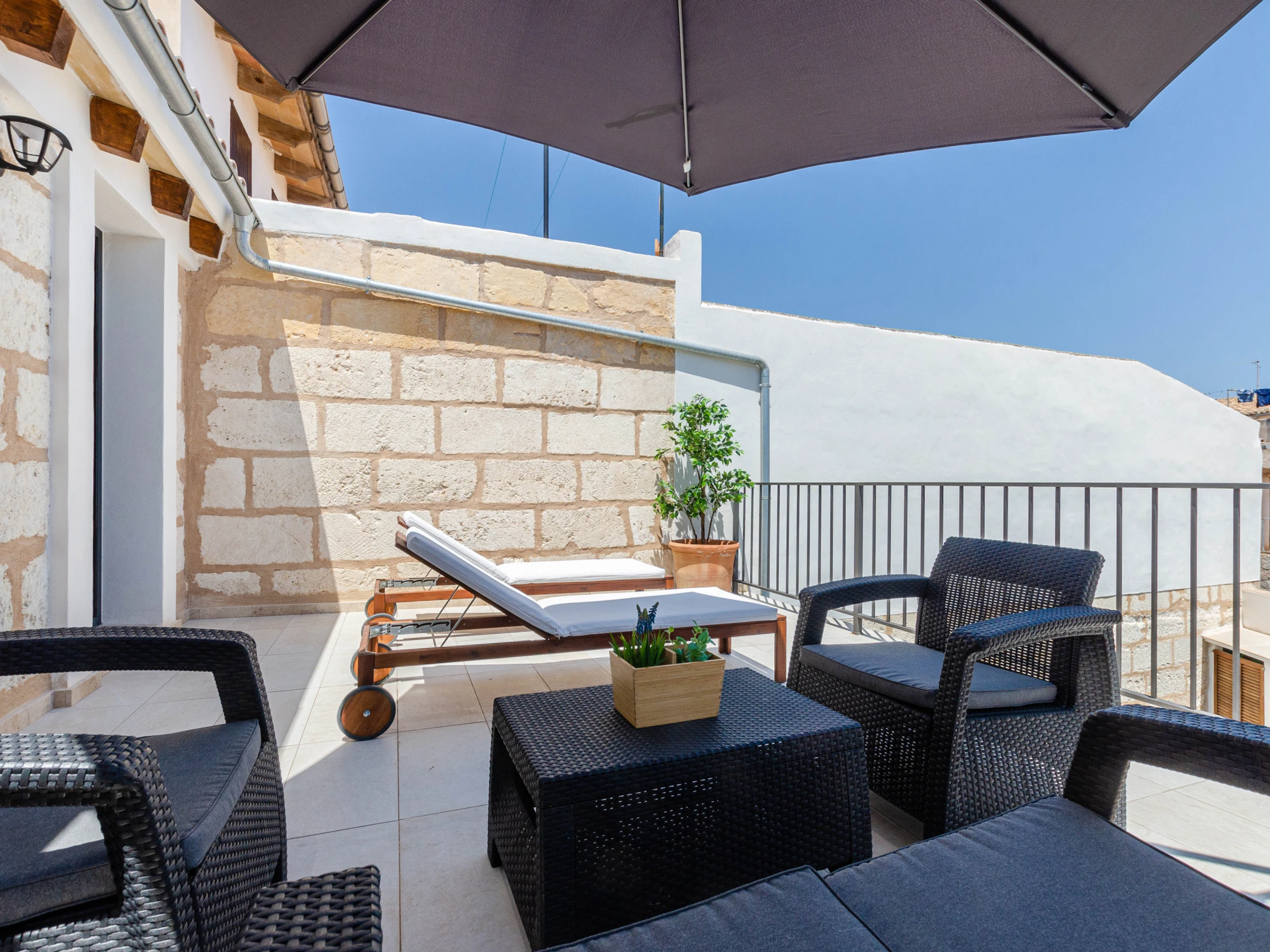This lovely house comes with 3 air conditioned bedrooms, an open kitchen, a private salt water pool and a furnished terrace. The pool has a size of 8 x 3 metres and a depth of 1.6 metres. There are 2 baths with shower and a hair dryer. The 3 bedrooms have closets and access to a balcony or terrace. Besides, euipment includes free Wifi, a TV with satellite channels and a kitchen utensils. The house has been renovated with lots of love. A cot and a high chair are available upon request. The master bedroom on the first floor has an air conditioning unit. The other bedroom upstairs doesn't have air conditioning, but if you leave the door open, the air from the larger bedroom will still cool the room. The bedroom on the ground floor doesn't have air conditioning either, but if you leave the door open, the air from the living room is enough to cool the room.
