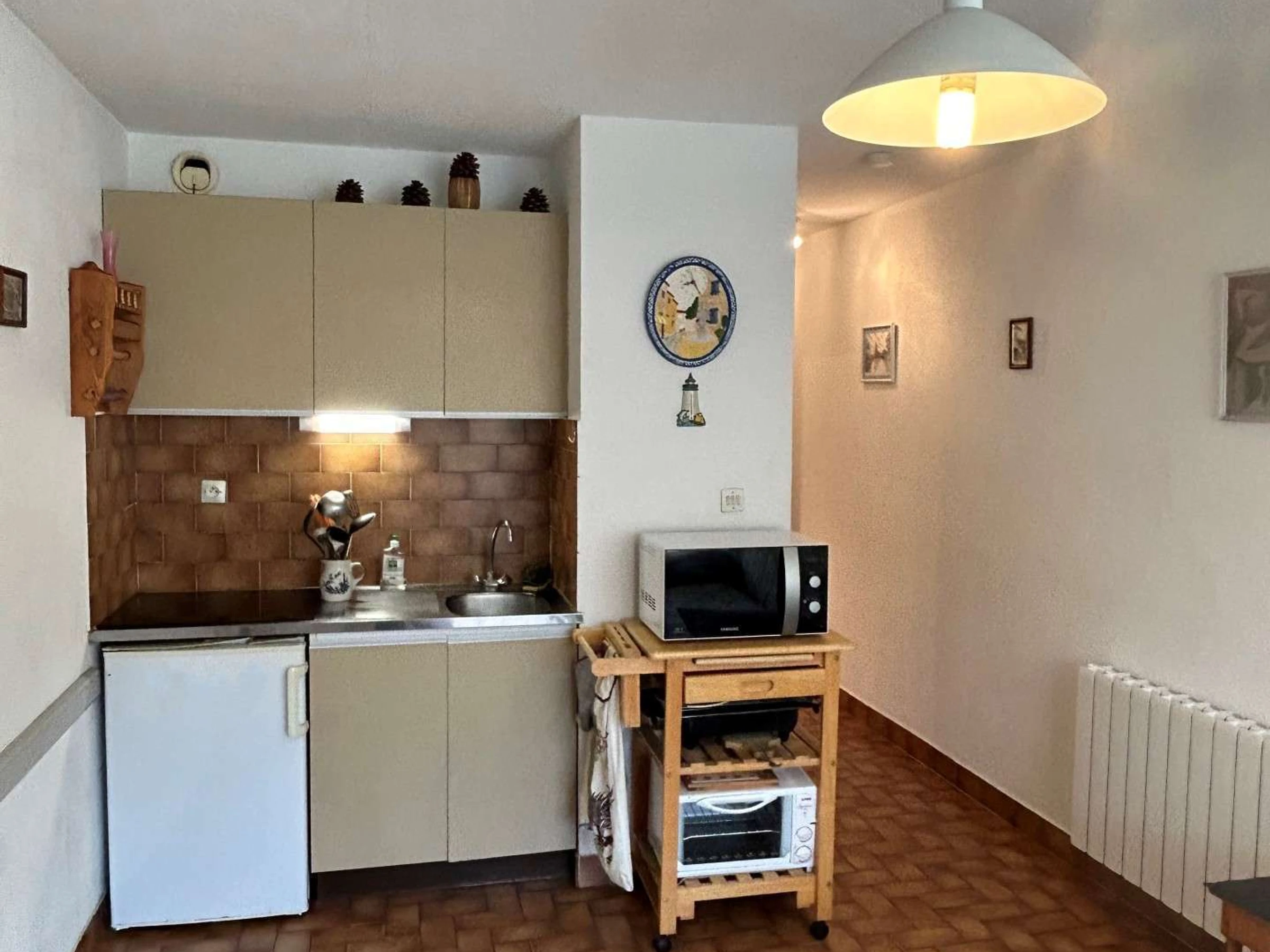 Equipped kitchen area with fridge/freezer, ceramic hob, microwave, electric coffee maker, electric kettle.