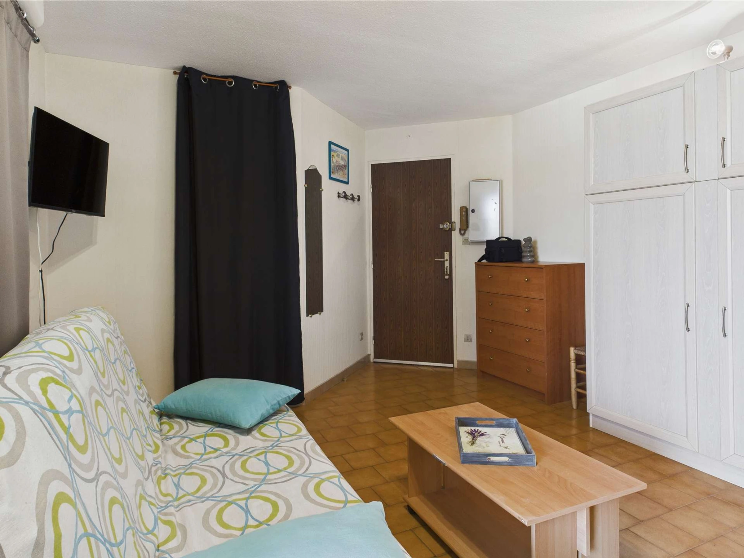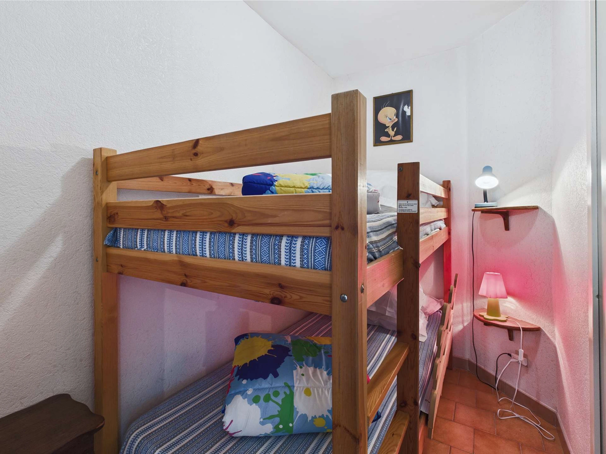 Entrance into the living room with a 140 cm pull-down bed and TV, equipped kitchenette with microwave, oven, 4 electric burners, and a fridge-freezer. Cabin area with bunk beds. Bathroom with shower, toilet, and sink.