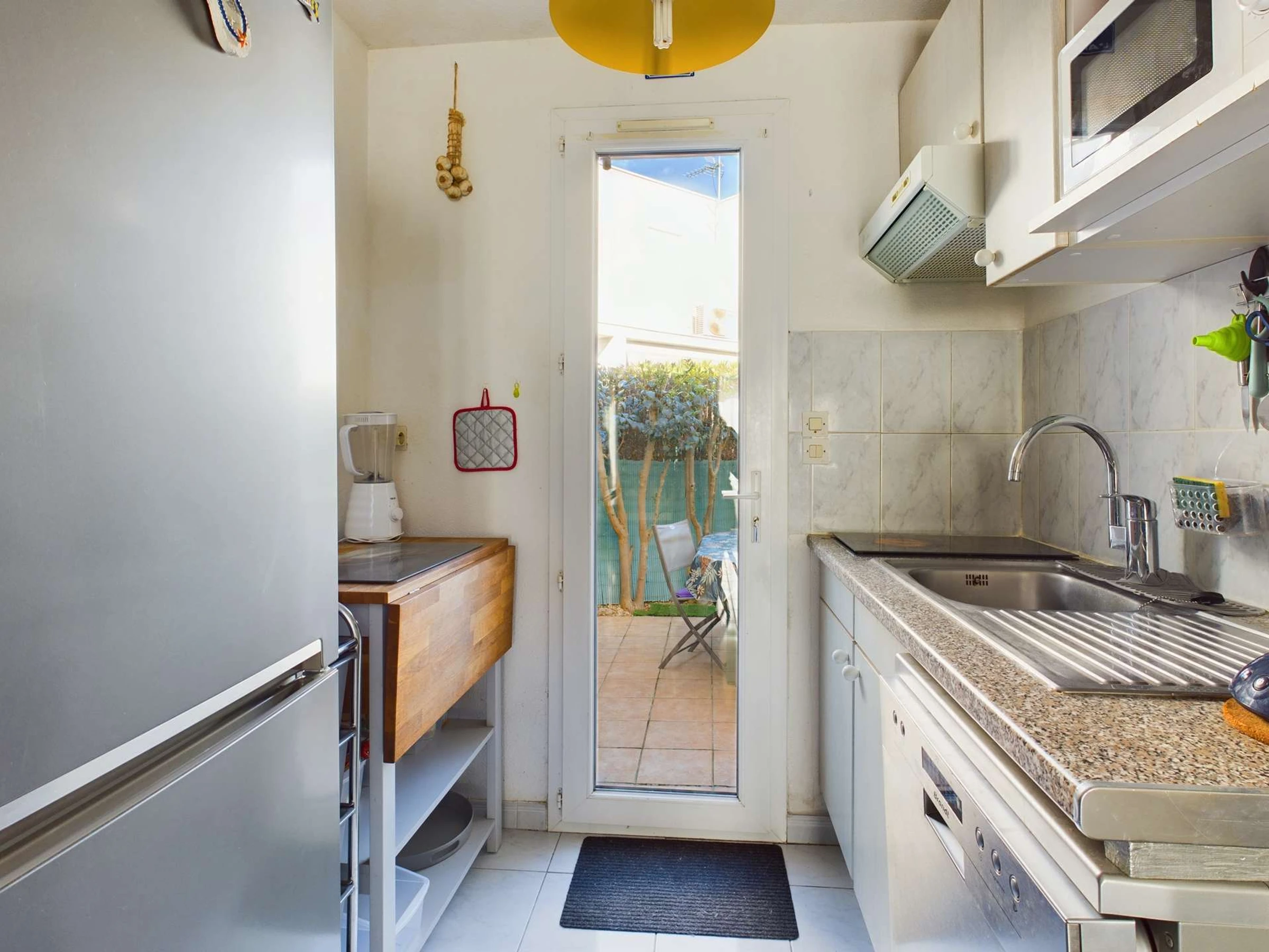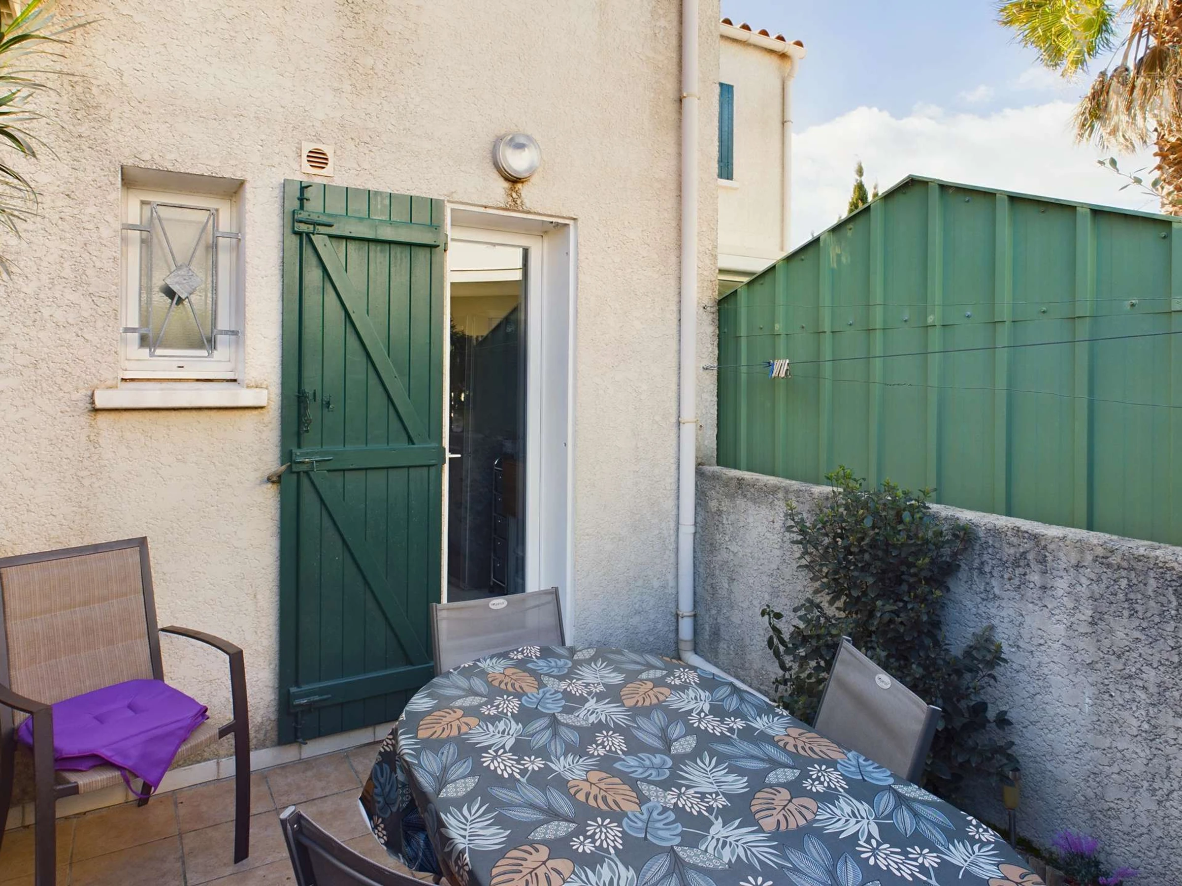 French window opening onto a terrace with parasol, garden furniture.