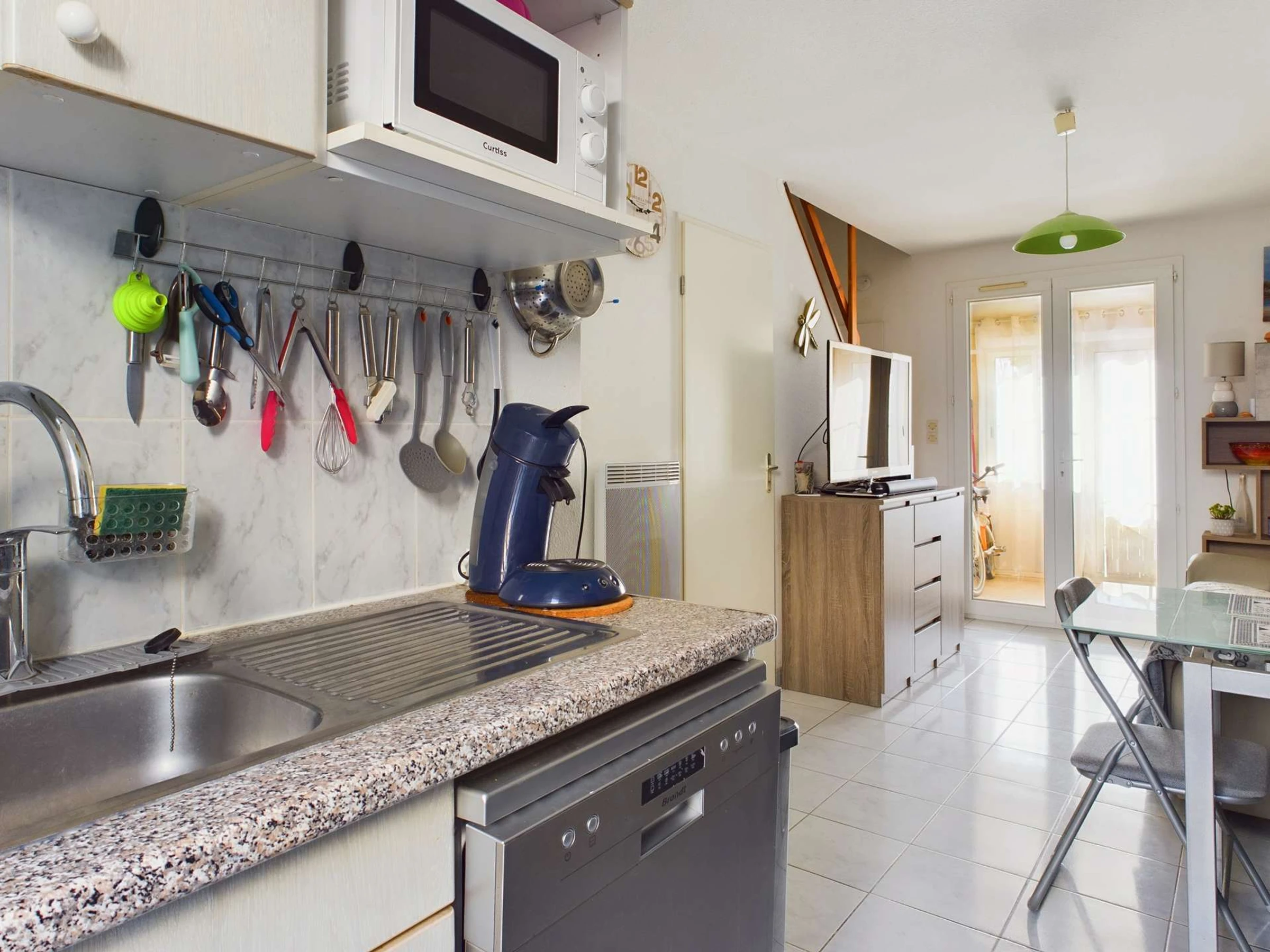 Composed on the ground floor: a living room with television, a kitchen area equipped with ceramic hob, a hood, a microwave, a large refrigerator with freezer section and a dishwasher.