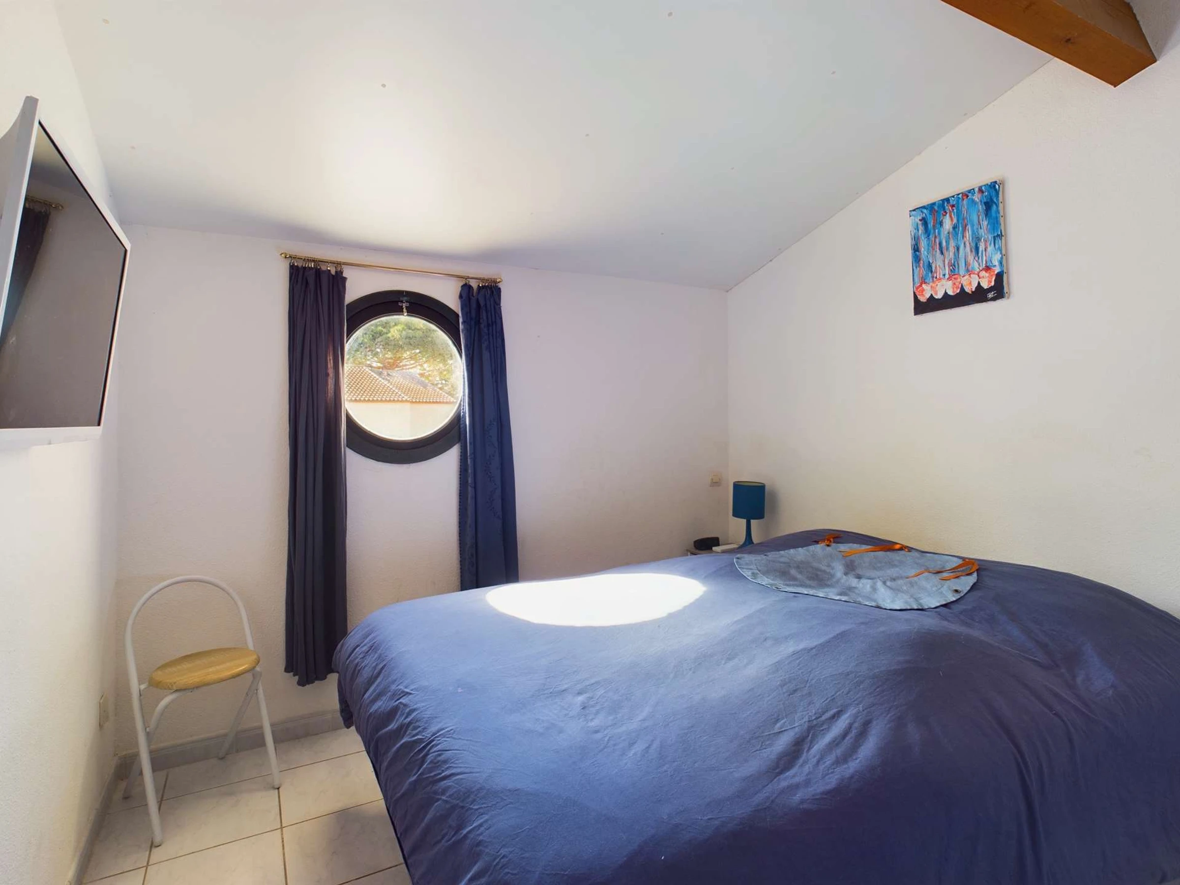 Upstairs, bedroom with 1 140 cm bed and a bedroom with 3 90 cm beds.