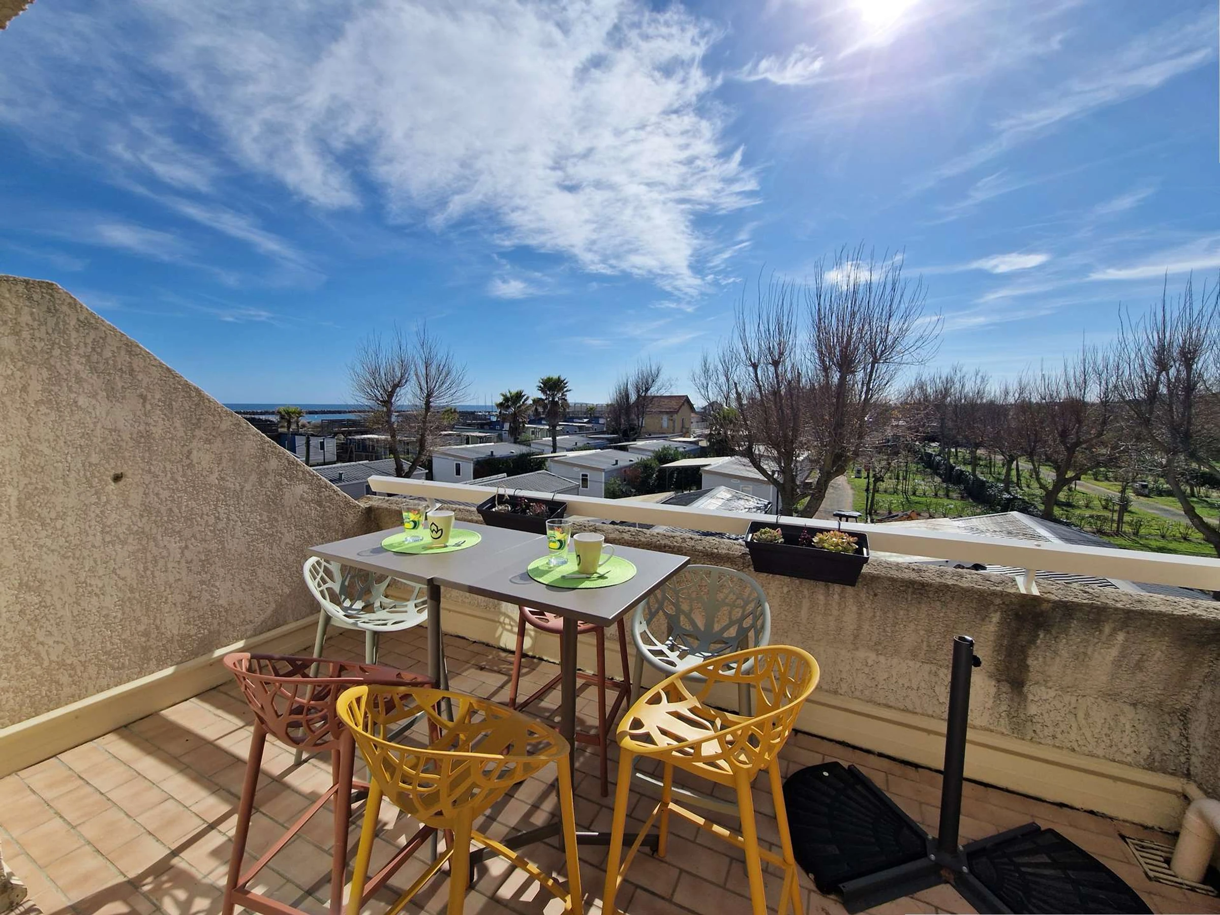 The terrace offers a pleasant space to relax, with armchairs and parasol to enjoy the mild climate. There is a partial side sea view.