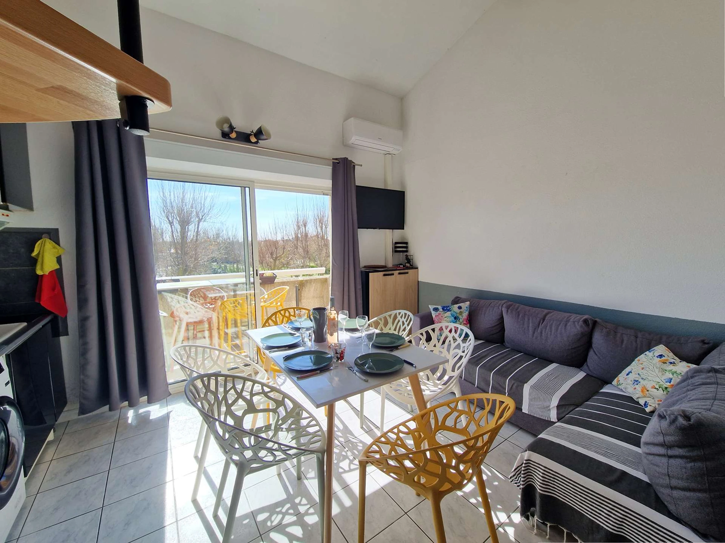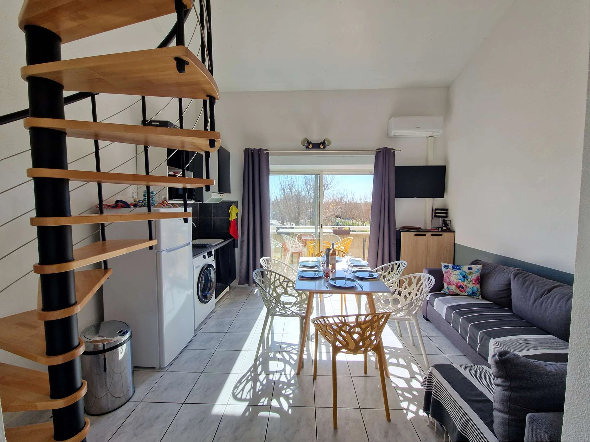 The air-conditioned living area features a sofa bed, TV, dining table and chairs. The open kitchen is fully equipped with a ceramic hob, fridge/freezer, microwave, washing machine, and electric coffee maker.