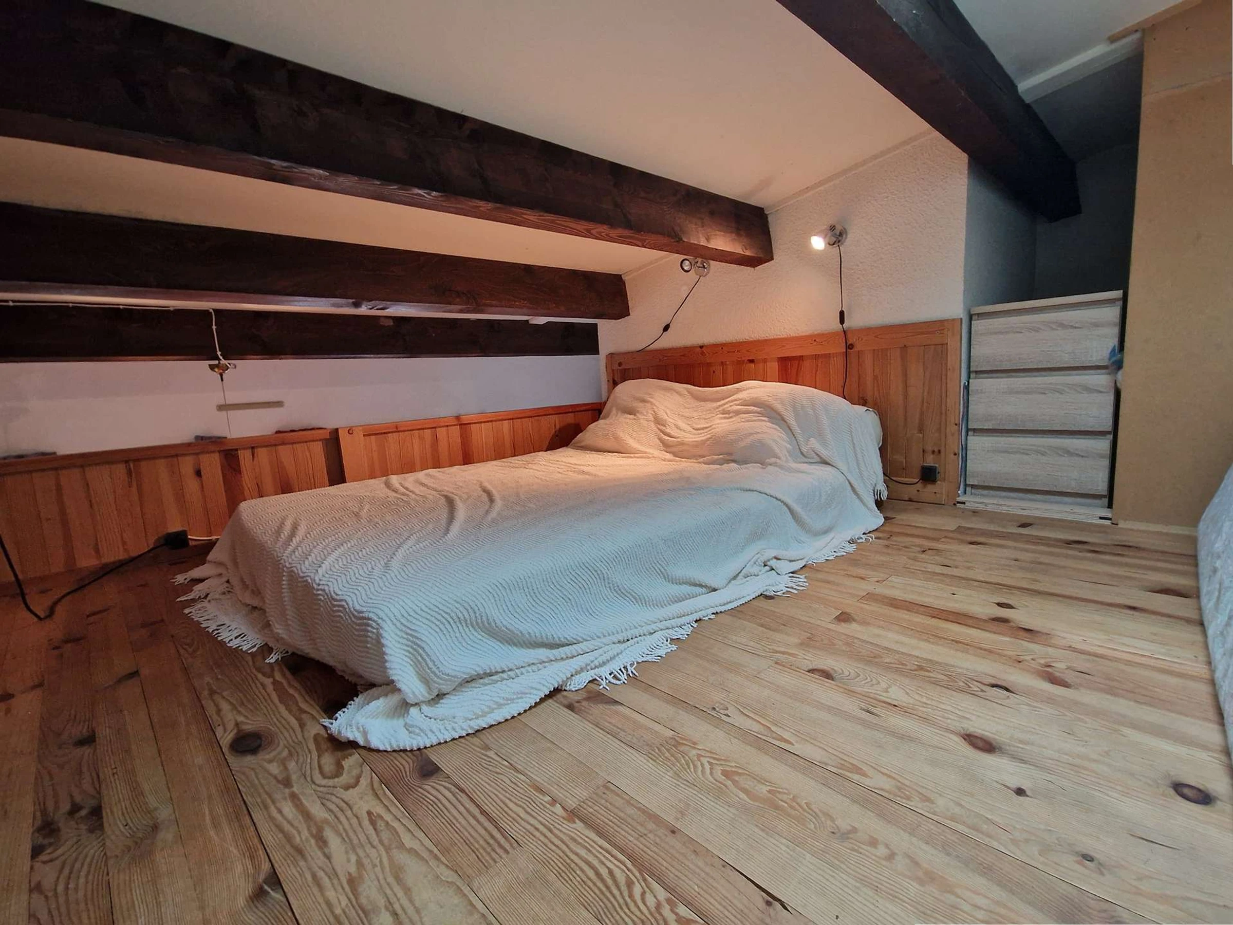 The mezzanine (low ceiling: height between 1 m and 1.40 m) provides a sleeping area for two with a mattress on the floor (very simple arrangement).