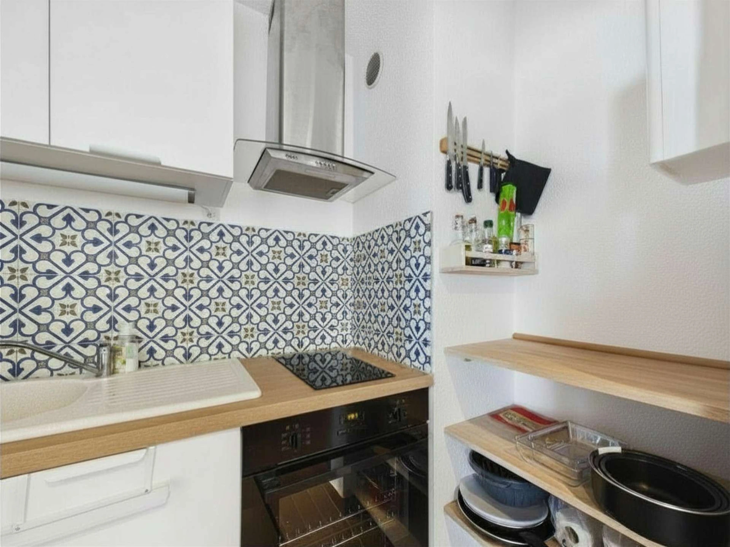 The fully equipped kitchenette includes an oven, a fridge-freezer, a microwave, and two induction hobs.