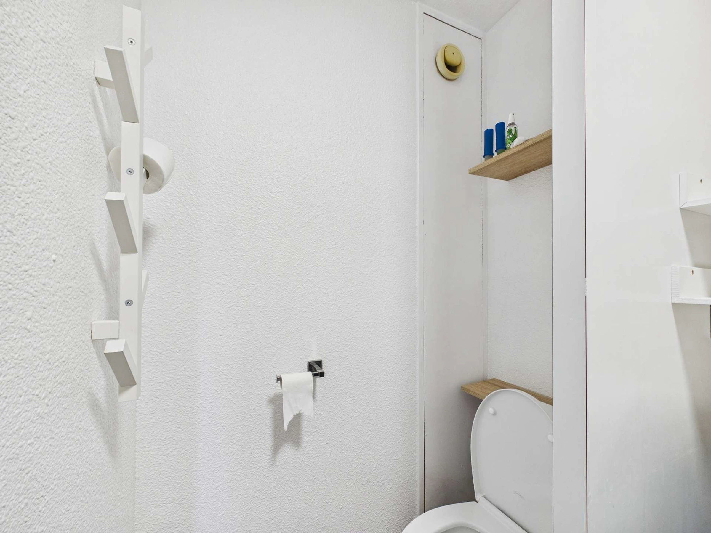 The accommodation comprises a living room with an alcove bedroom, furnished with a double bed and separated from the living room by a curtain, as well as a sleeping cabin area with bunk beds.