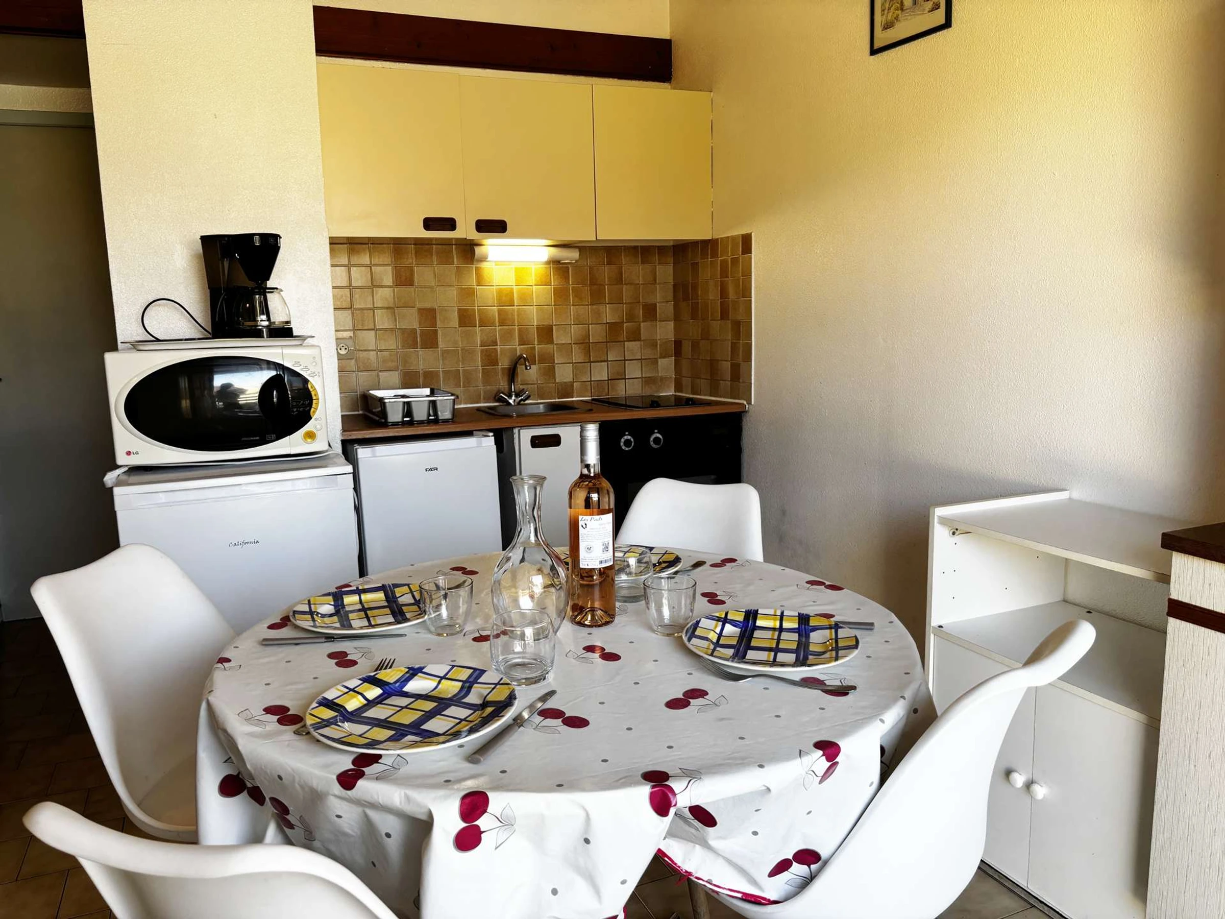 A kitchenette with a compact fridge, ceramic hob, oven, microwave, coffee maker, toaster, dishes...