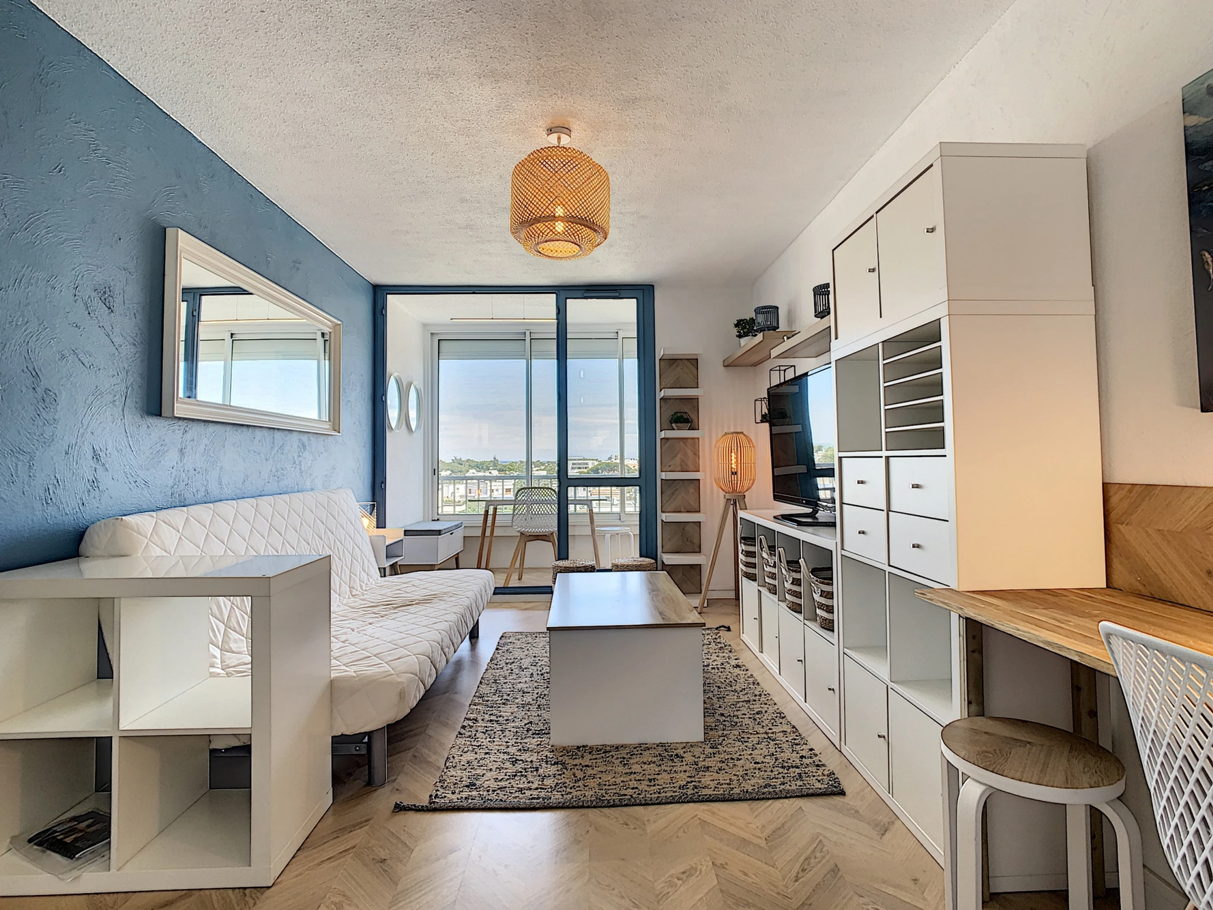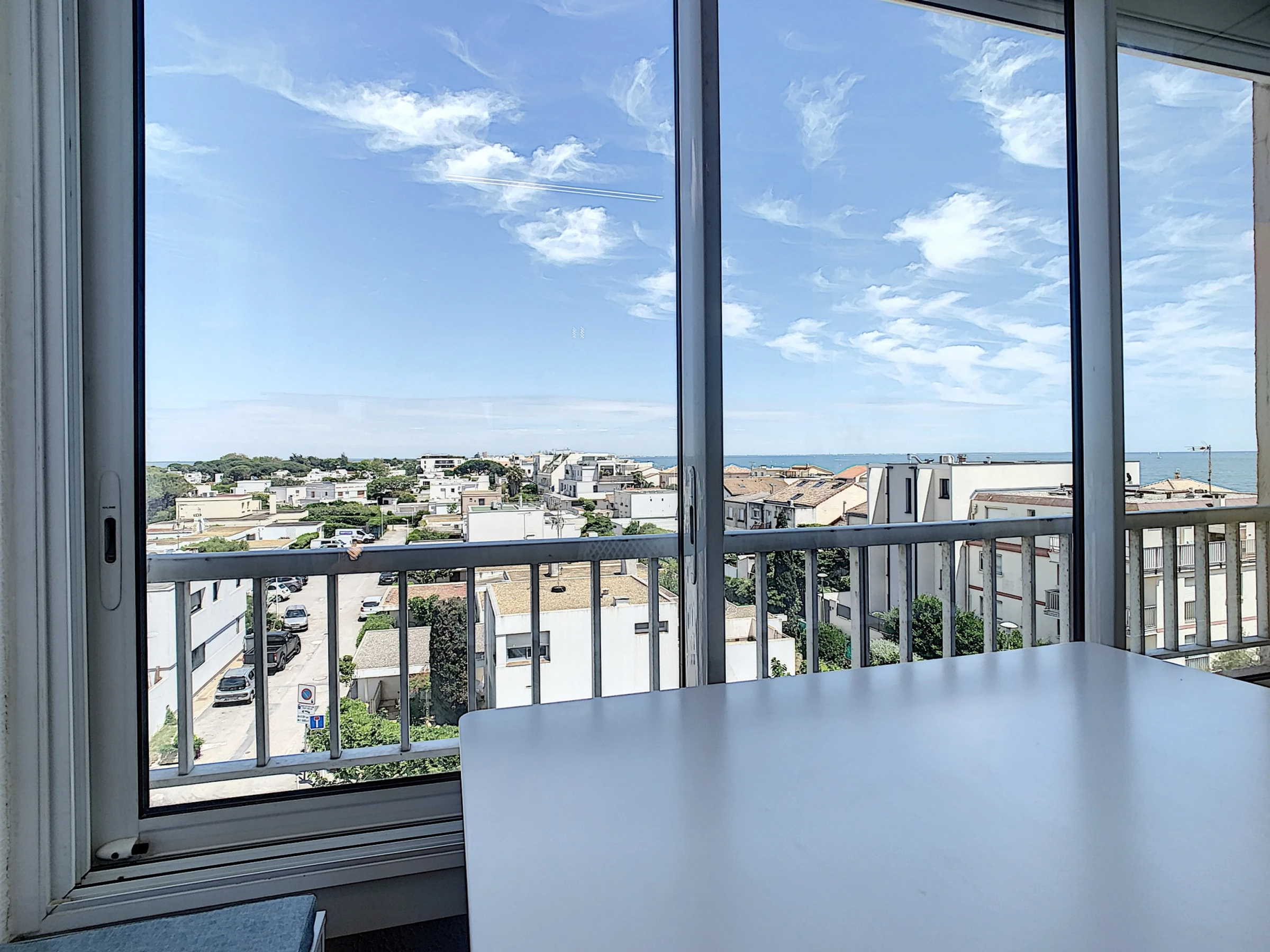 Very nice renovated studio with cabin, facing east, located on the 4th floor of a residence with elevator just steps from the beach. Accommodates 4 people, it includes a living room with a sofa bed, an equipped kitchenette, a recess with bunk beds, a bathroom with toilet, and a glassed-in loggia with views of the sea and ponds. Newly furnished and equipped, fully renovated, very bright. Close to the beach, market, and shops.