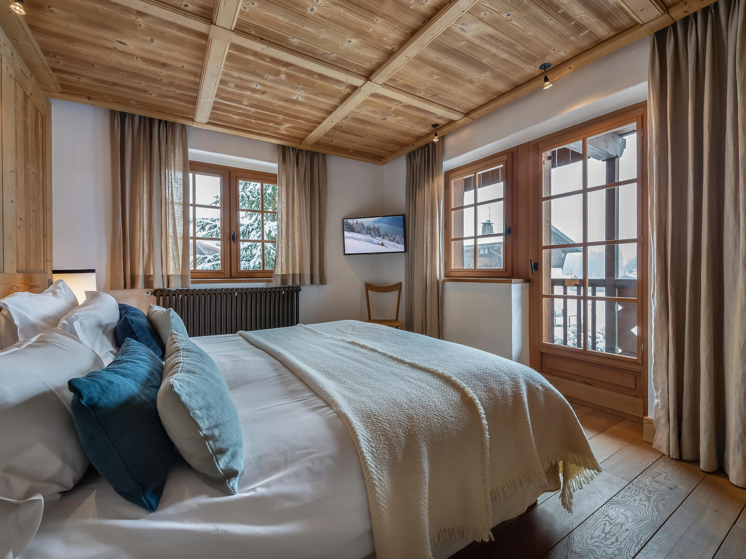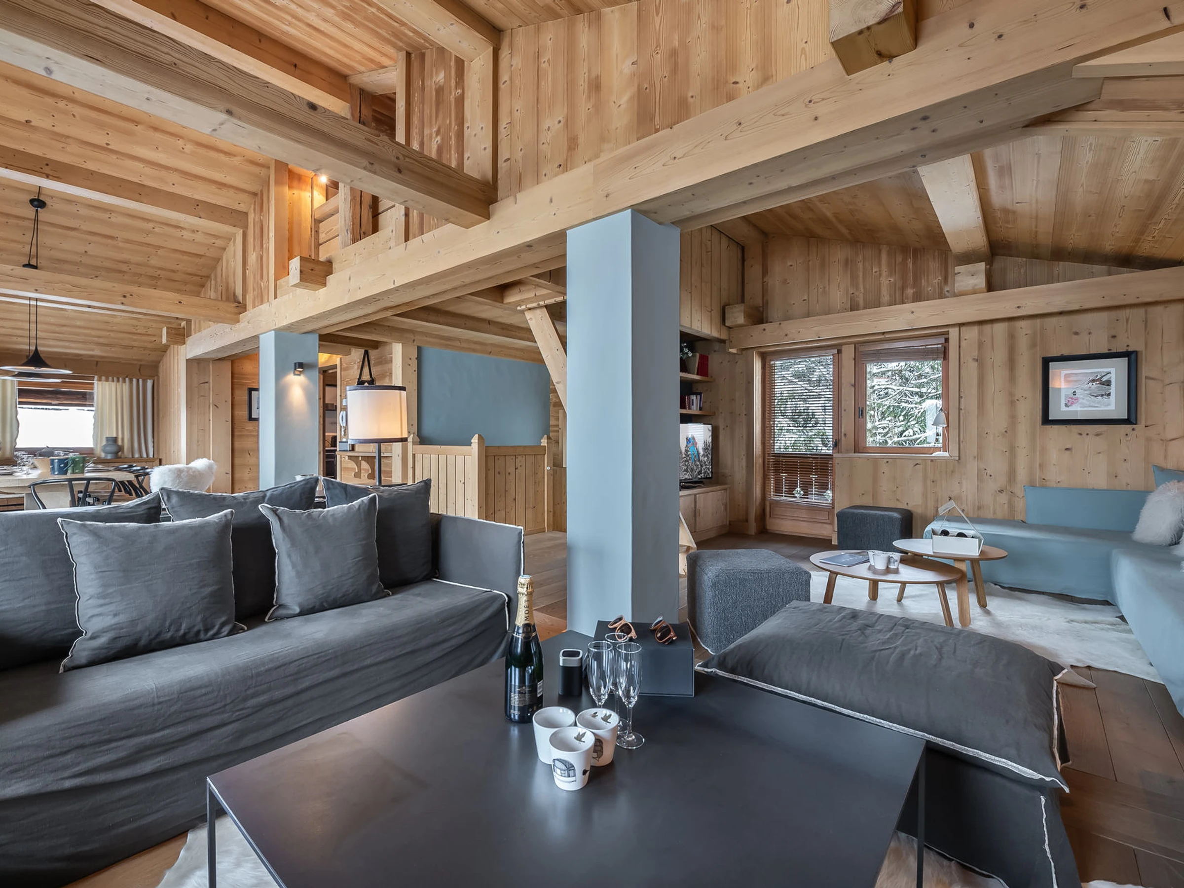 The chalet Reine des Prés, located near the Rochebrune cable car, is an ideal chalet for a family holiday in Megève. A bright living room offers different spaces, a cosy television room, a cocooning living room, and a beautiful dining area, close to the kitchen. Soft colours such as blue-grey in different shades, blend in perfectly with the light wood that makes up the chalet. The four double bedrooms and the mezzanine can accommodate 8 adults and 2 children. You will also appreciate the relaxation area with the indoor jacuzzi and the sauna.