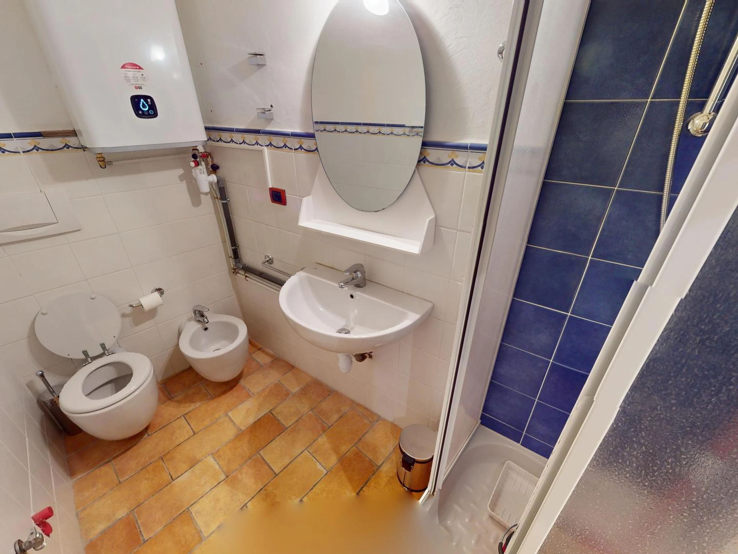 Bathroom with shower, WC, bidet and washing machine/dryer.