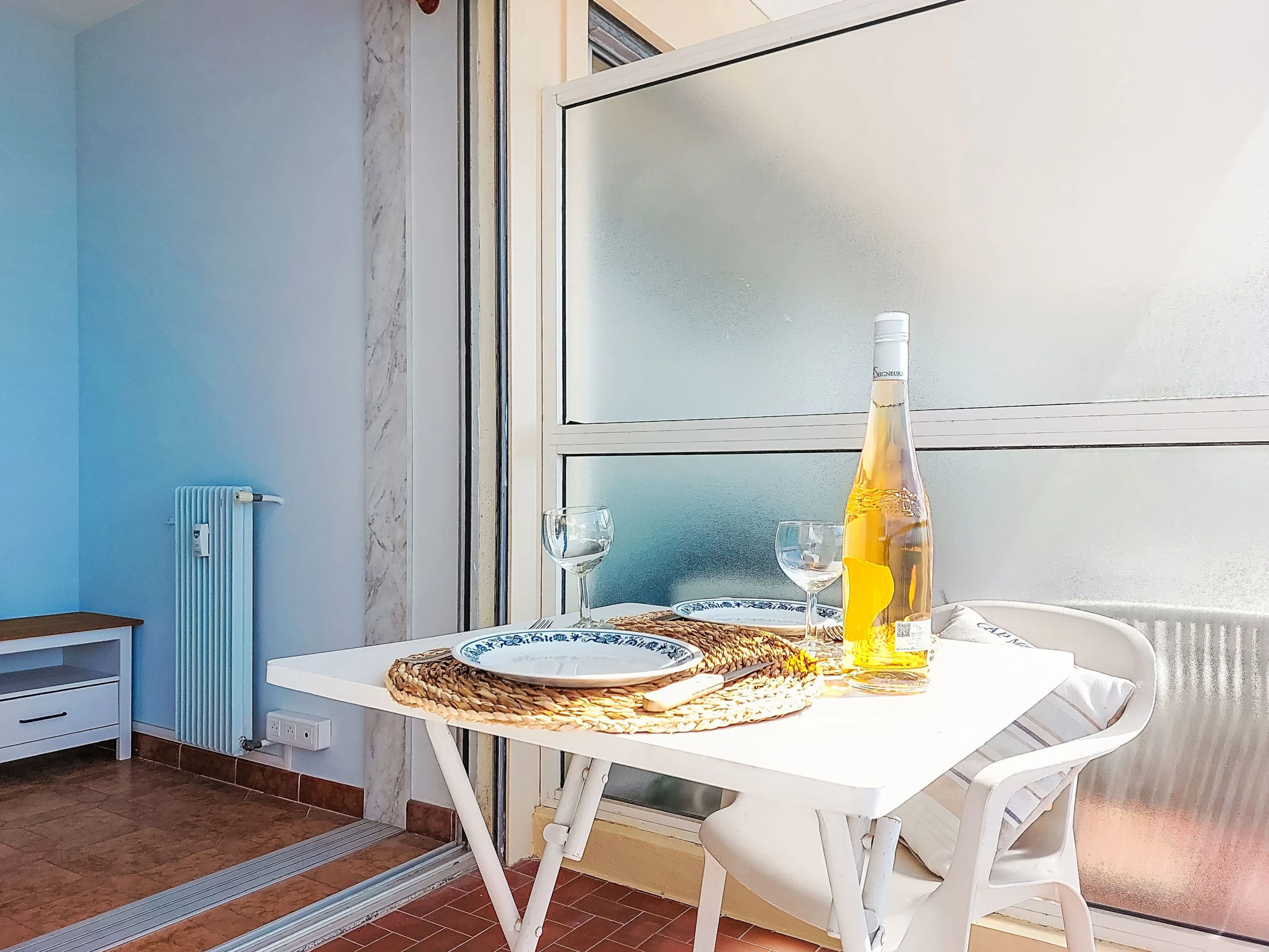 1-room studio 21 m2 on 4th floor, south facing position. Simple and practical furnishings: 1 small room with 1 french bed (140 cm, length 190 cm), fan. Small living room with flat screen. Exit to the terrace. Kitchenette (2 hot plates, toaster, kettle, microwave, electric coffee machine). Shower/WC. Heating. Terrace 8 m2, south facing position. Terrace furniture. Very beautiful view of the sea. Facilities: washing machine. Internet (WiFi, free). Parking space n 15 (1 car). Please note: parking space for small car only. Smoke alarm. Offer by a private individual according to Art. 155, IV of CGI. [hidden]