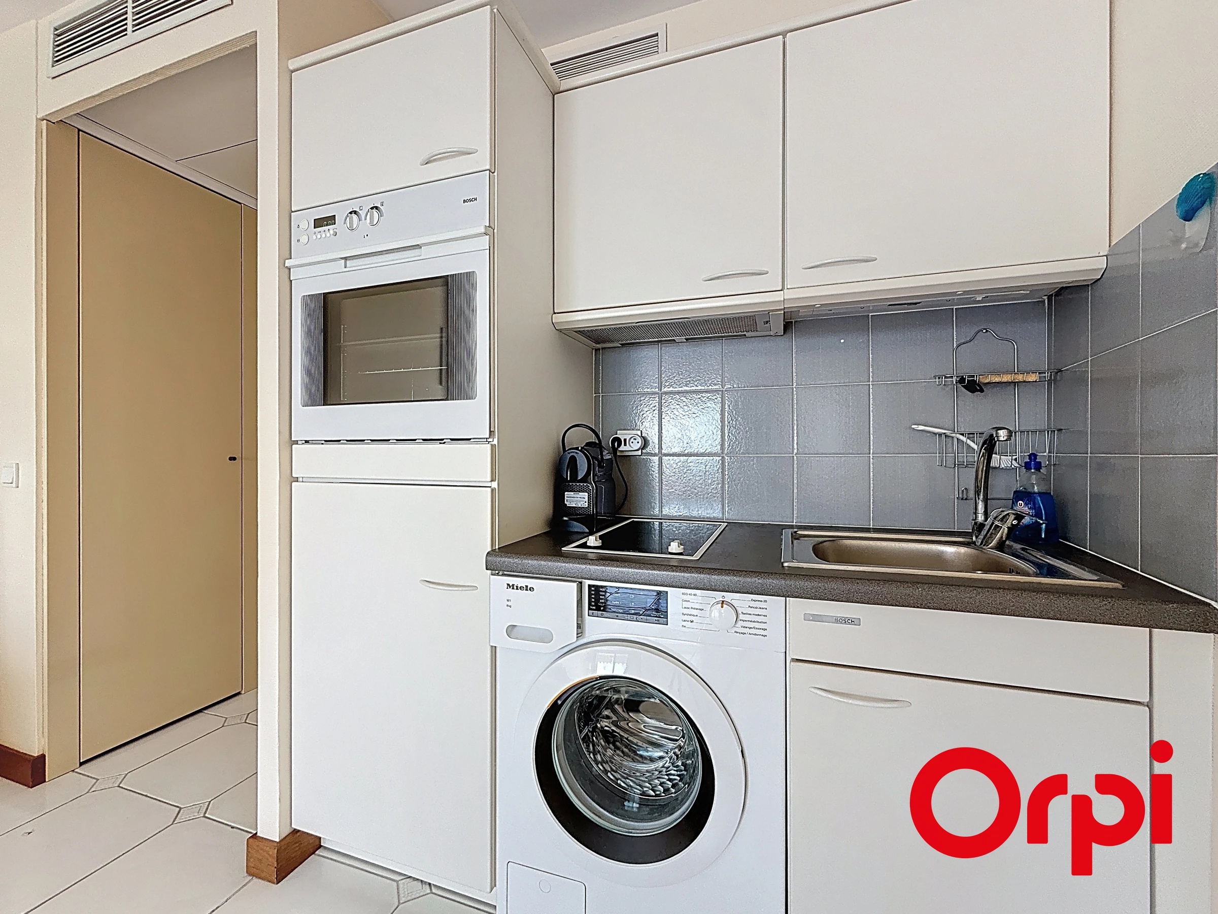 The fully equipped kitchen includes a stovetop, oven, refrigerator with freezer, coffee machine (capsules), and washing machine, ensuring a convenient and comfortable stay.