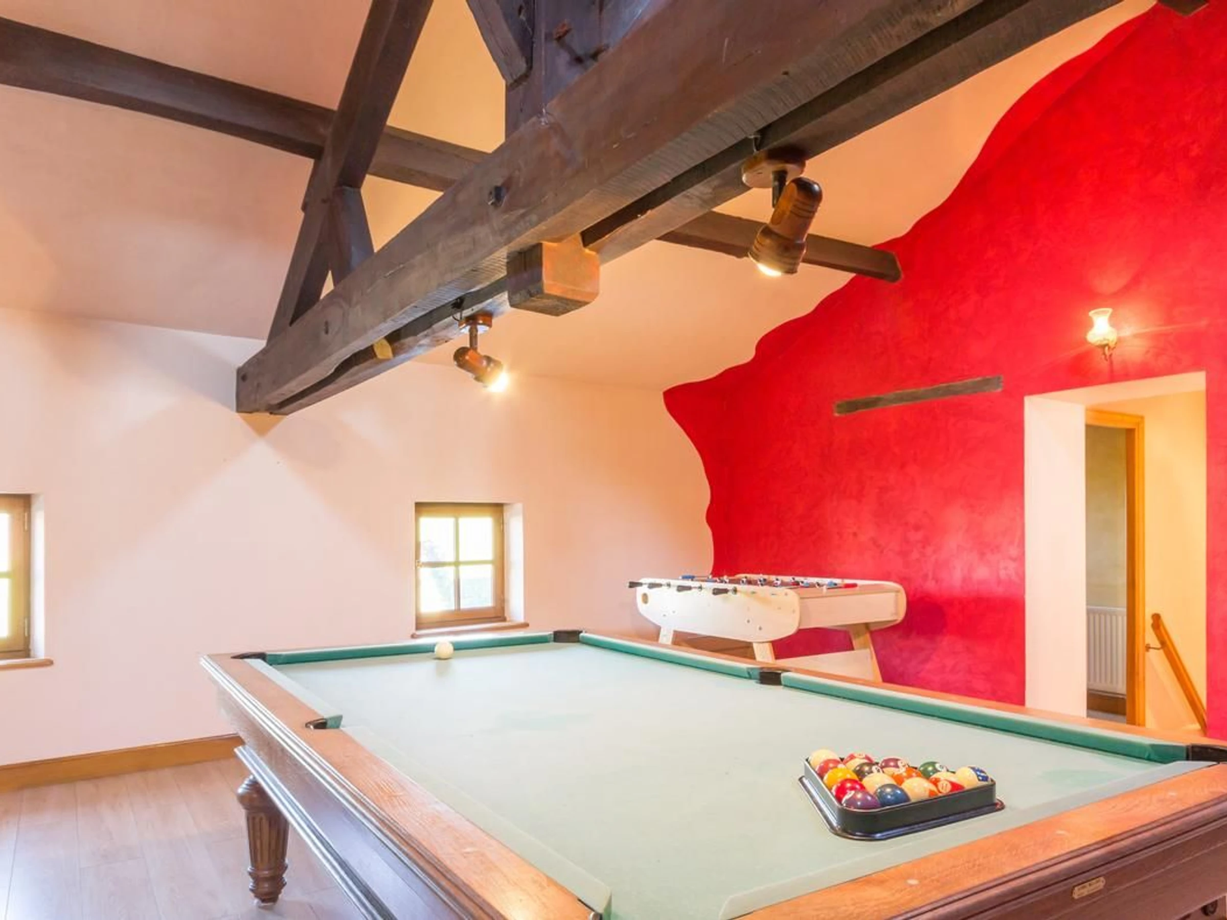 First floor: Two bedrooms, each with a double bed, one with a shower room. Large recreation room with billiards table. Separate toilet. Second floor: One family bedroom with a queen-size bed and two single beds.
