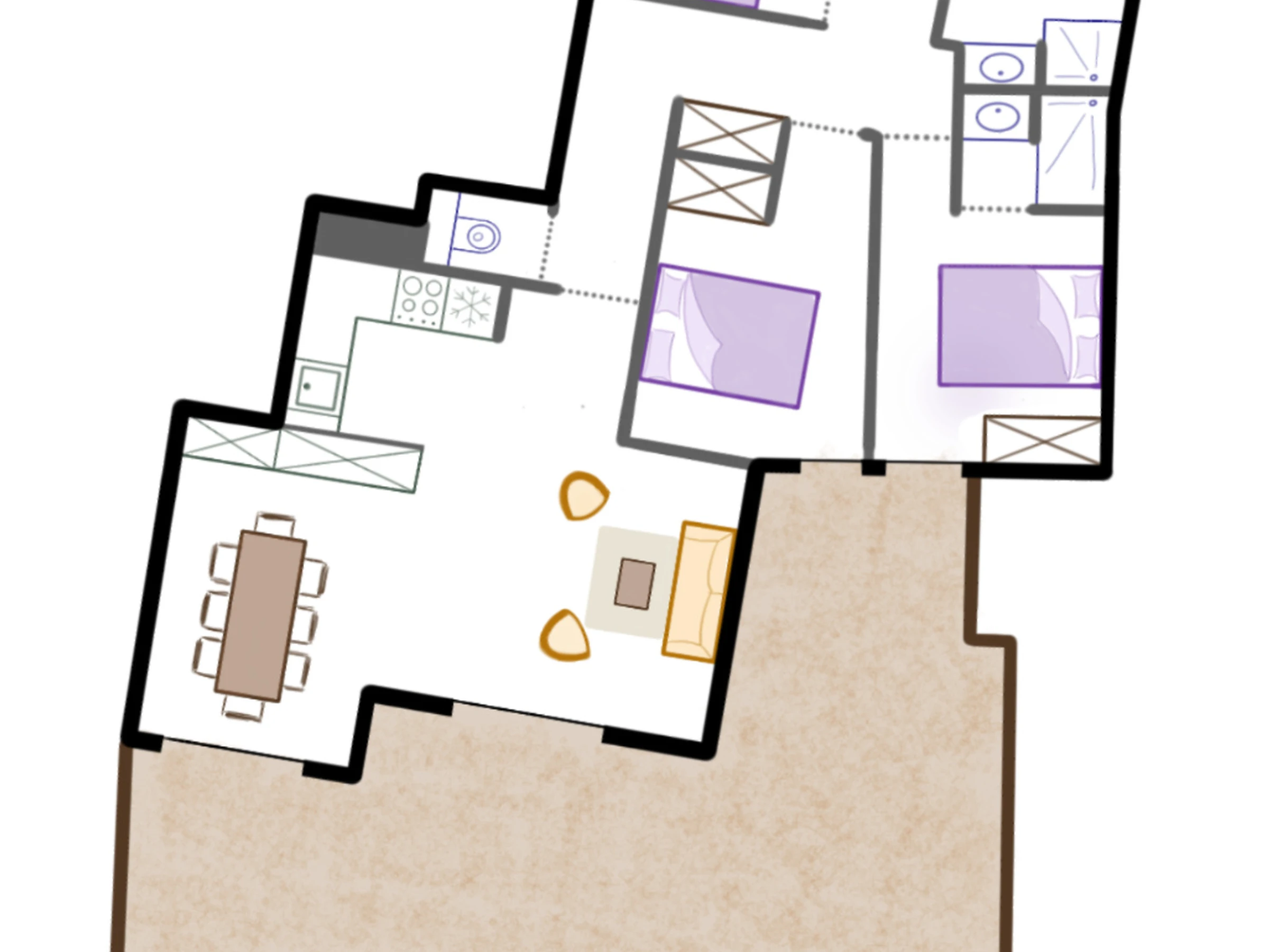 For your skiing or summer holiday in the french Alps in the heart of prestigious Meribel, book this beautiful 3/4 room apartment with a west facing terrasse and a nice view on the mountains. This luxury 73sq-m apartment that can accomodate up to 6 guests is located on the ground-floor of the residence, in the heart of the resort and about 2 minutes walk from the escalator next to the tourist office.