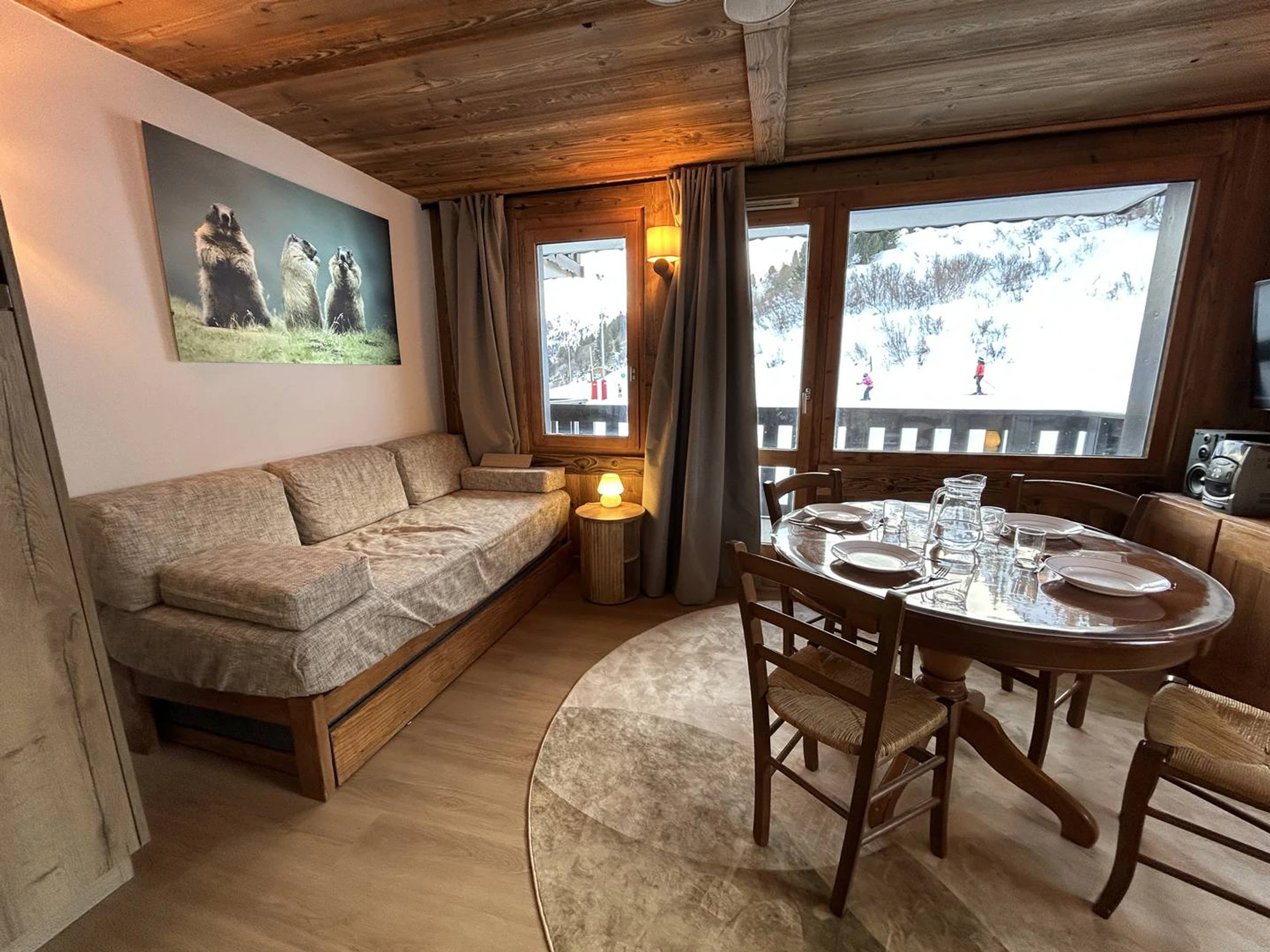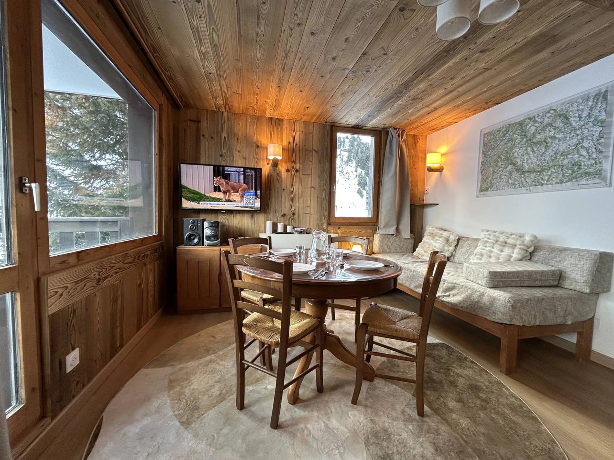 In the living room there are 2 sofa beds and a trundle bed. TV, Radio with Bluetooth. Super Nintendo. A bedroom with one double bed. Fully equipped kitchen with electric stove, oven, microwave, dishwasher and refrigerator. Bathroom and separate wc. Balcony. Ski locker in the residence. Private garage. Free wifi.