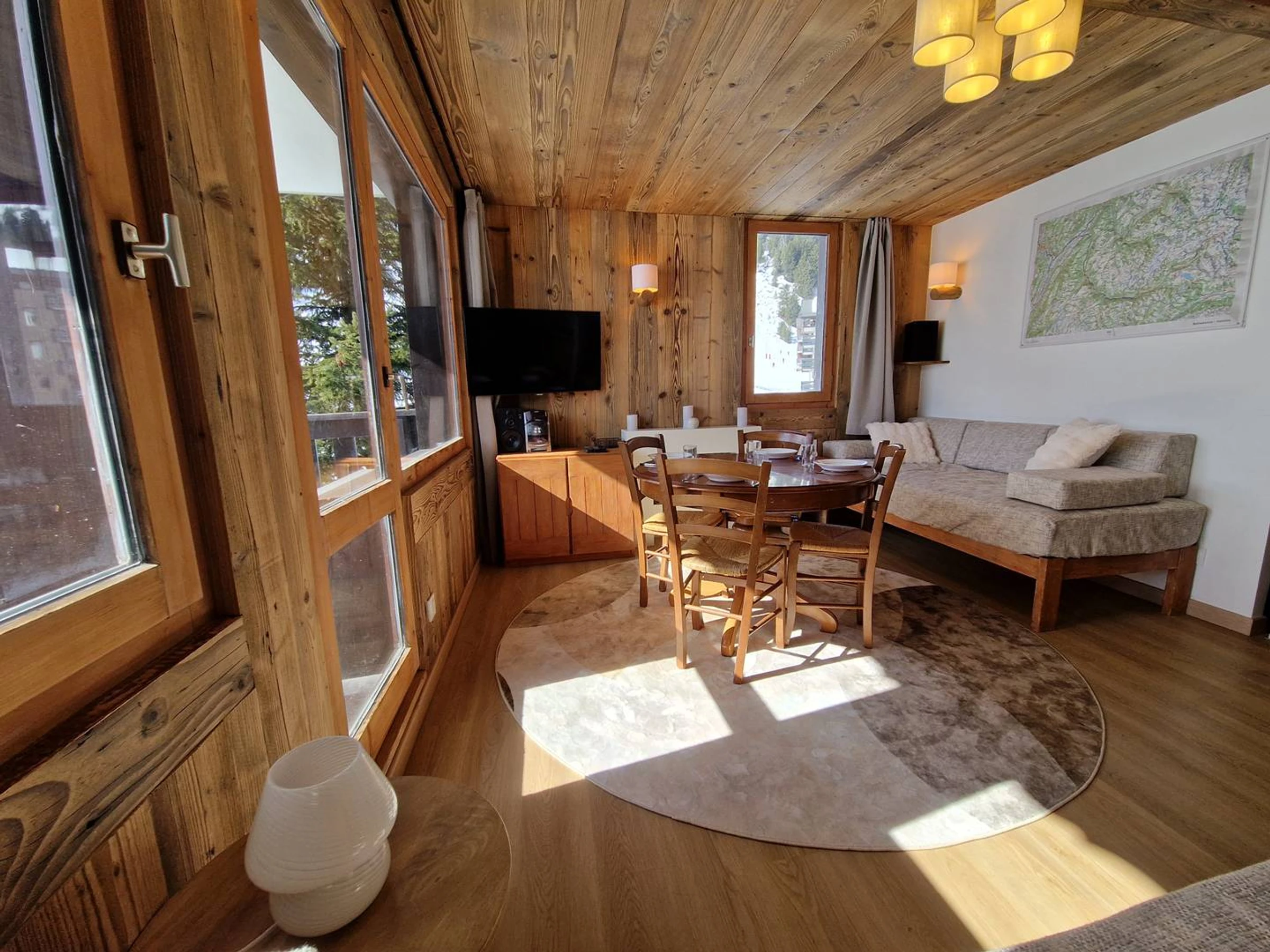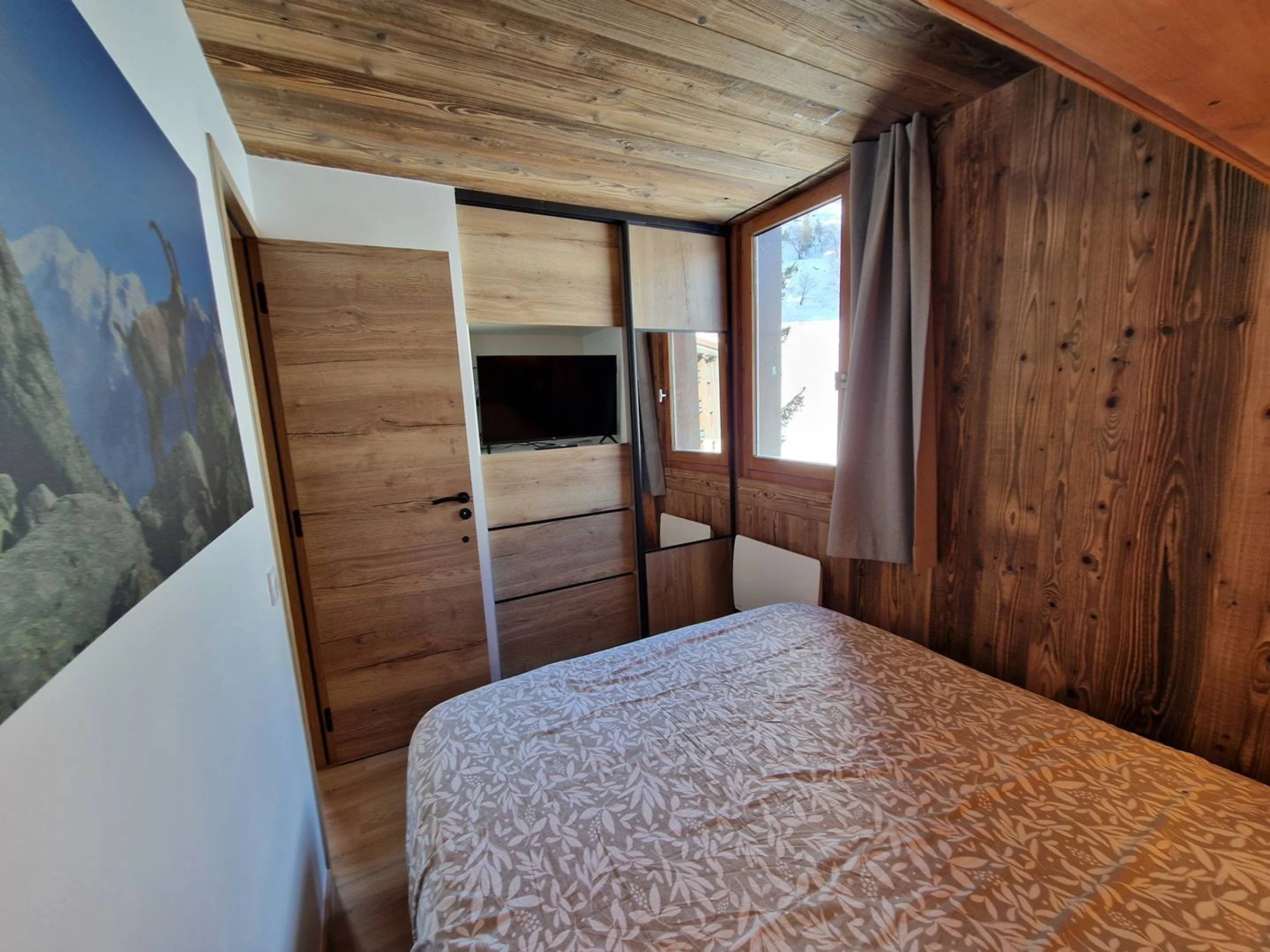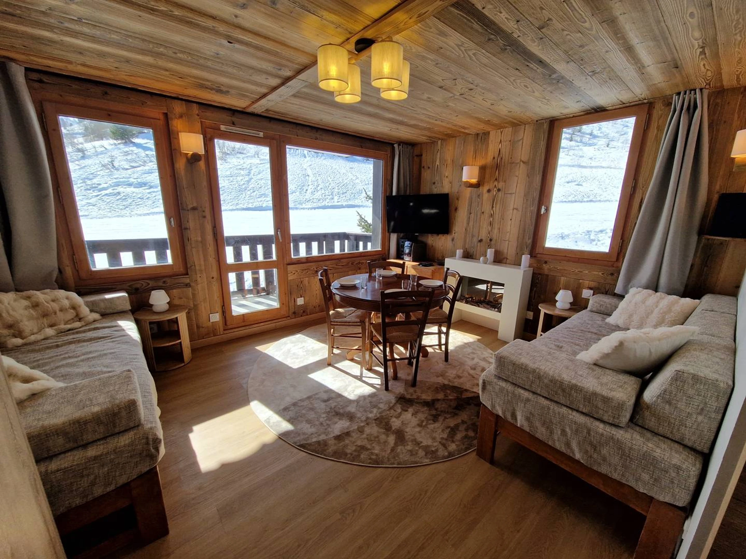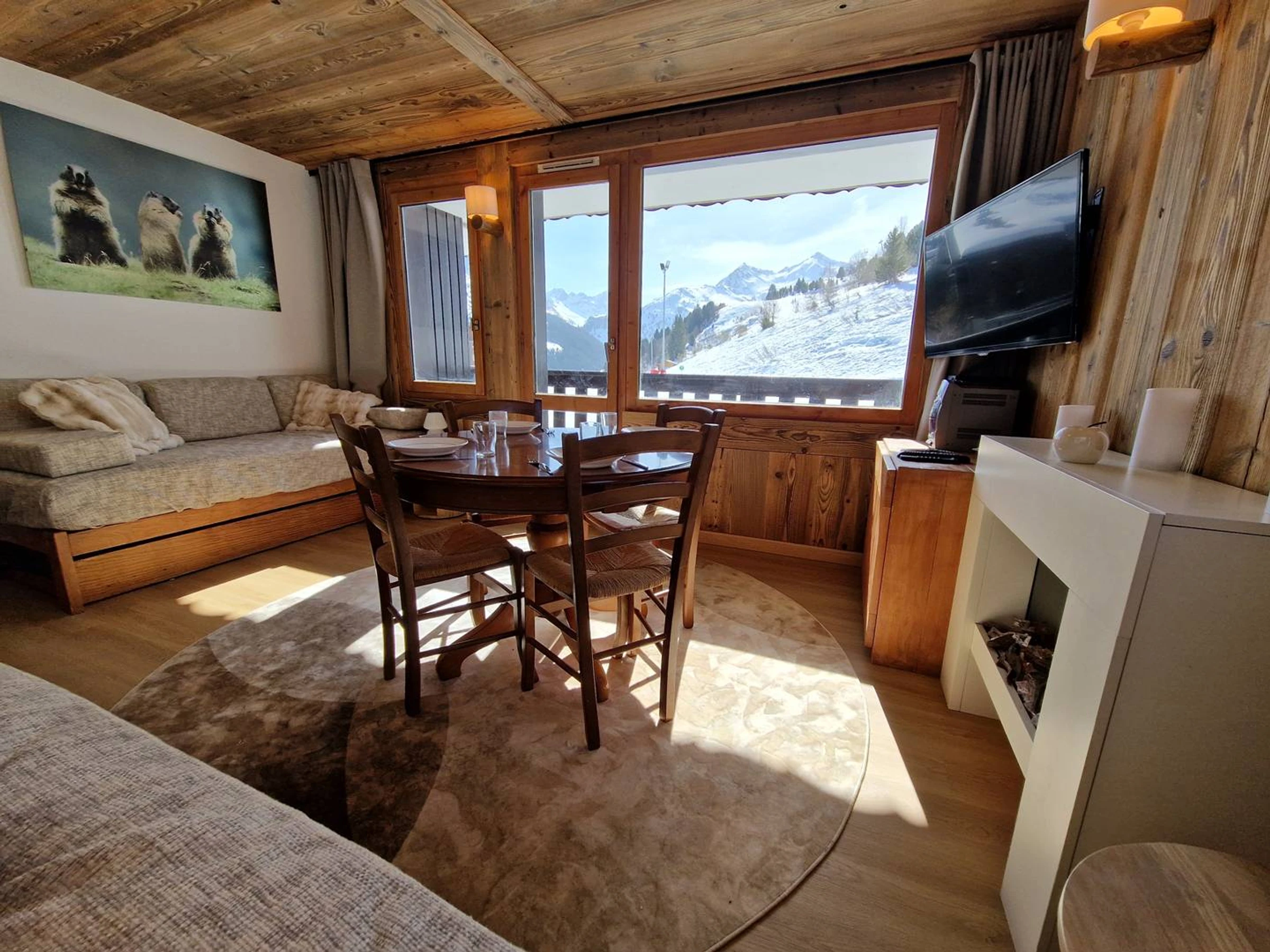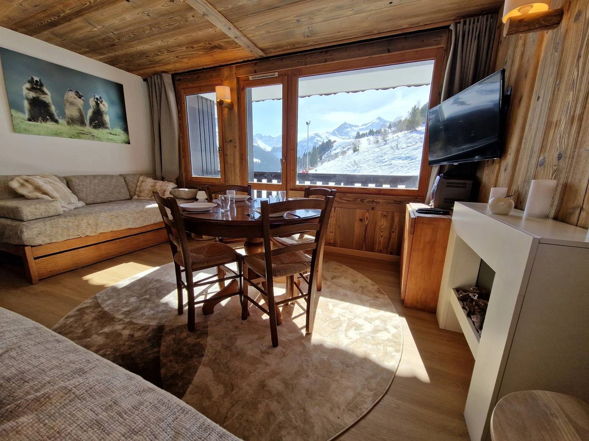Living room with two sofa beds (90×200), electric fireplace, television, and Hi-Fi system (CD, cassette, radio, Bluetooth).Bedroom with a double bed (160×200) and television. Fully equipped kitchen with induction cooktop, combination microwave oven, dishwasher, fridge-freezer, kettle, coffee maker, and toaster. Bathroom and separate WC. South-facing balcony. Ski locker in the residence. Apartment located on the 2nd floor (no elevator). Non-smoking apartment. Private fibre Wi-Fi included.
