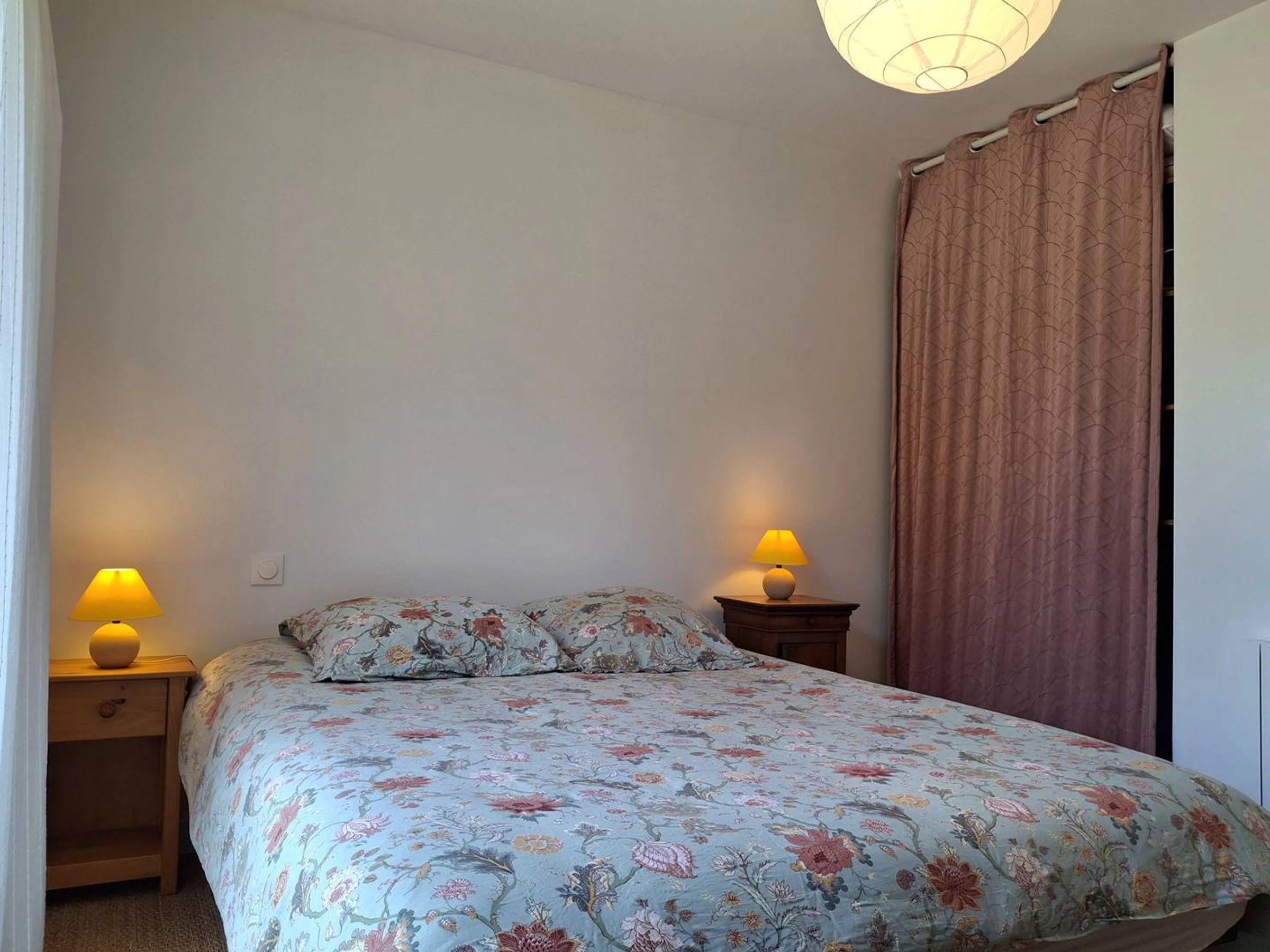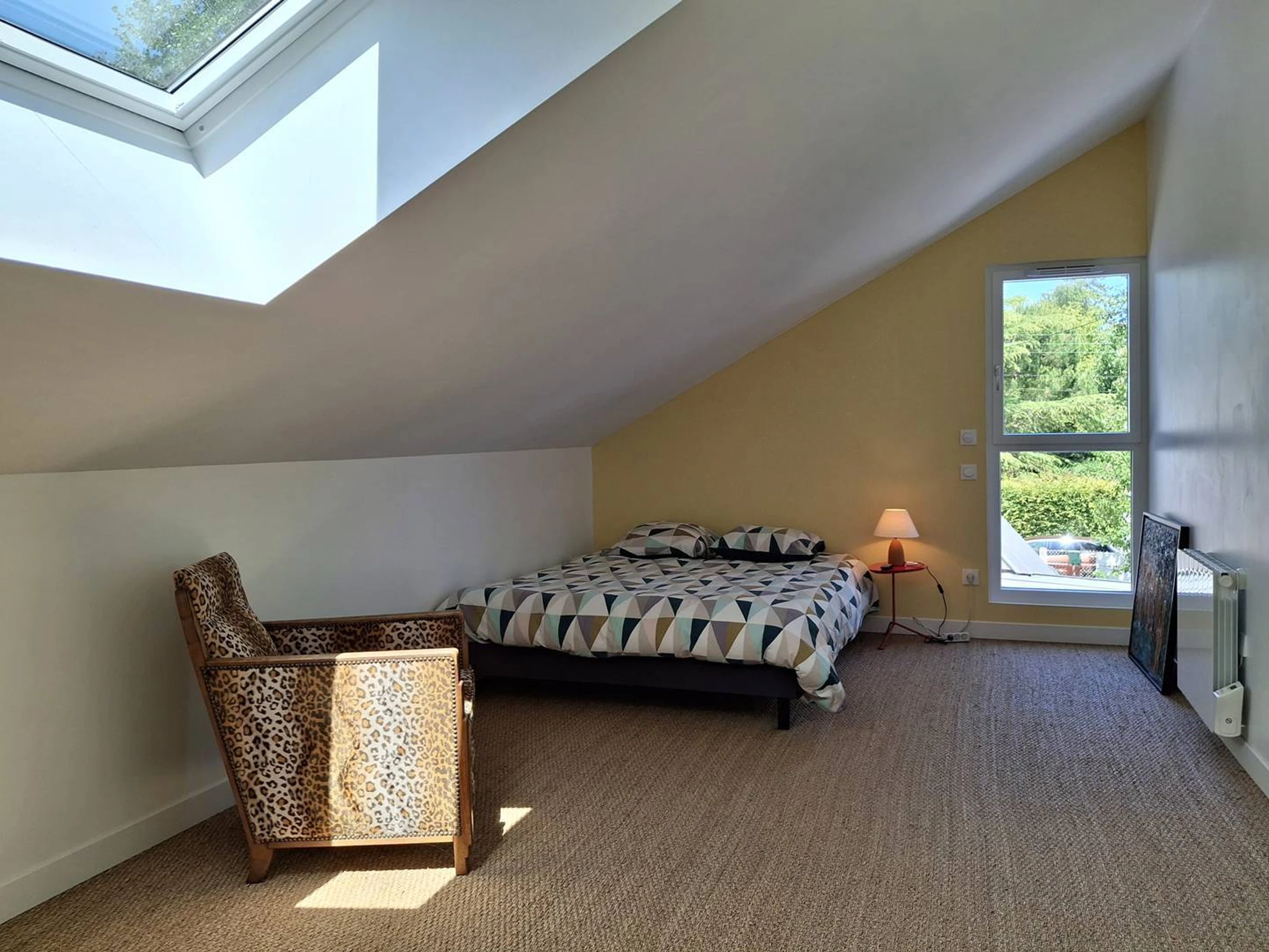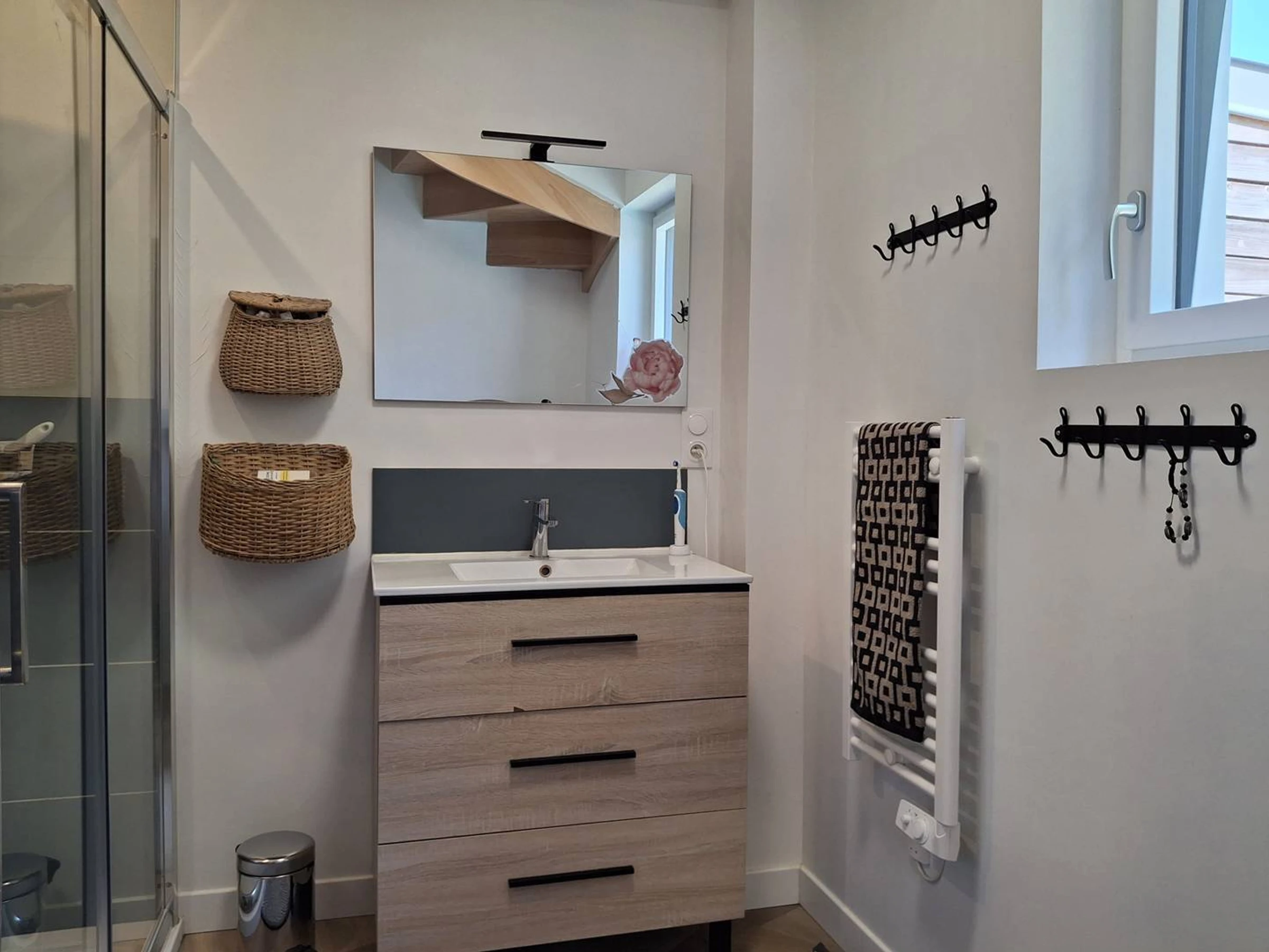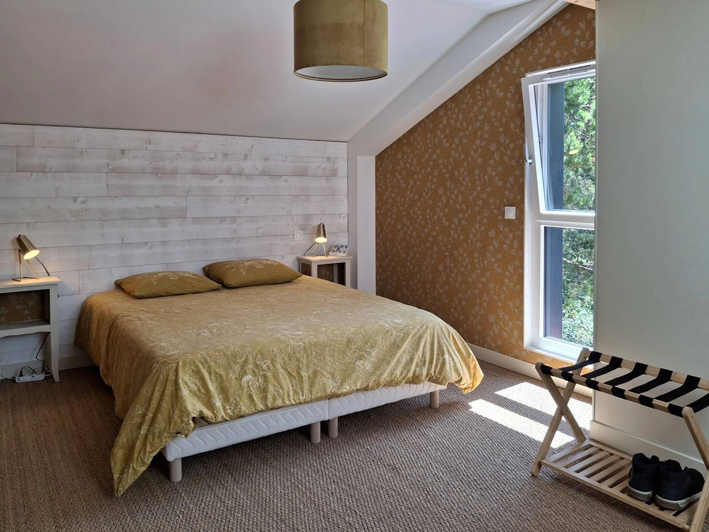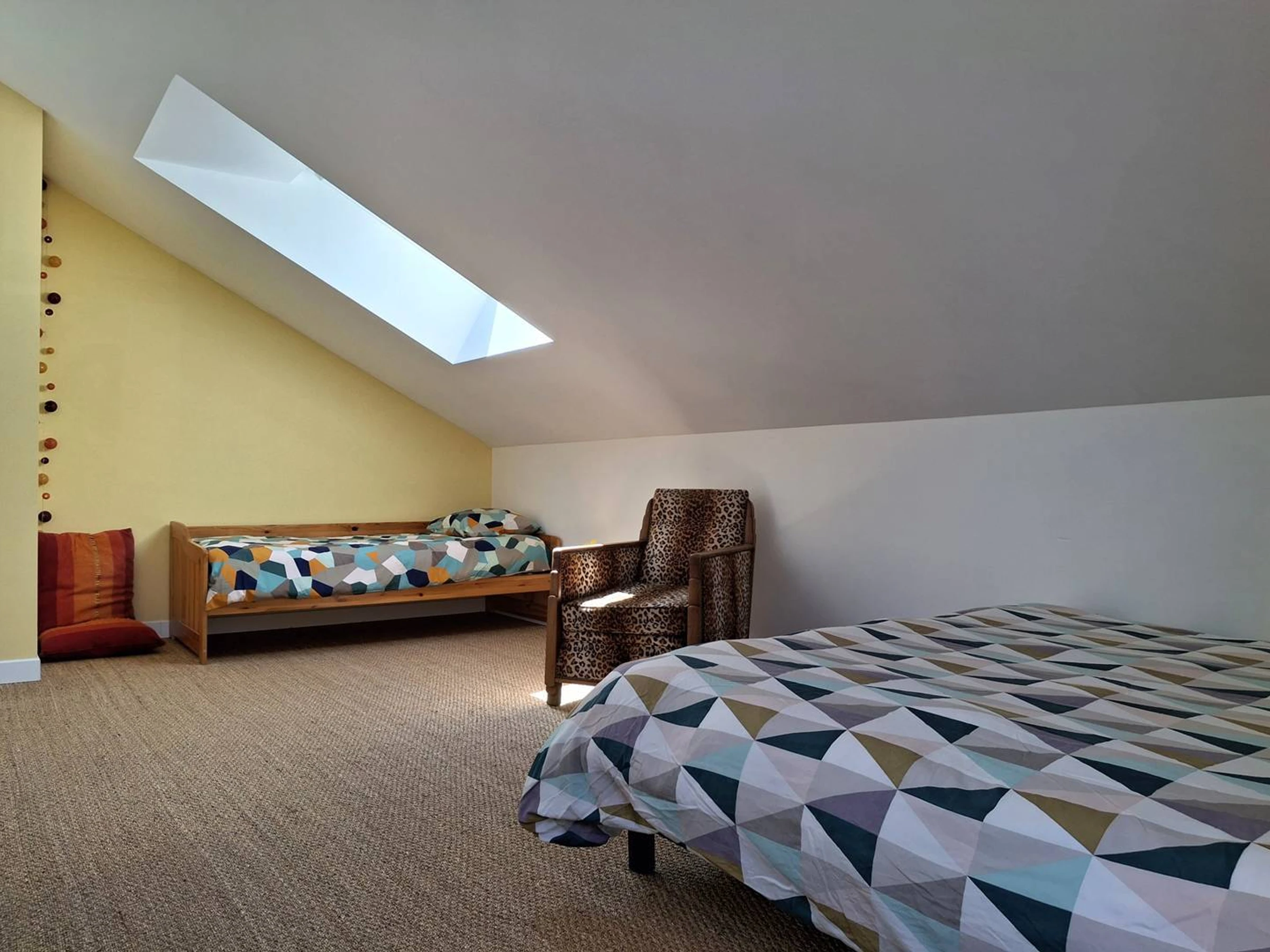 Puis, on grimpe à l’étage (sans chaussures, s’il vous plaît – le sol est en jonc de mer !), pour découvrir un petit bureau parfait pour télétravailler, et deux grandes chambres. L’une offre un lit Queen Size, l’autre un lit double (140x190) ainsi qu’un lit simple. Une salle de bain avec baignoire et WC complète cet étage cosy.