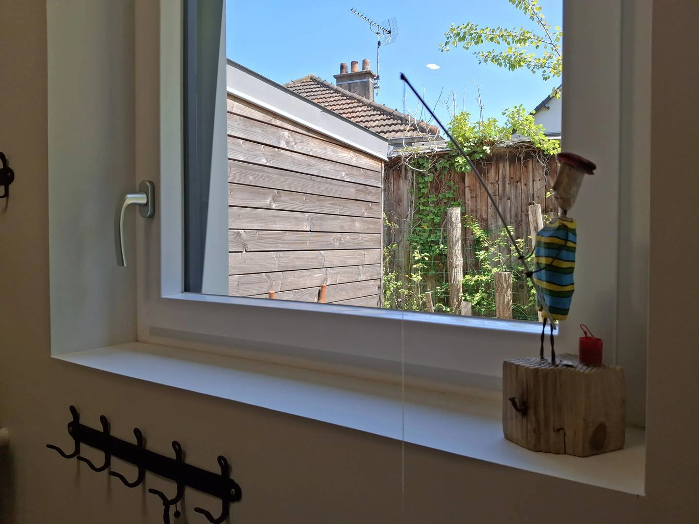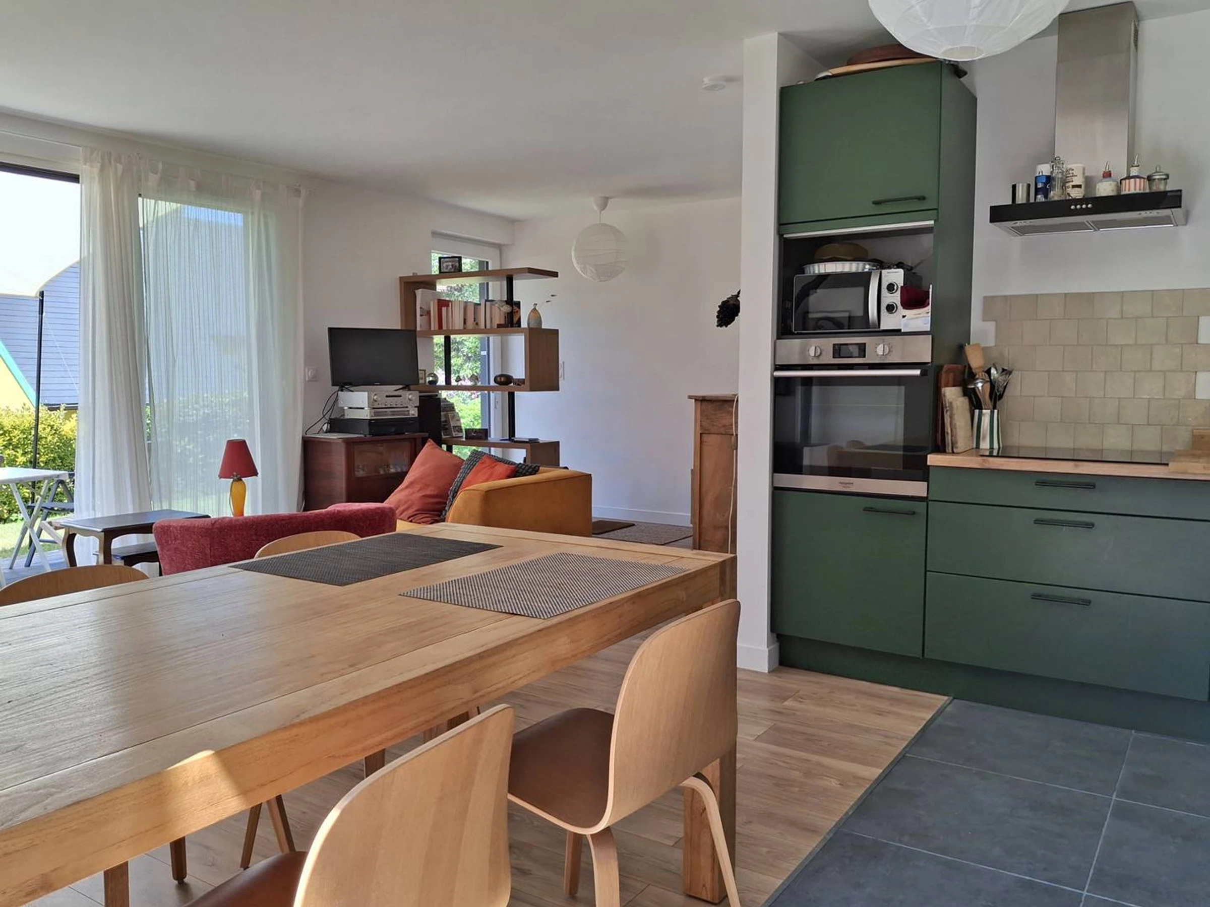 La cuisine ouverte, moderne et bien équipée (four, plaques vitrocéramiques, lave-vaisselle, bouilloire, réfrigérateur…), invite à préparer de bons repas. Une grande table attend vos petits-déjeuners au soleil et vos dîners partagés. Depuis la cuisine, on passe facilement à l’extérieur, sur une terrasse en cours de rénovation (mais tout à fait utilisable), équipée d’un salon de jardin et d’un parasol.