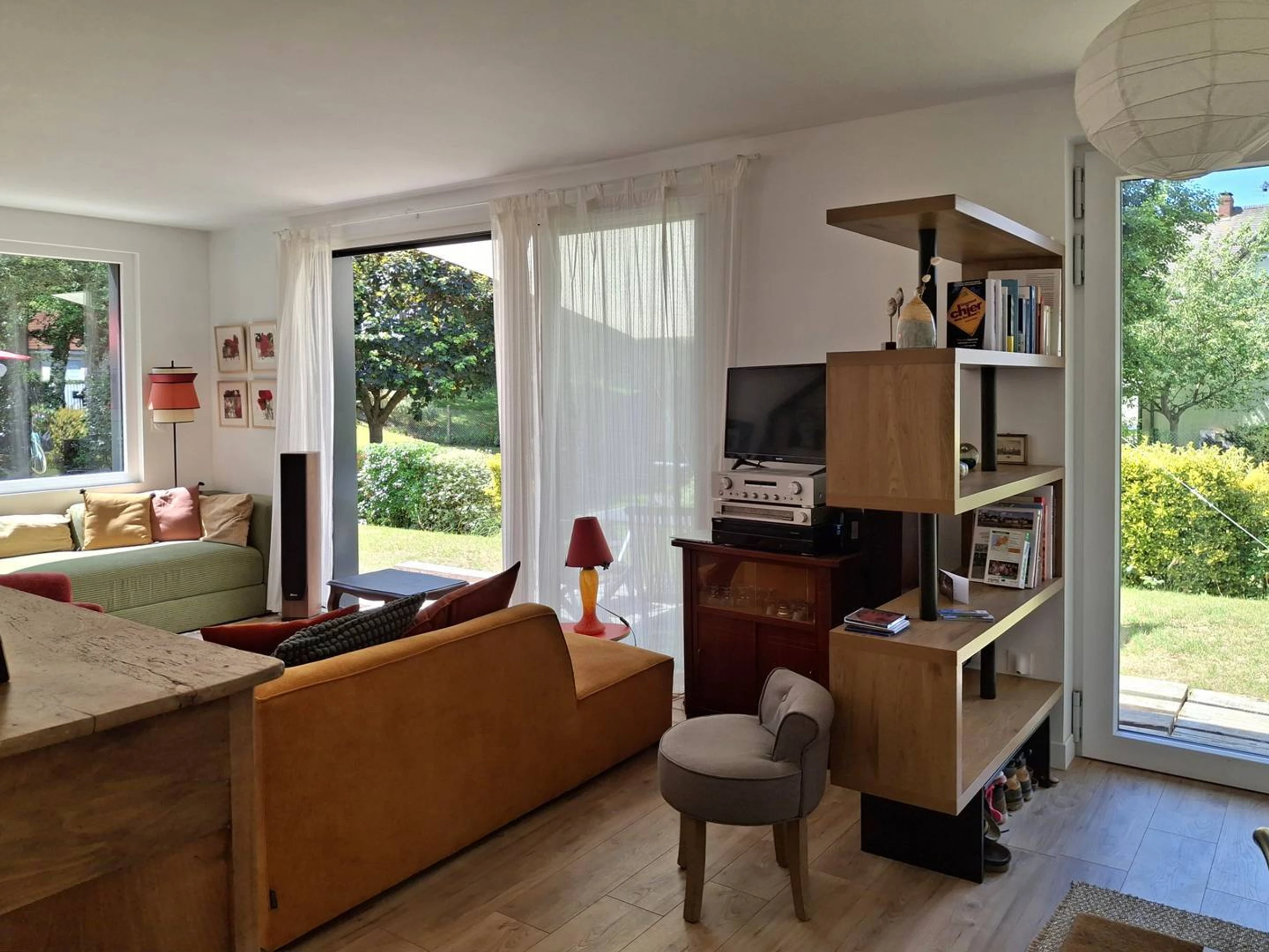 Dès l’entrée, on sent que l’espace a été pensé pour vivre ensemble. La pièce de vie est baignée de lumière grâce aux grandes ouvertures sur le jardin. On s’y retrouve pour lire, discuter, écouter de la musique grâce à la chaîne hi-fi, ou regarder un film. Une télévision a d’ailleurs été ajoutée pour les soirées plus calmes ou pluvieuses.
