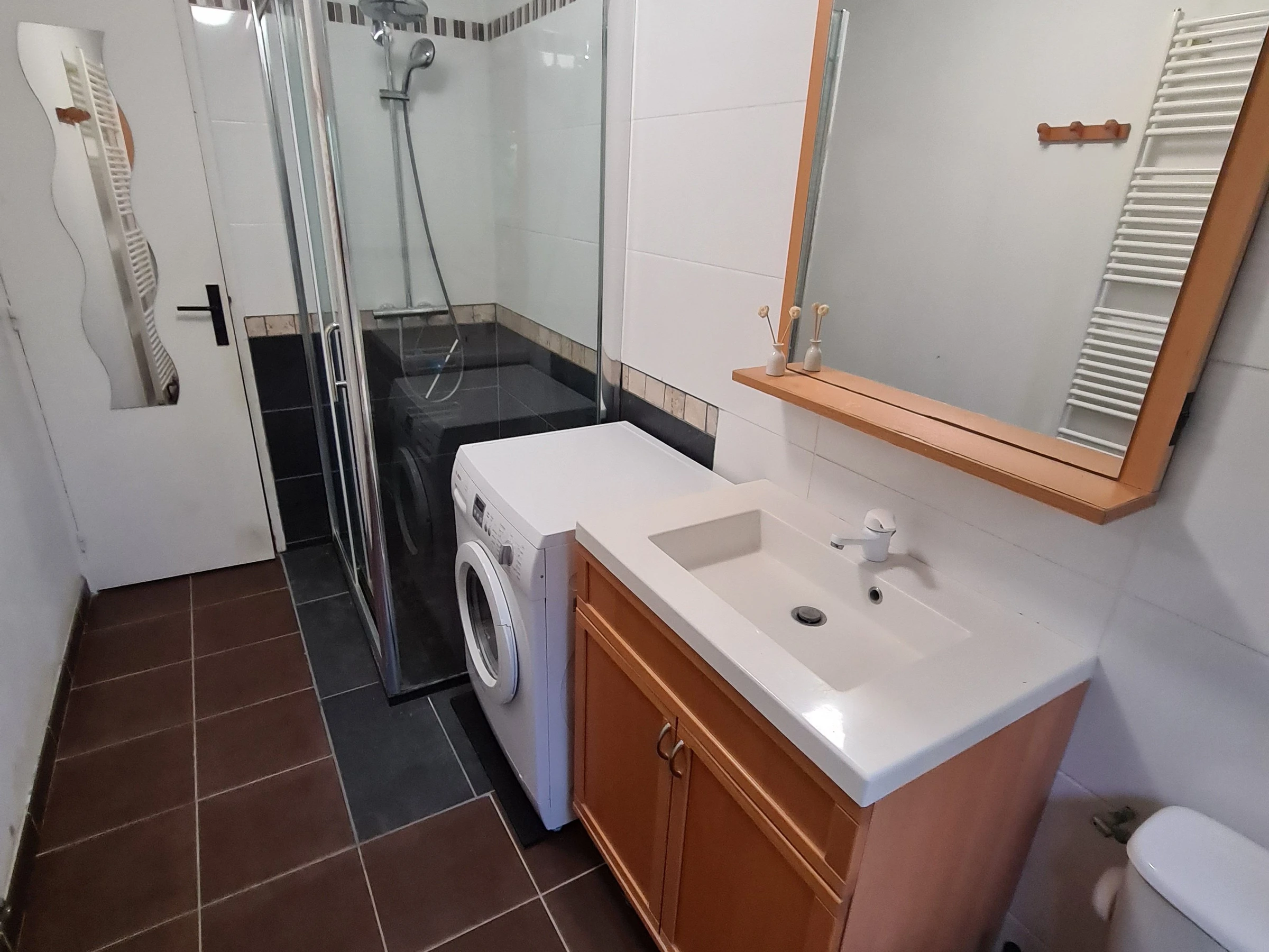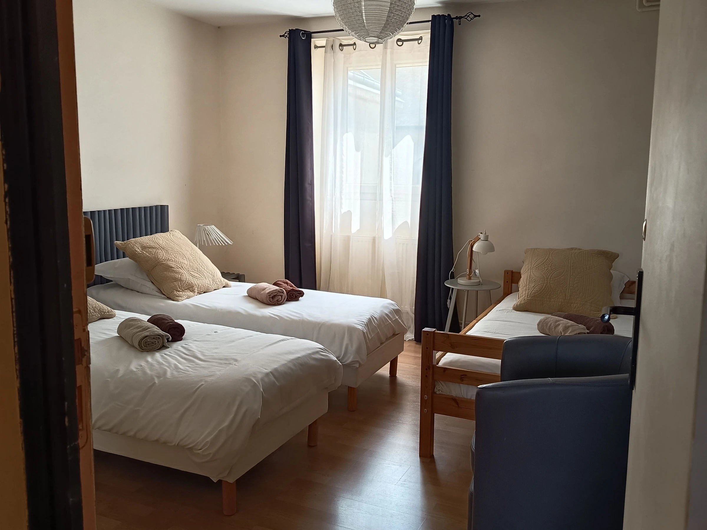 Upstairs, there is a bathroom (shower, sink, toilet, washing machine) and three bedrooms: two bedrooms with a 140 cm bed and one bedroom with a 90 cm bed and two 80 cm beds (which can be joined to form a 160 cm bed).