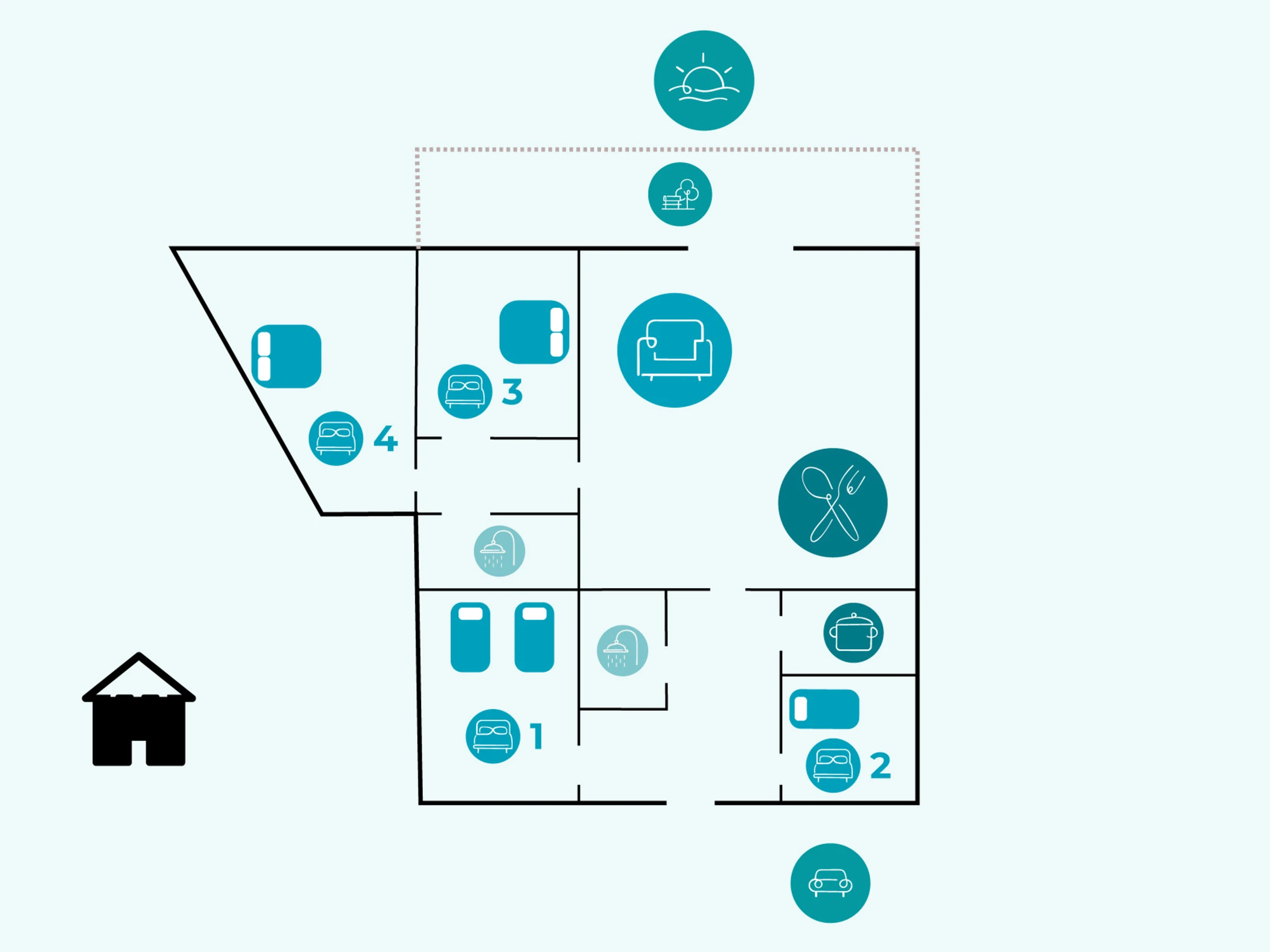 The living-dining room, decorated with a contemporary style, is the heart of the home. Here you can gather on cosy sofas or enjoy sea views from the dining table. From the living room you access two more bedrooms with double beds and a spacious bathroom with a shower between them, ideal for accommodating up to 7 people.