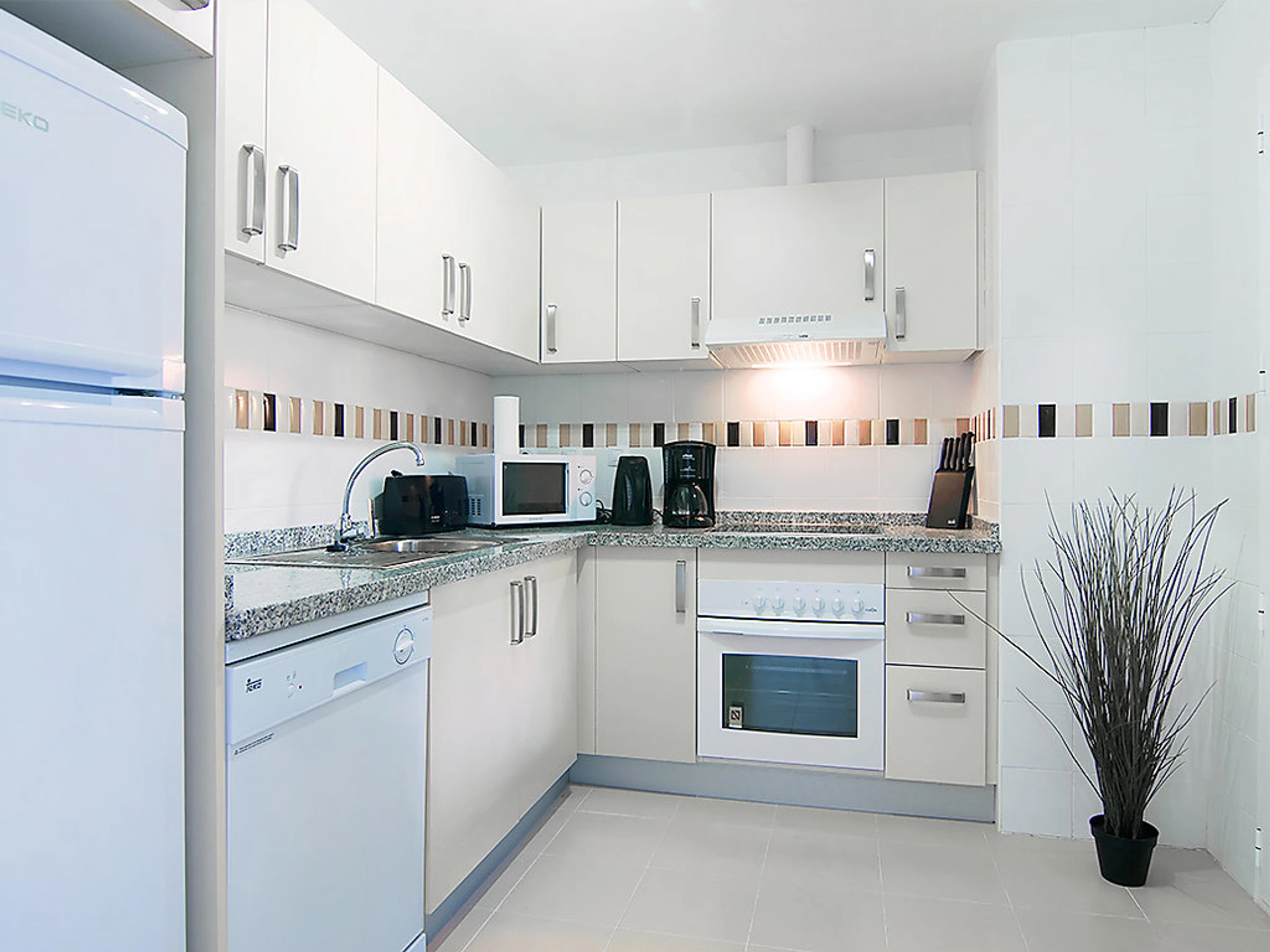 "Apartamentos la Mirada", 3-room apartment on the ground floor. Bright, modern and tasteful furnishings: living/dining room with 1 sofabed and satellite TV (flat screen), DVD and air conditioning. Exit to the balcony. 1 double bedroom with 2 beds. 1 double bedroom with 1 french bed. Kitchen (oven, dishwasher, 4 ceramic glass hob hotplates, microwave, freezer). Bath/bidet/WC, shower/WC. Balcony 20 m2. Balcony furniture. View of the swimming pool. Facilities: washing machine. Internet (WiFi, free). Suitable for families. Included: Final cleaning, Laundry (initial supply of bed linen and towels)