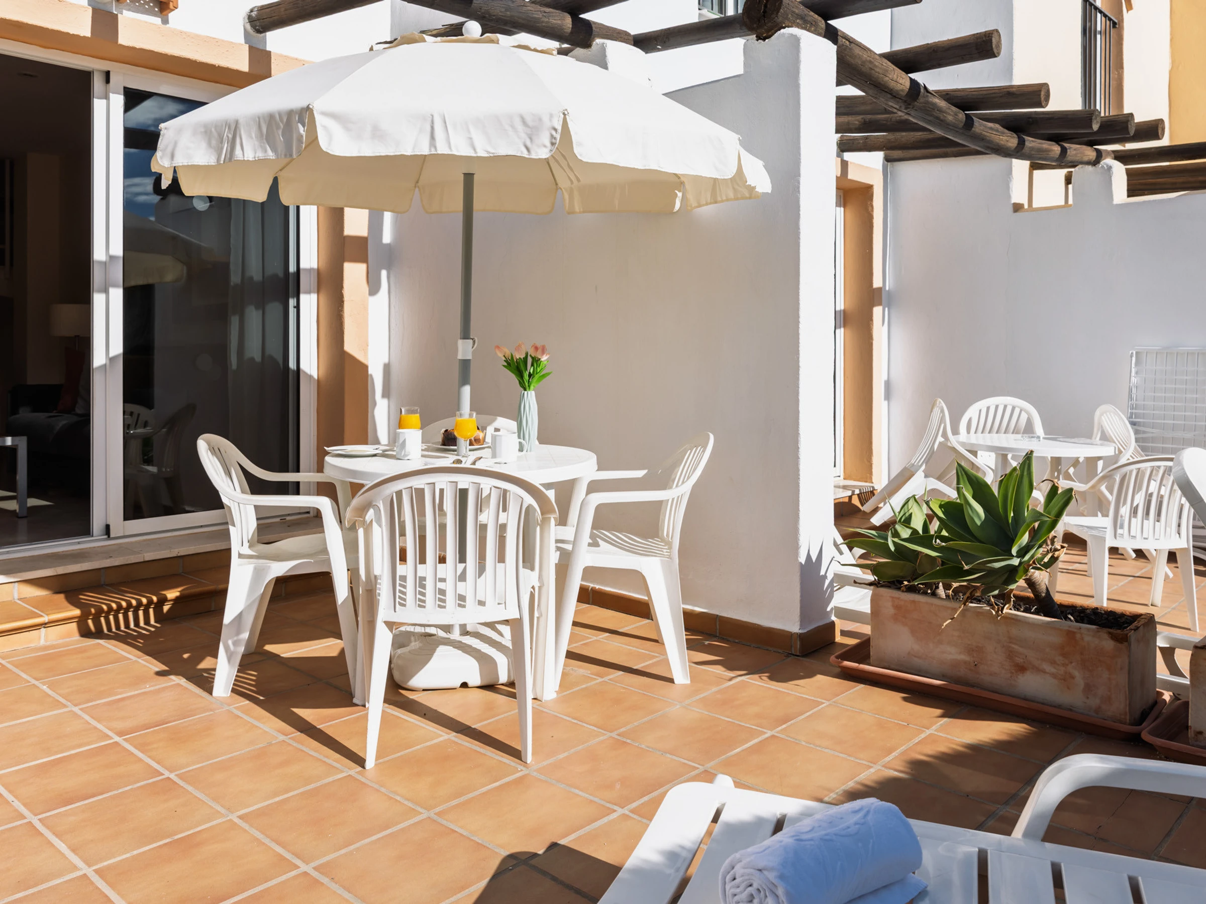 The southwest-facing terrace is perfect for enjoying afternoon sun and relaxed outdoor meals, offering a comfortable space to unwind while maintaining privacy within the residential surroundings.