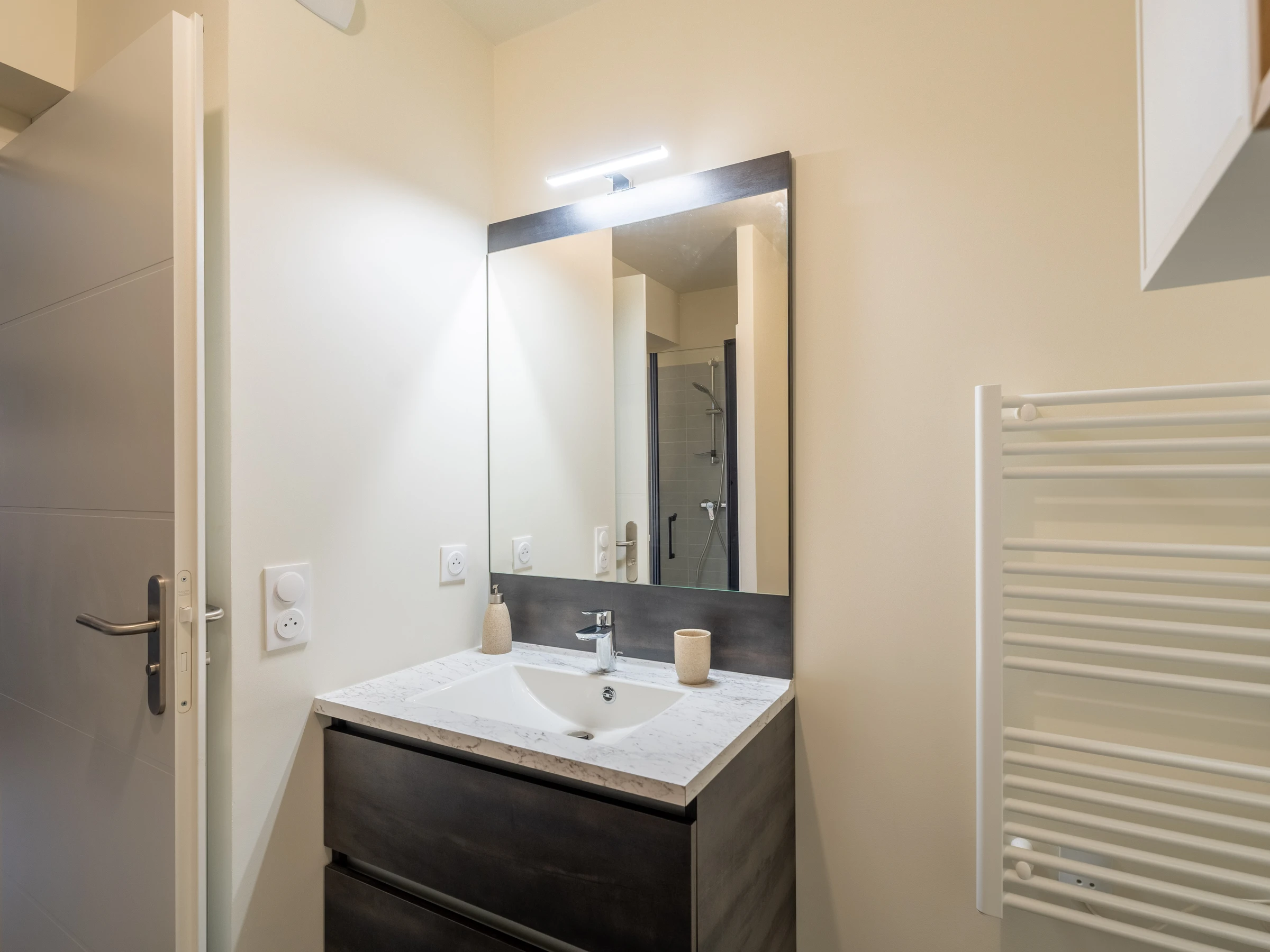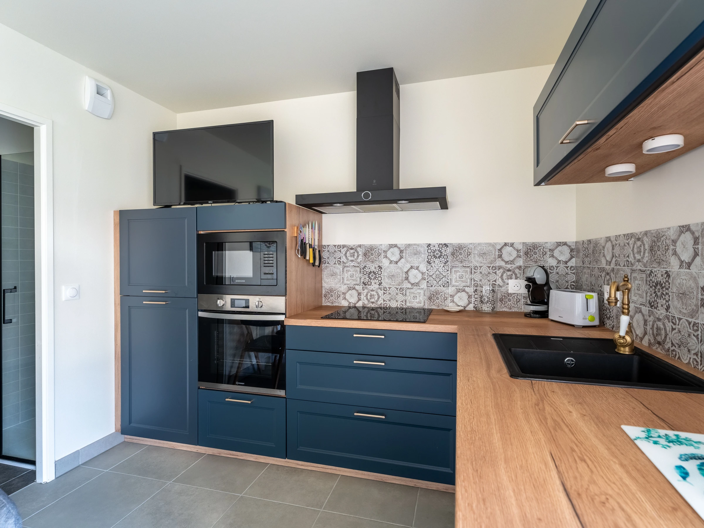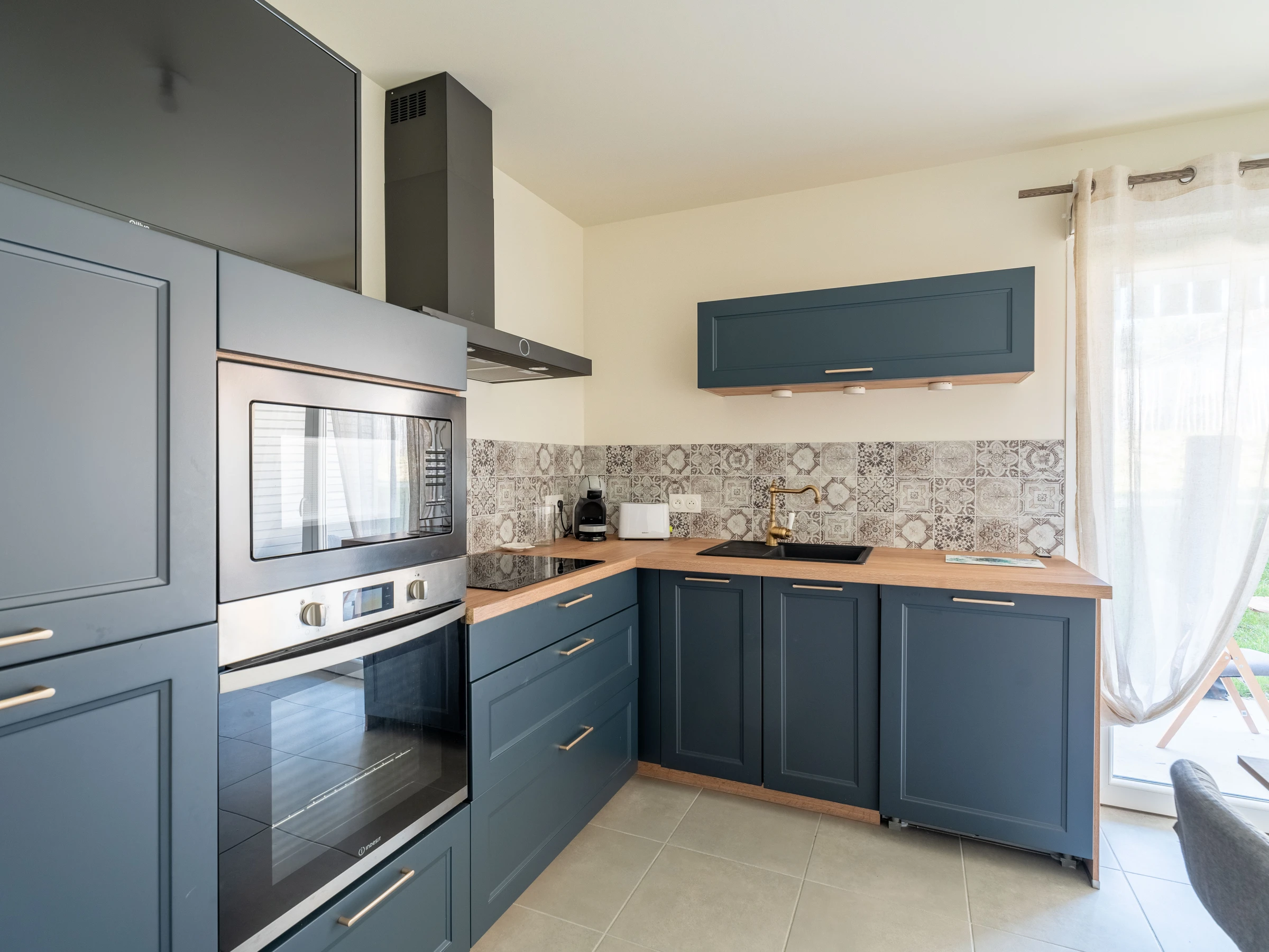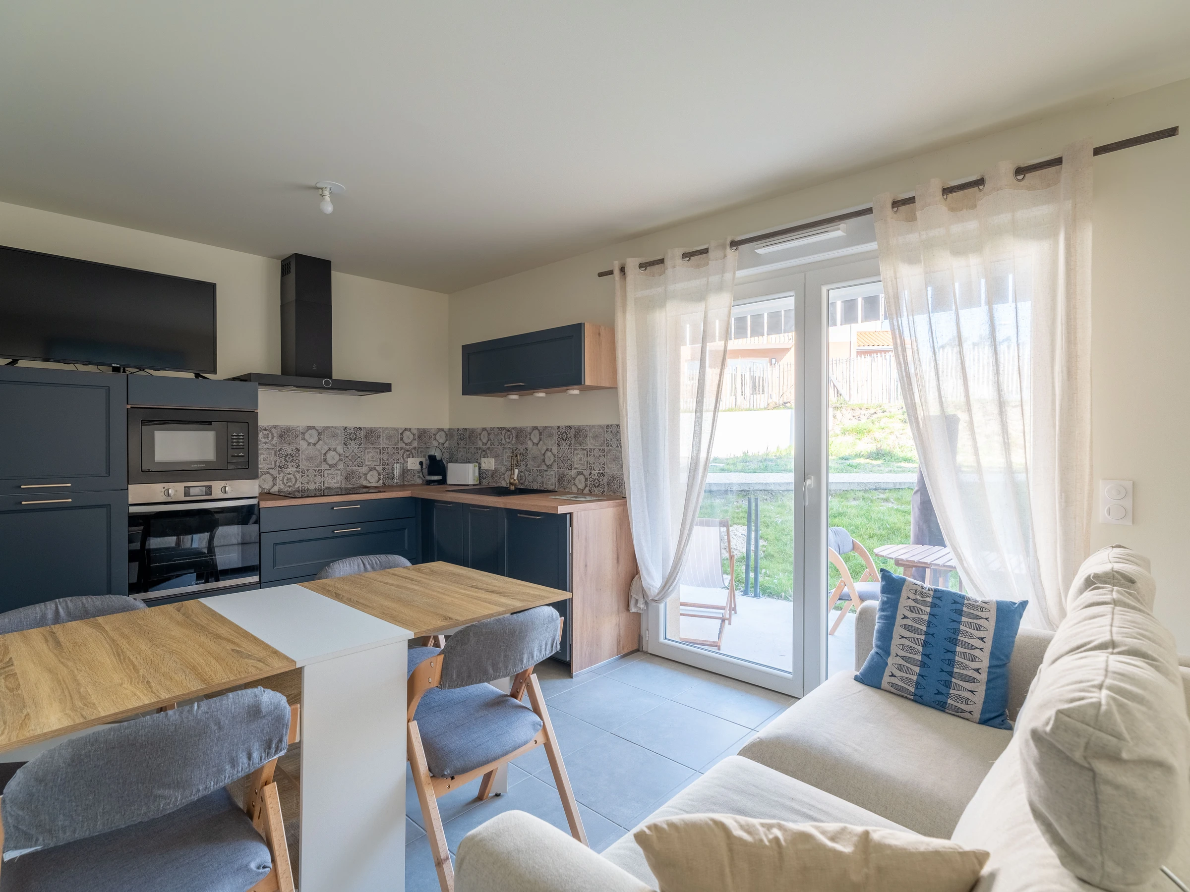 The apartment located on the ground floor, has a beautiful open living room with a sofa bed (2 additional beds) and a flat-screen TV for your moments of relaxation. The fully equipped kitchen includes a fridge/freezer, an oven, a microwave, an induction hob, a capsule coffee maker, a kettle and a toaster, offering you everything you need to cook with ease.