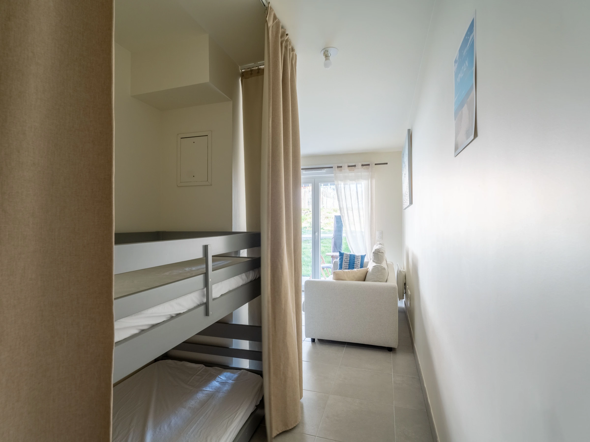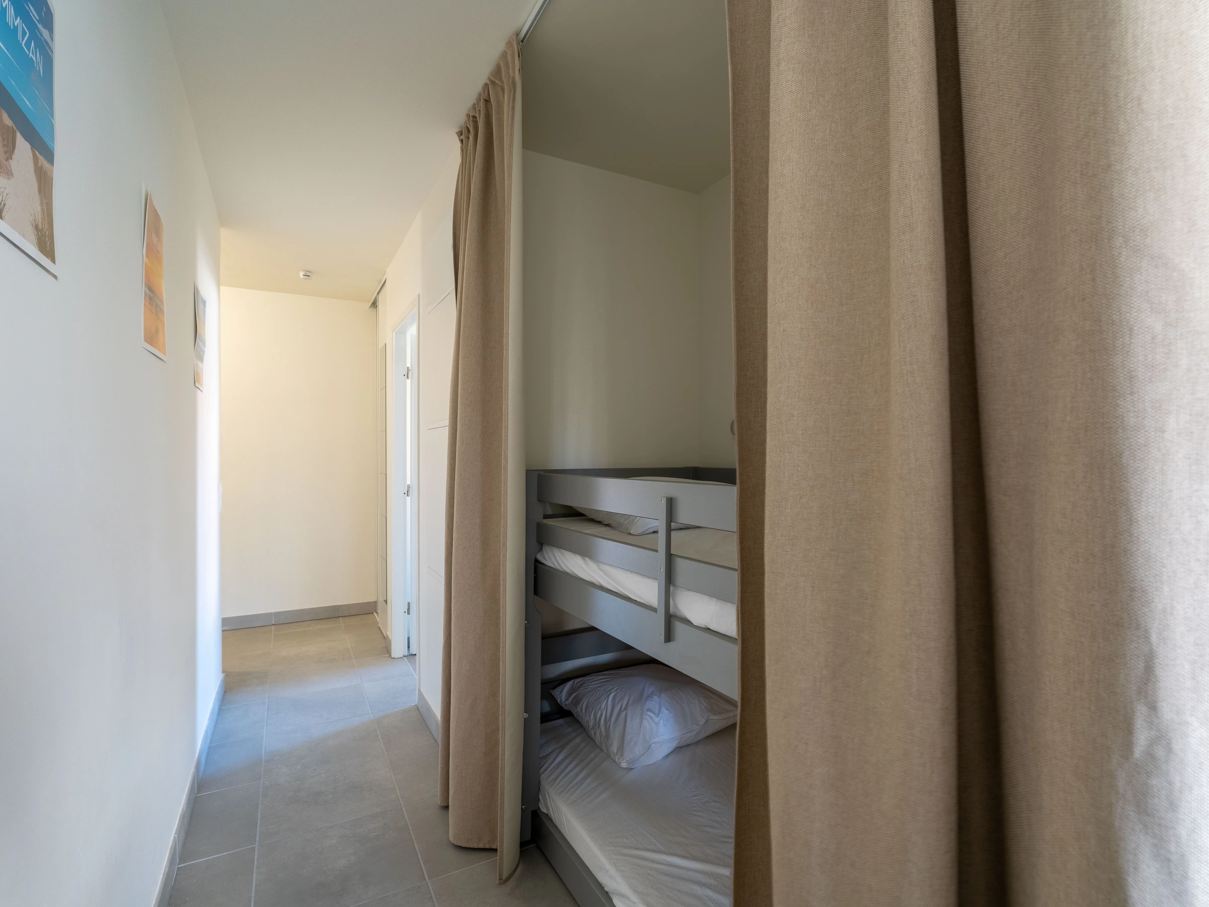 A hallway with 90 cm bunk beds (ideal for children or young adults) is fitted out and can be closed with curtains for more privacy. The bathroom is equipped with a washing machine, a hairdryer, and a separate toilet for more comfort.